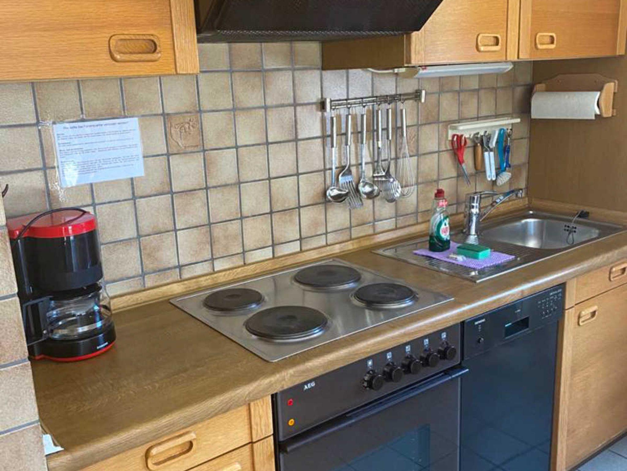 Die integrierte Küchenzeile ist mit Backofen, Kühlschrank und Geschirrspüler ausgestattet.