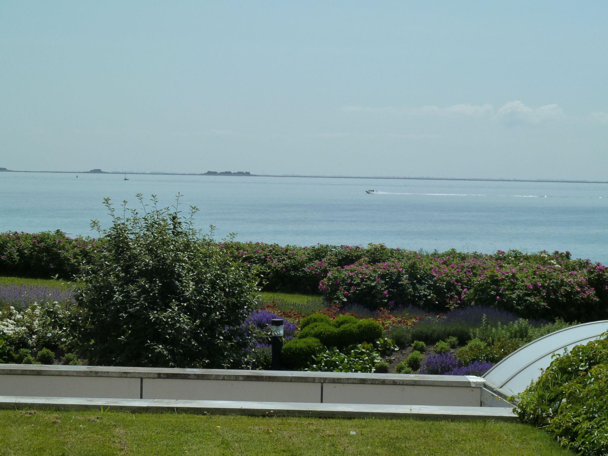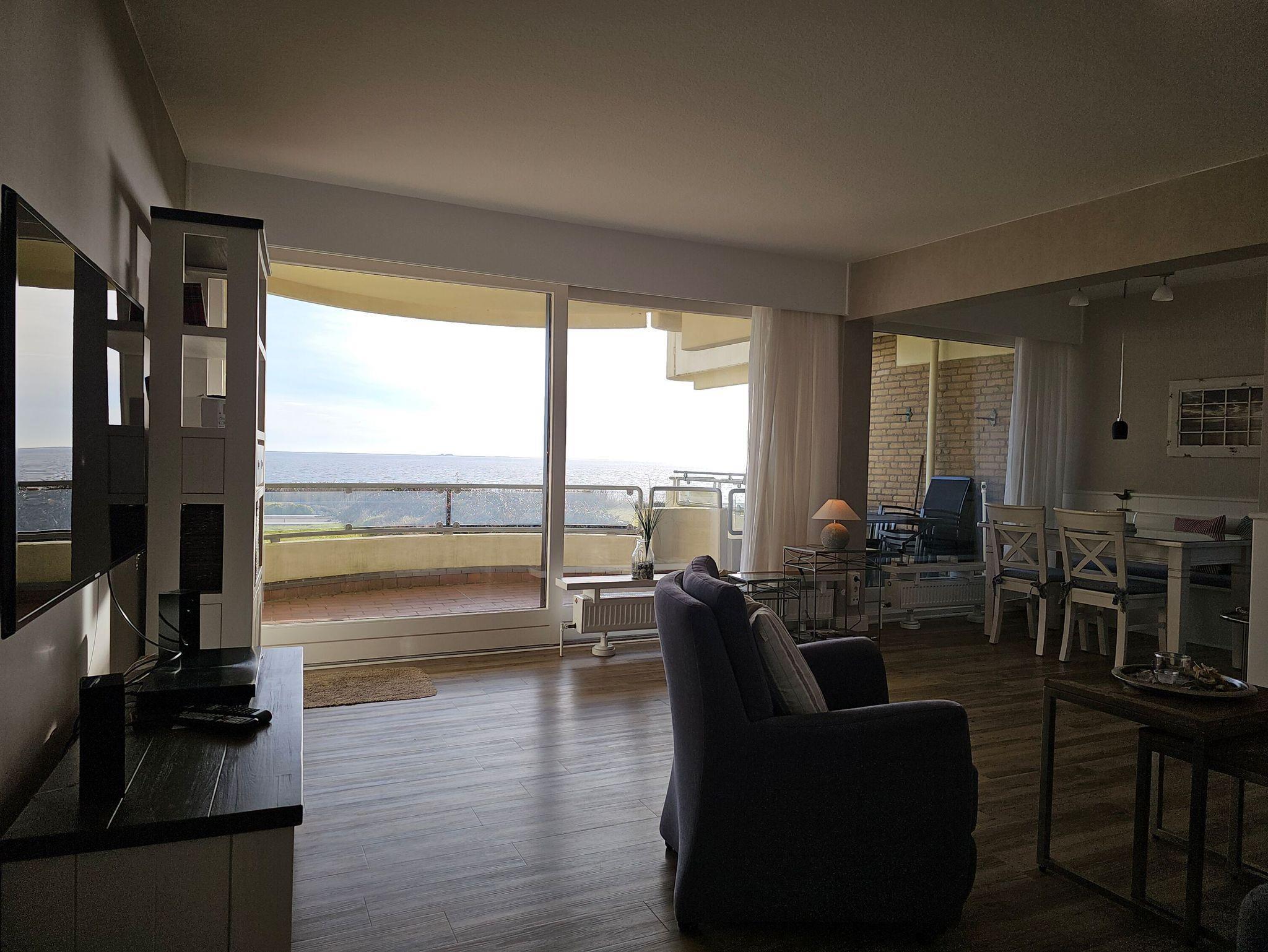 Moderne Ferienwohnung mit Meerblick, Balkon, Schwimmbad und Sauna in Wyk auf Föhr, nur 10 m vom Strand entfernt.