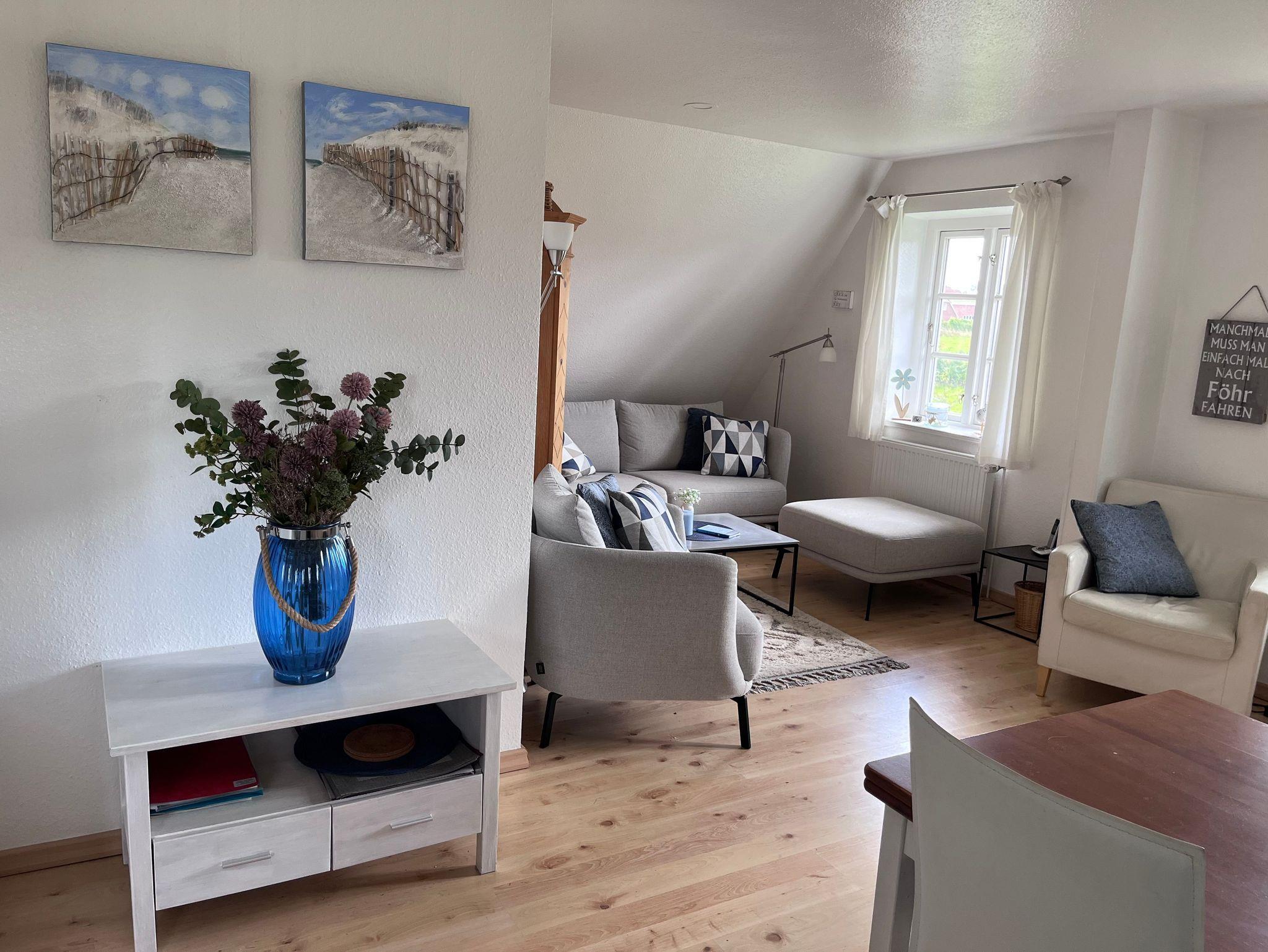 Gemütliche Obergeschoss-Ferienwohnung unter Reet in Wyk auf Föhr mit Terrasse und Strandkorb.