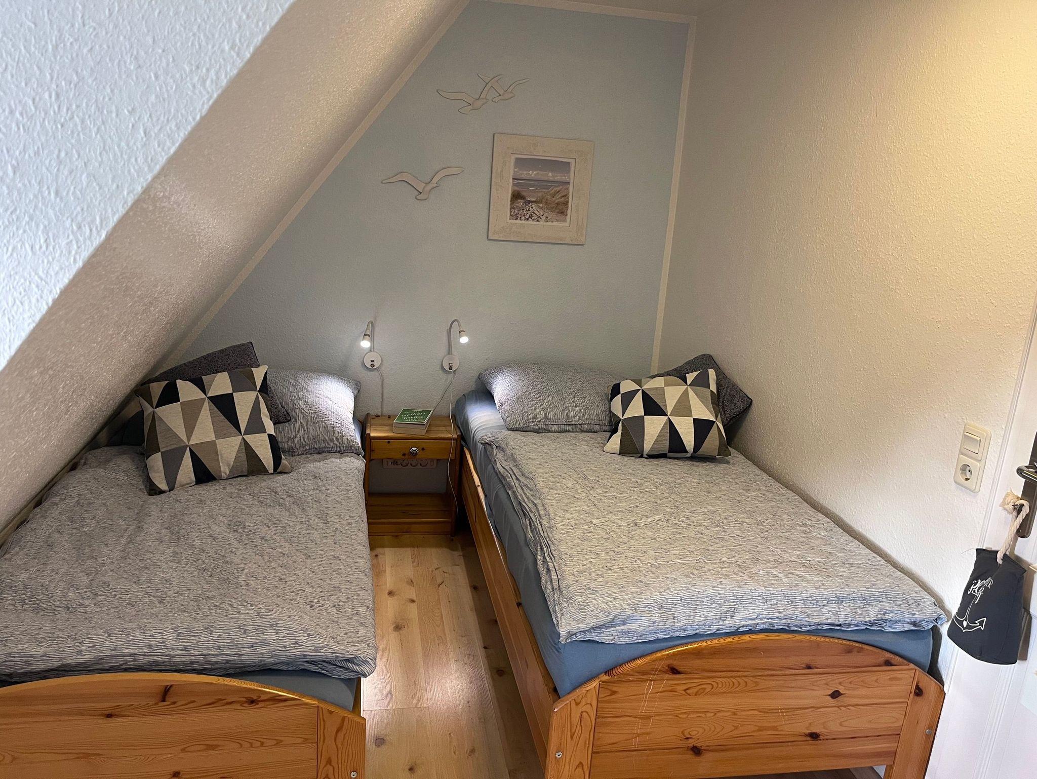 Diese gemütliche, hell eingerichtete Ferienwohnung unter Reet bietet Platz für zwei bis vier Personen. Die Obergeschosswohnung ist ca. 50m² groß. Die beiden Schlafzimmer sind mit zwei Einzelbetten ausgestattet, in einem Schlafzimmer können die Betten zu einem Doppelbett zusammengestellt werden. Das Wohnzimmer mit einer integrierten Küche lädt zum gemeinsamen Kochen ein. Ein Duschbad ist vorhanden. Ein schöner Außensitzplatz mit Strandkorb gehört zur Ferienunterkunft dazu. Natürlich ist auch ein PKW-Stellplatz direkt am Haus vorhanden.