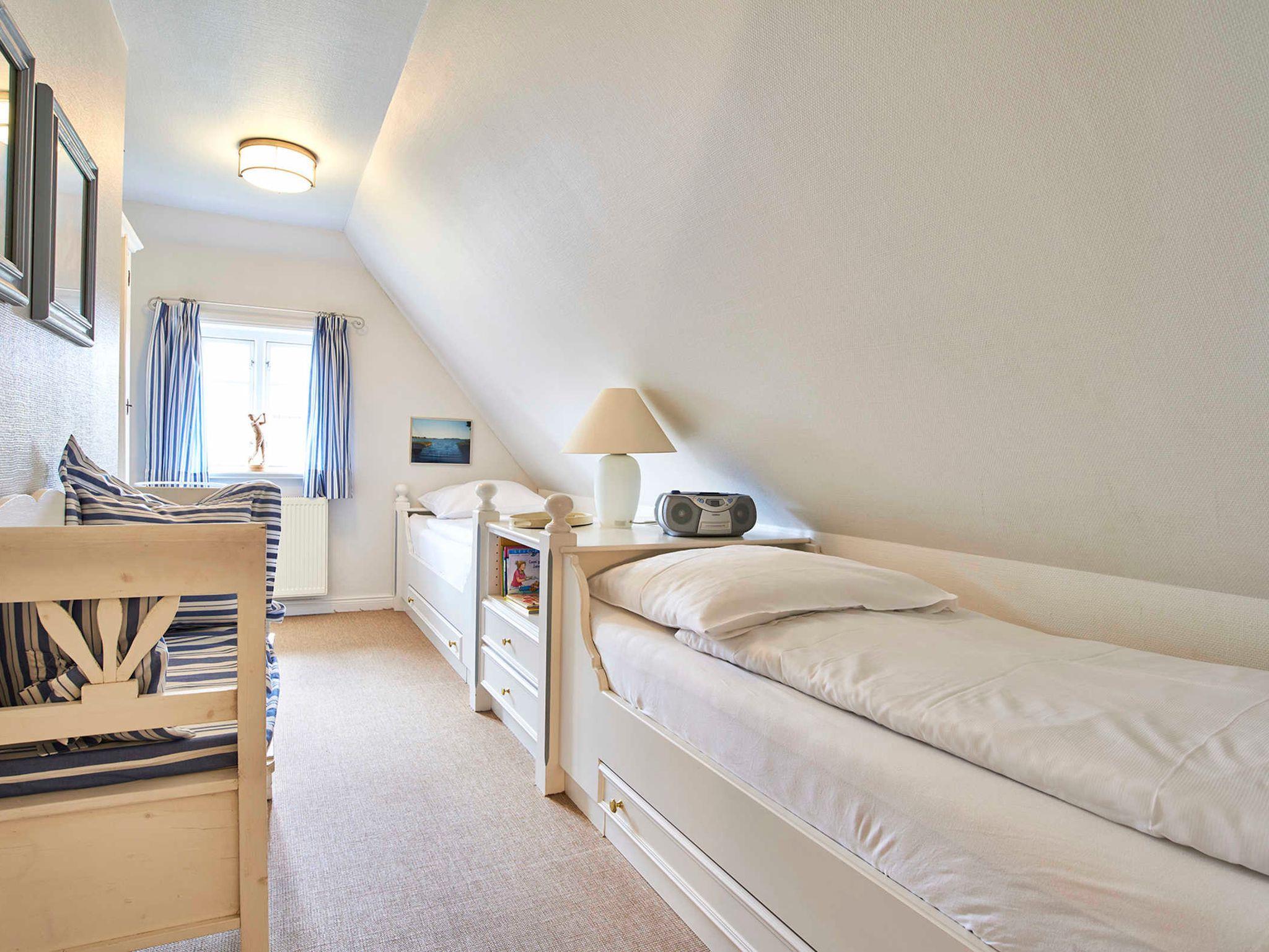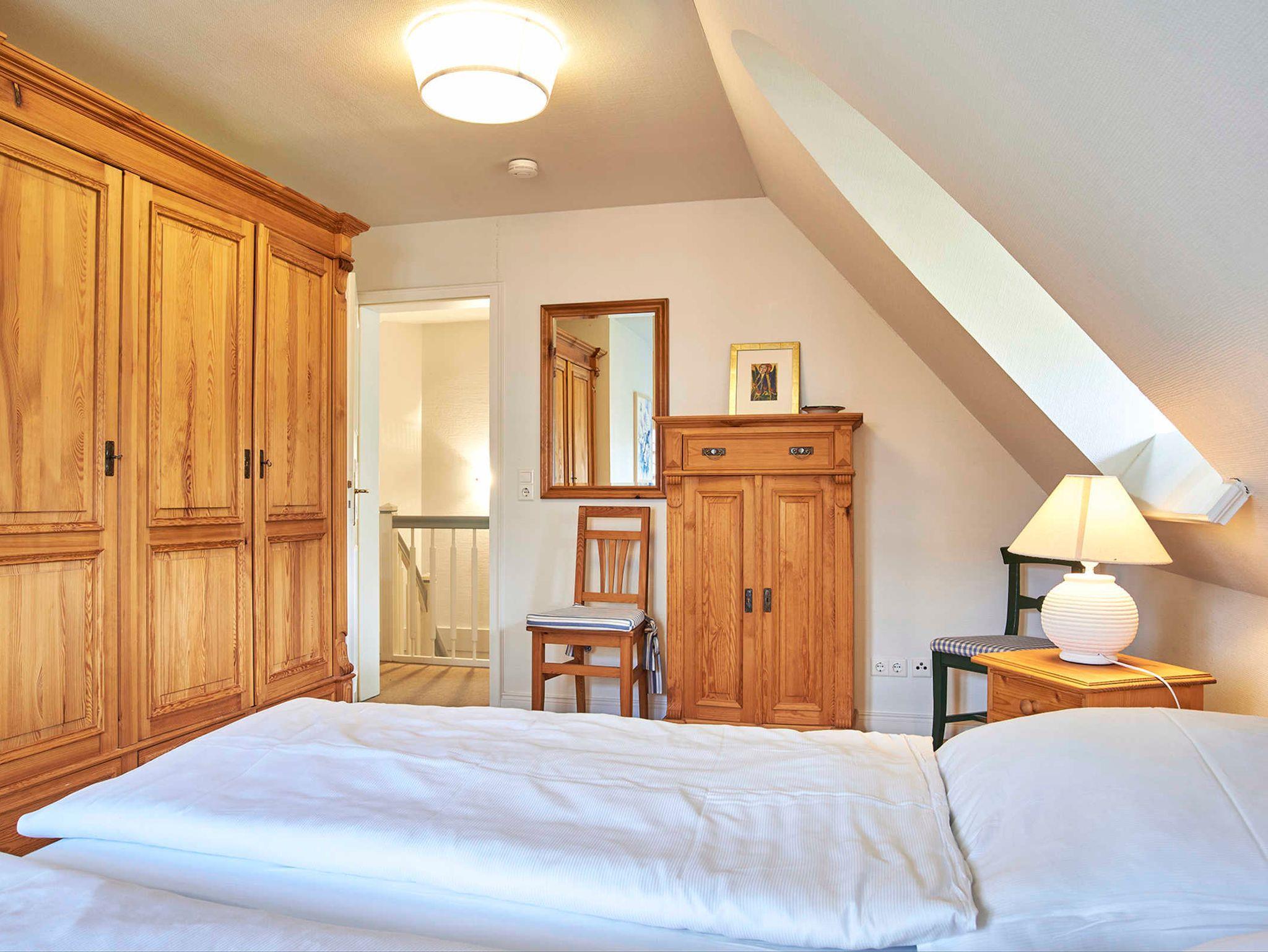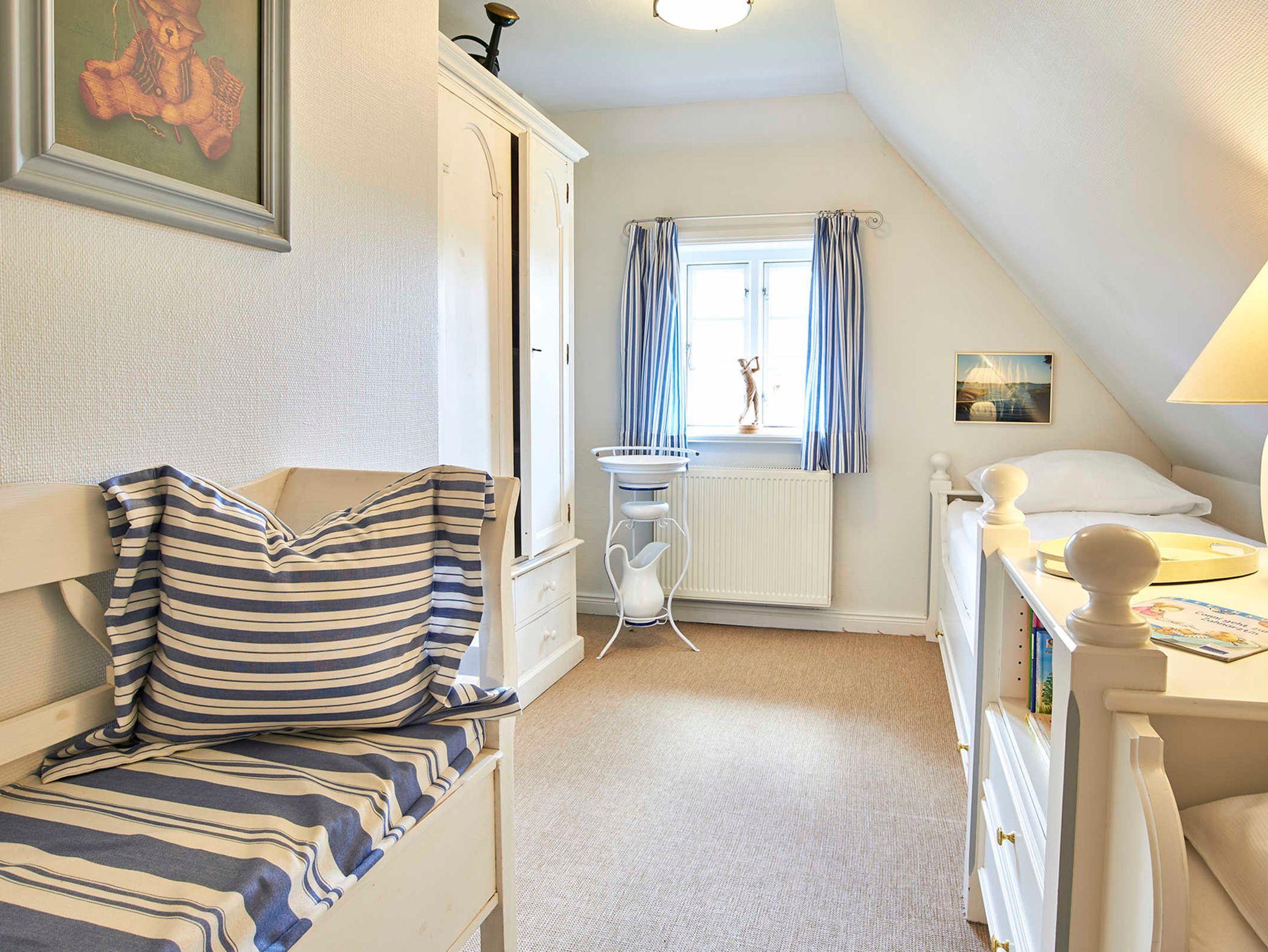 Das Obergeschoss verfügt über zwei Schlafzimmer: 1 Doppelbett im Elternschlafzimmer, 2 Einzelbetten im Stil von Alkoven im Kinderzimmer sowie eine kleine Spielgalerie im Flur laden zum Verweilen ein. Das Duschbad ist mit WC ausgestattet. Das gesamte Mobiliar ist hochwertig und sehr liebevoll zusammengestellt. Auf der Süd-Terrasse, mit bequemen Möbeln und Strandkorb, kann man die Stunden im Freien genießen. Dabei wünschen wir Ihnen bereits jetzt viel Vergnügen und hoffen, dass die Nordseeluft und das Wetter dazu beitragen!