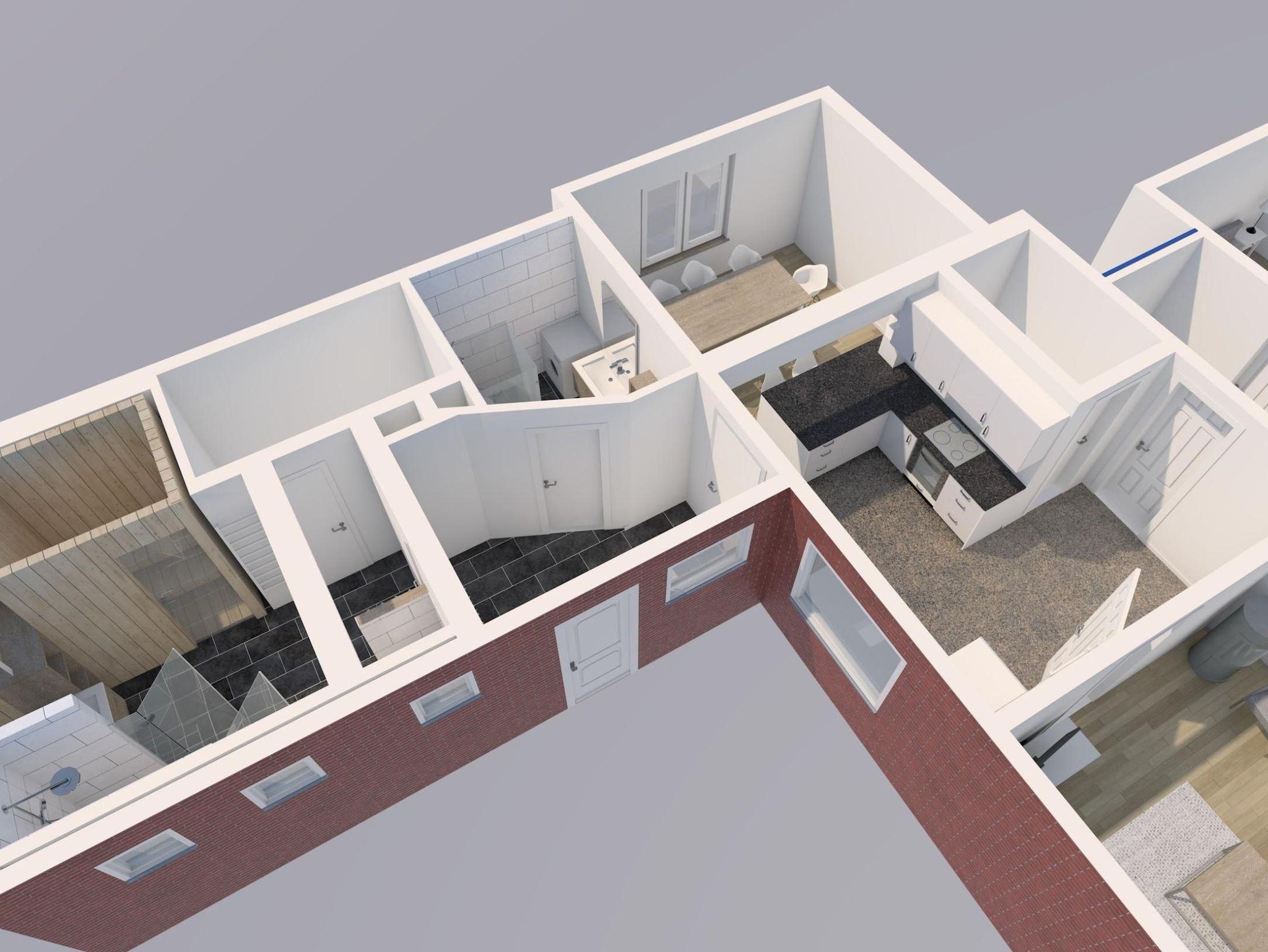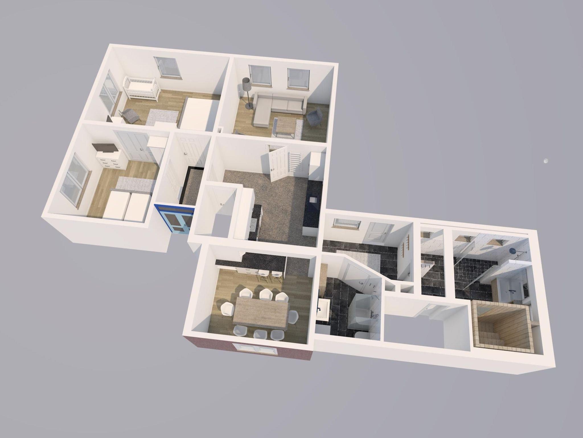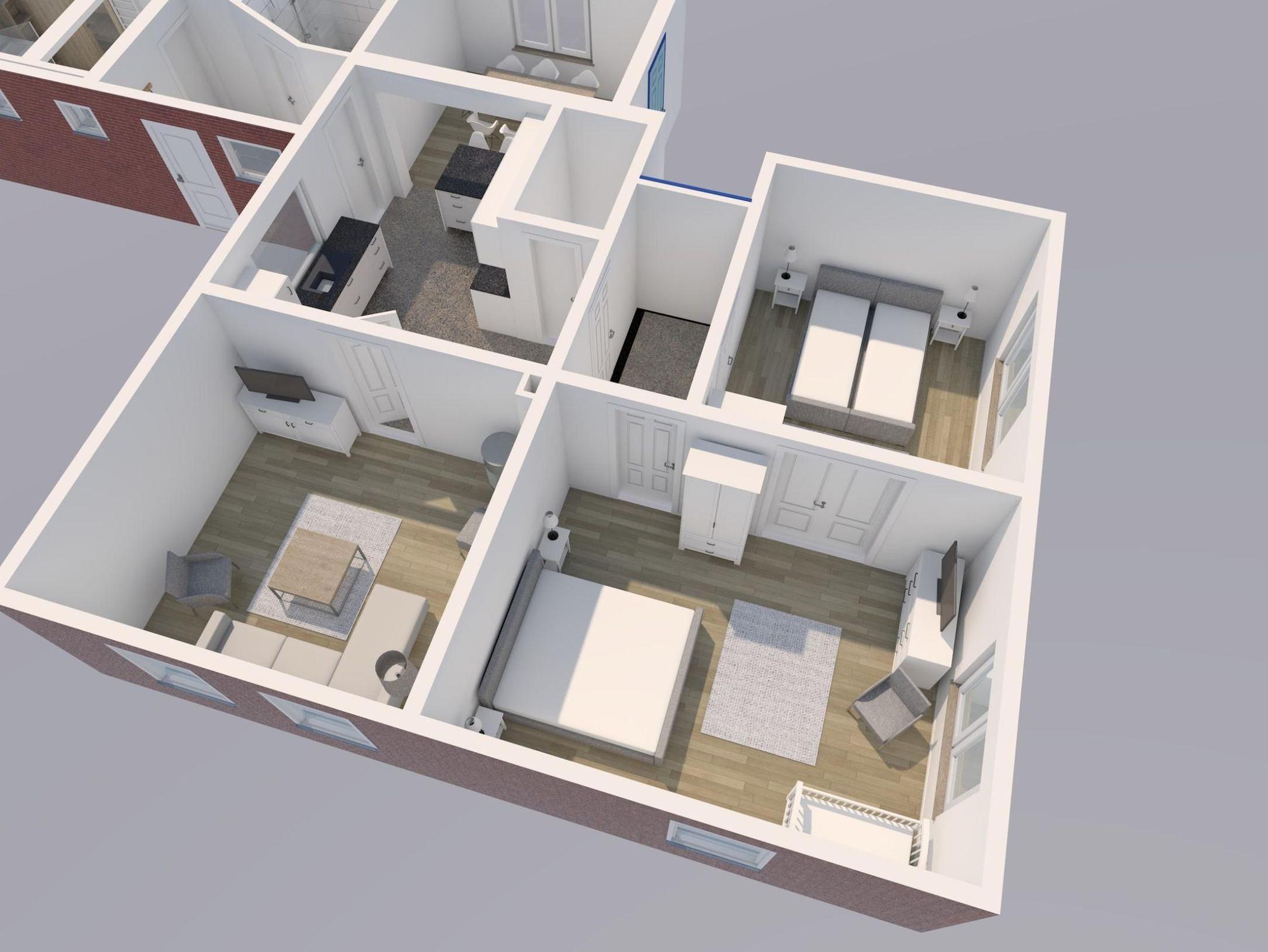 Raumaufteilung: 1 Schlafraum (1 Doppelbett), 1 Schlafraum (1 Doppelbett), 1 Wohnraum (1 Doppelschlafcouch), 1 Diele/Vorraum, 1 Flur, 1 separate Küche, 1 Badezimmer mit Dusche, 1 Badezimmer mit Duschwanne.