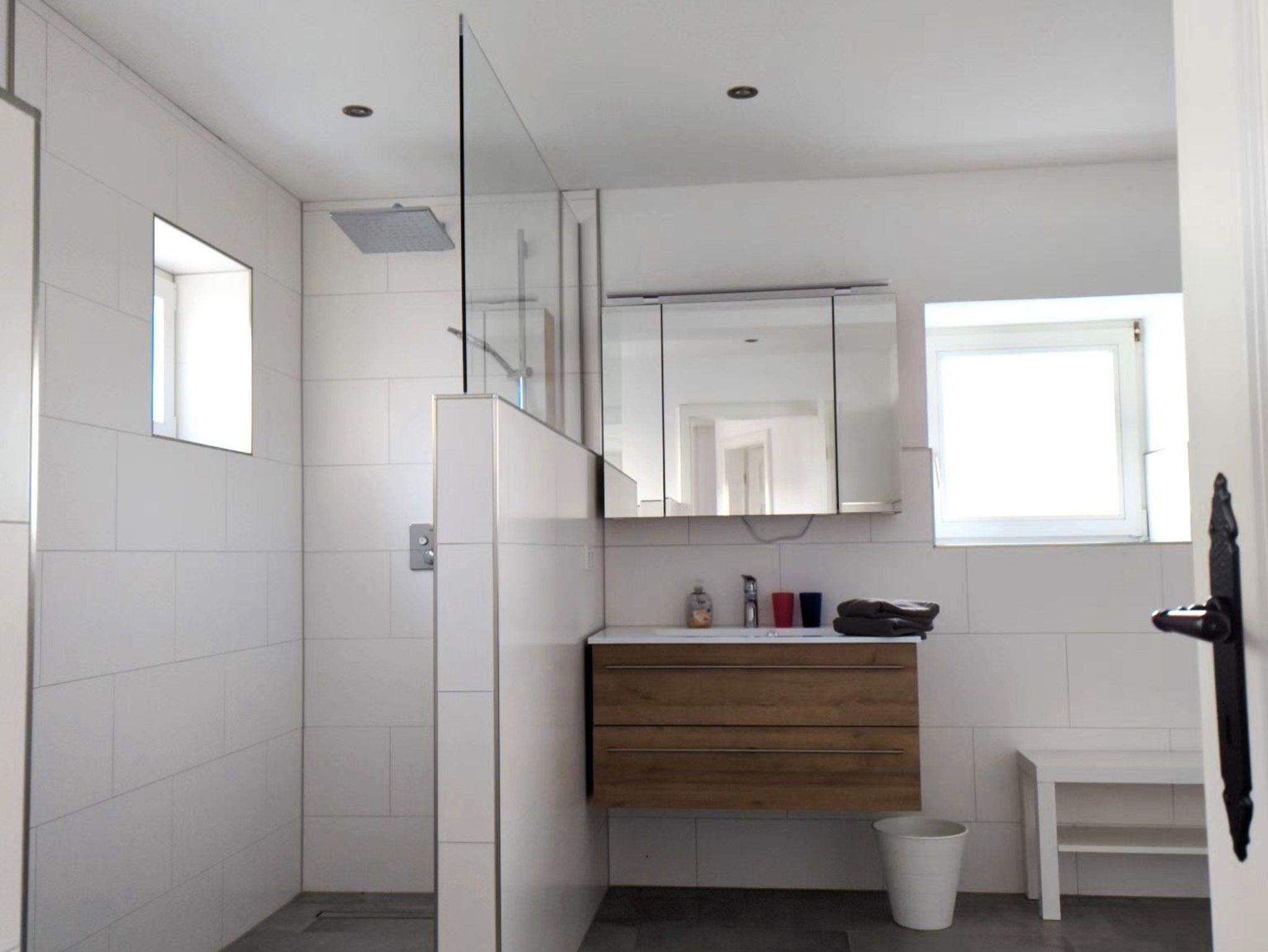 Sanitär: Handtuchheizkörper, Schminkspiegel.