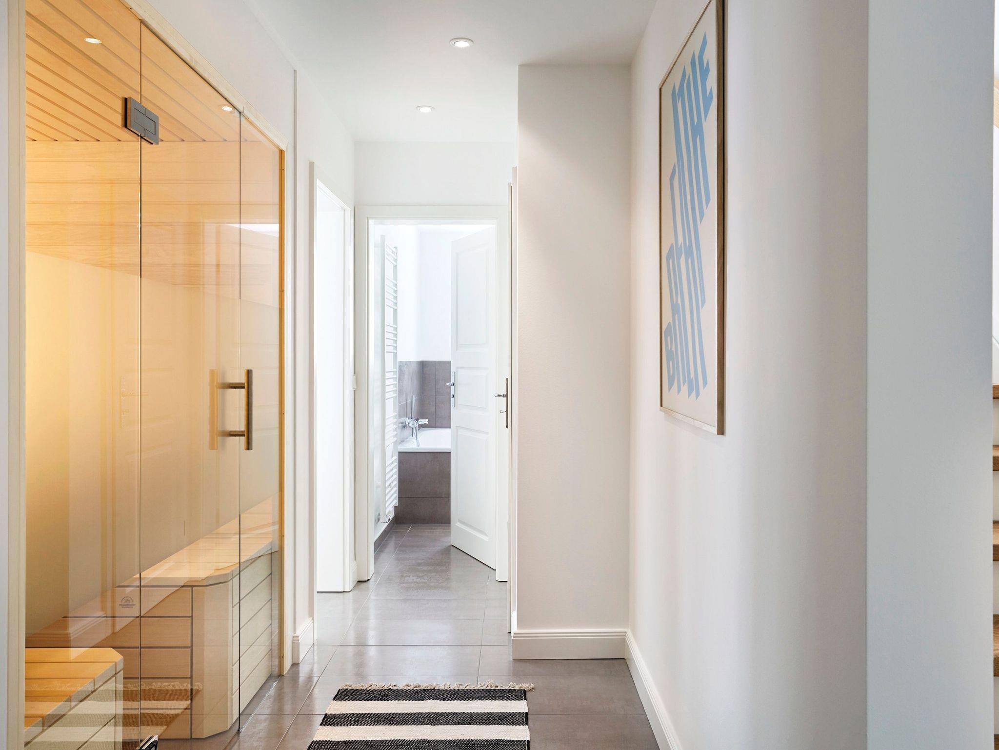Im Untergeschoss befindet sich eine Saune mit Glasfront. Diese lädt ? gerade im Winter ? zu einem Wellnesstag ein. Ein großes Duschbad ist gleich nebenan. Zusätzlich gibt es noch ein Zimmer zum Relaxen und - falls man im Urlaub wirklich mal arbeiten muß ? einen Schreibplatz.