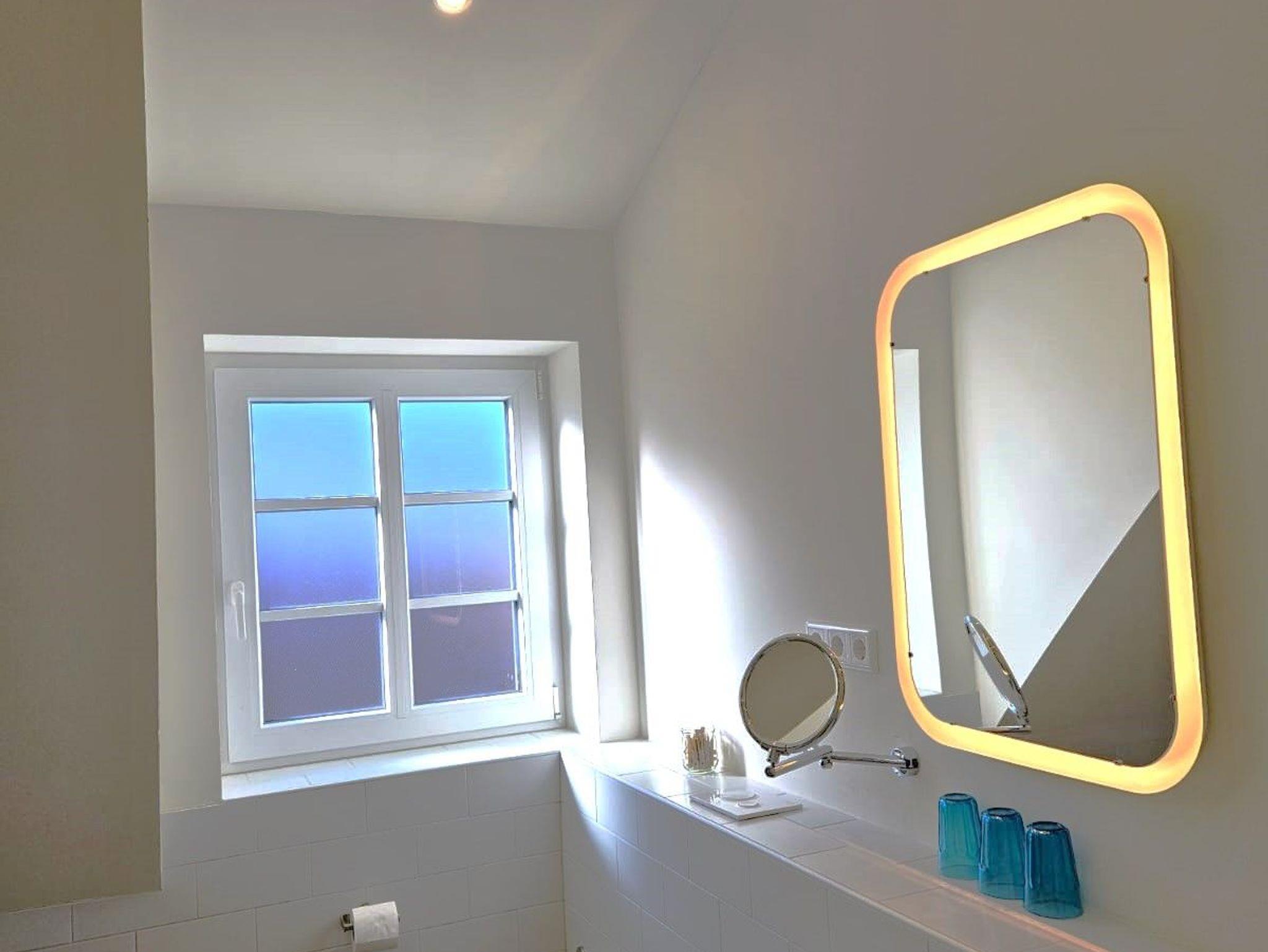 Sanitär: Föhn, Handtuchheizkörper, Schminkspiegel.