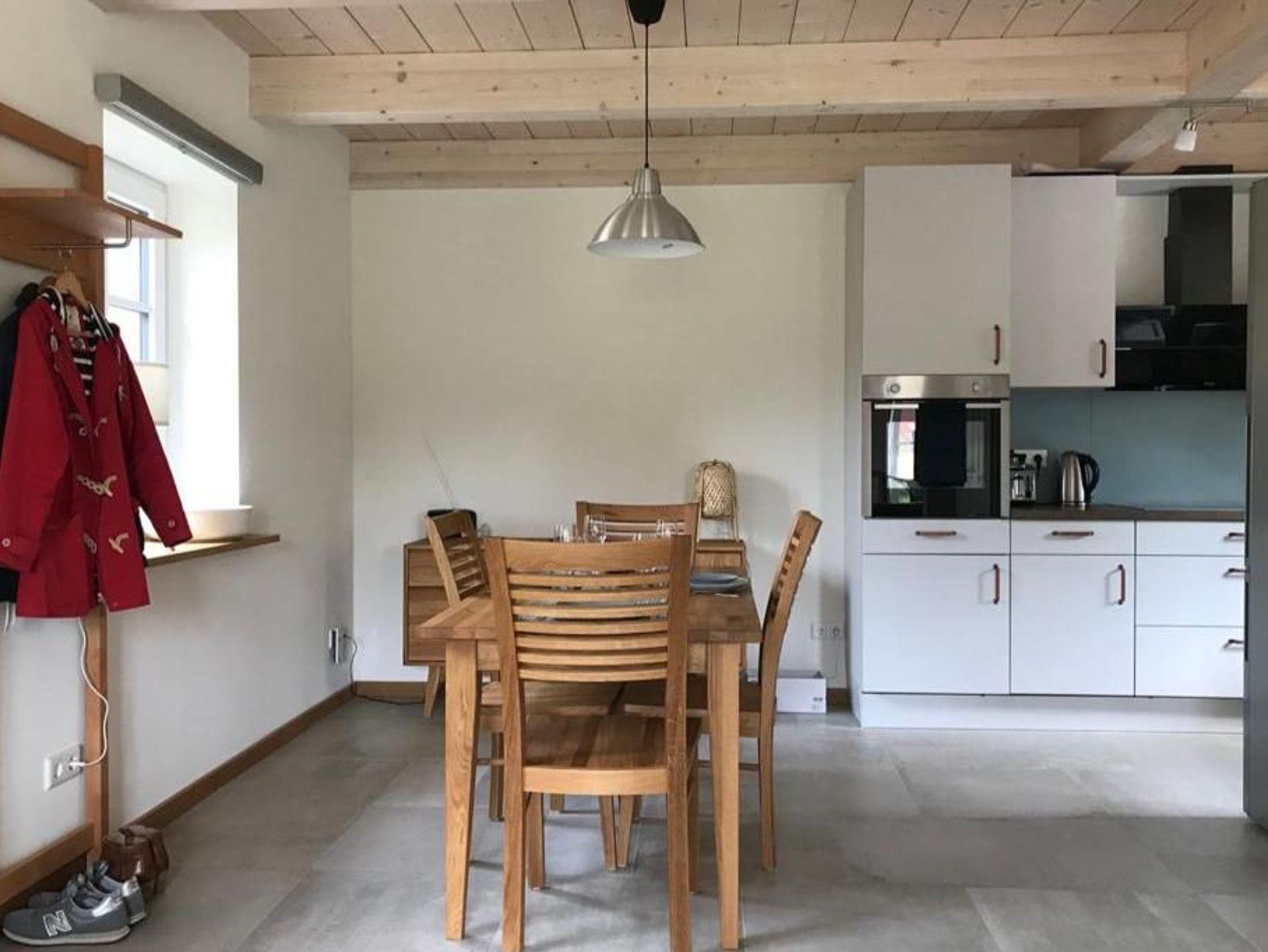 Die Küche ist mit Herd, Backofen, Mikrowelle, Kühl-/Gefrierkombination, Geschirrspüler, Waschmaschine sowie diversen Kaffeemaschinen versehen.Vom Wohnzimmer erhält man weiterhin Zugang zur eigenen Außenterrasse. Im Dachgeschoss befindet sich ein geräumiges Schlafzimmer mit komfortablem Doppelbett (zwei Einzelmatratzen) sowie ein kleineres Schlafzimmer als zusätzlicher Multifunktionsraum. Das Badezimmer mit Wanne ist ebenfalls im Dachgeschoss untergebracht.Ein Parkplatz für ein Fahrzeug normaler Größe (kein SUV / Bus) steht auf dem Grundstück zur Verfügung.Nach Rücksprache können Fahrräder unter einer Überdachung wind- / wettergeschützt abgestellt werden.