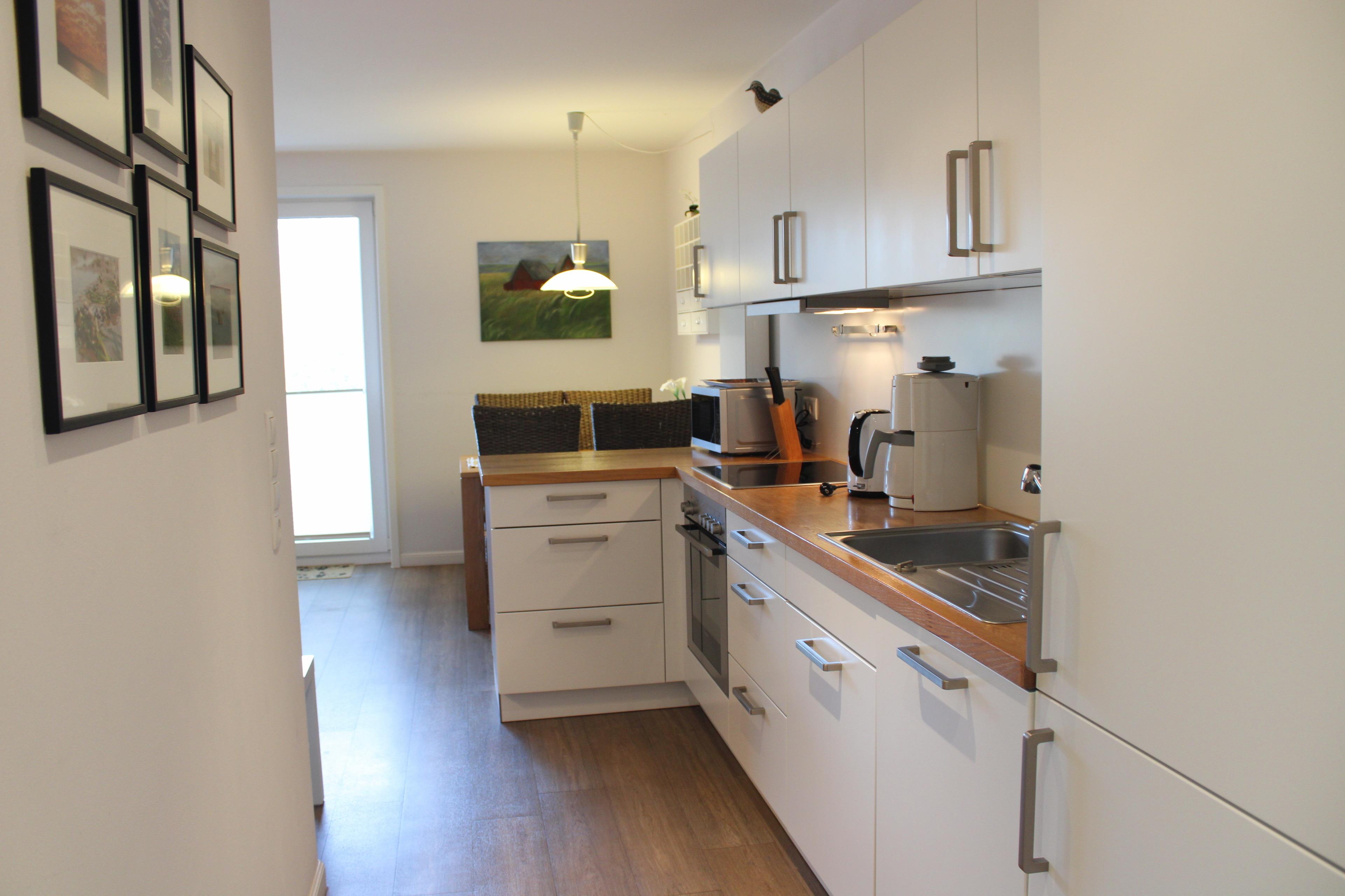 Ein separates Schlafzimmer mit großem Doppelbett, das helle Duschbad und die Küchenzeile sind mit allem Komfort ausgestattet.