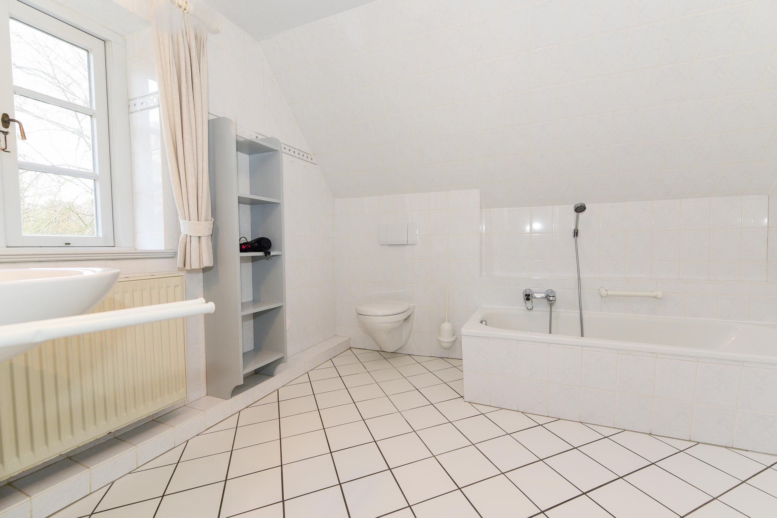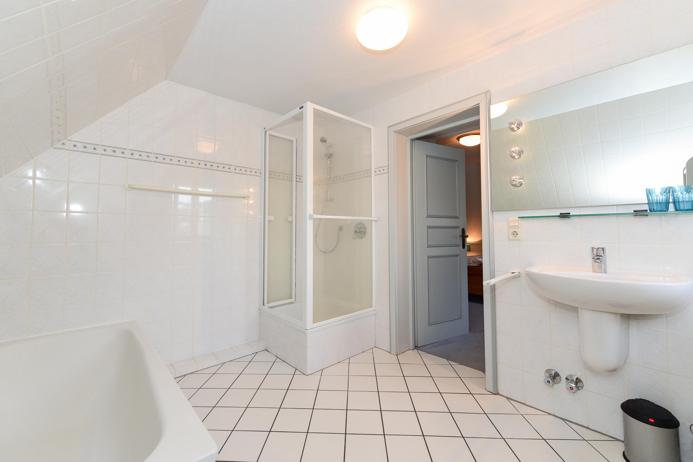Im Obergeschoss finden Sie ein großes Vollbad mit Wanne, Dusche und WC sowie ein zusätzliches Duschbad.