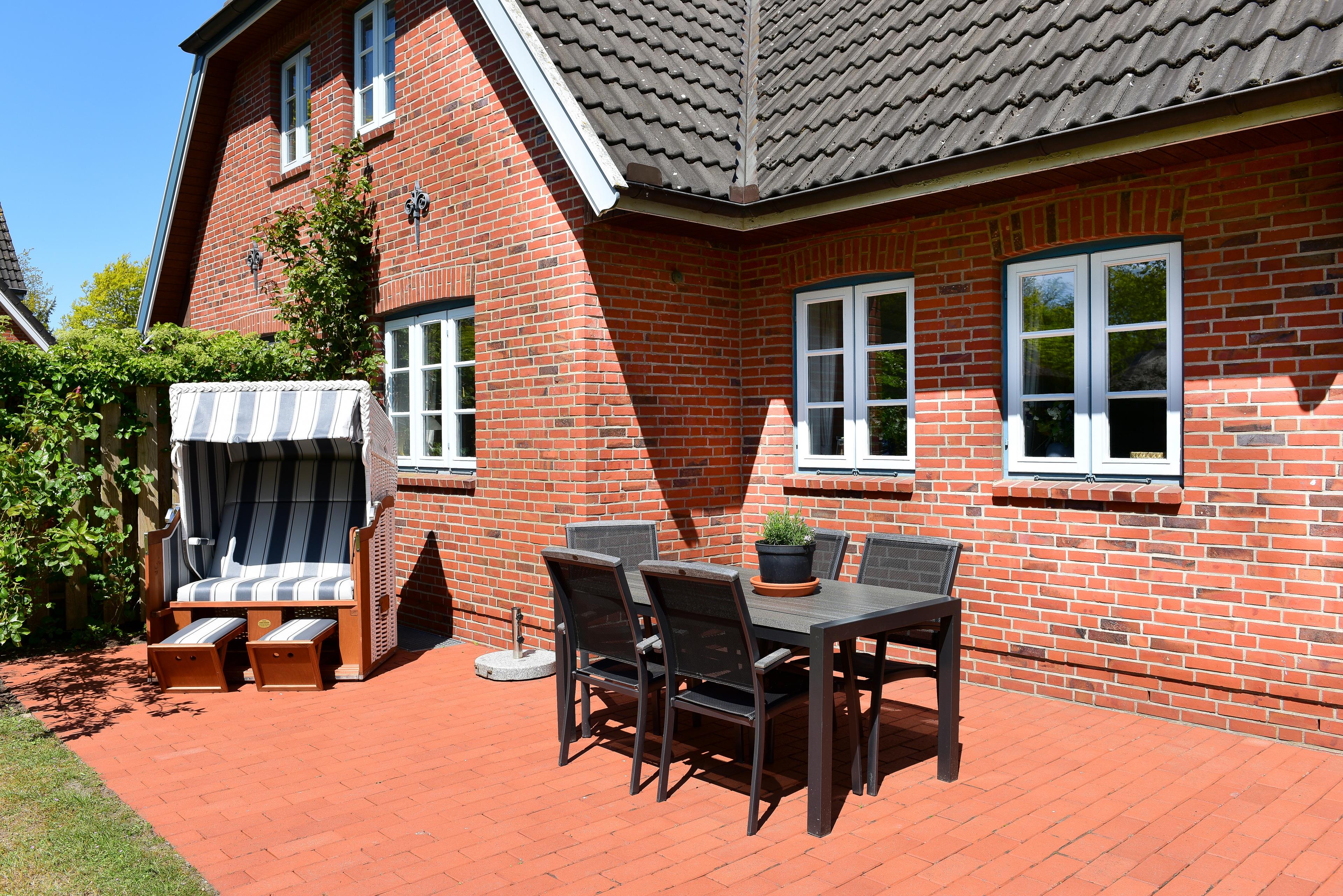 Der große Garten sowie die sonnige Terrasse mit Strandkorb und Gartenmöbeln sind ideal, um die frische Nordseeluft zu genießen.