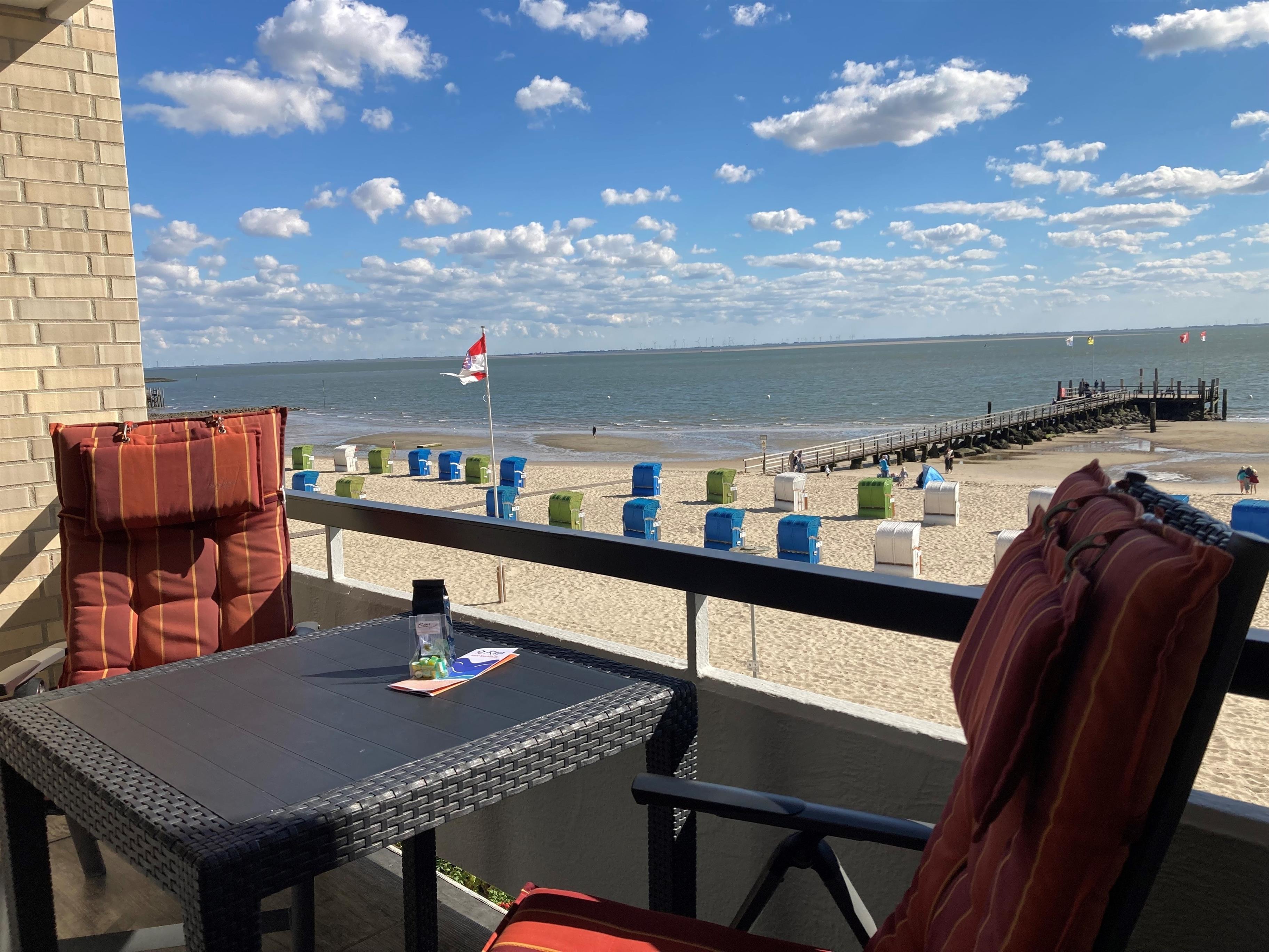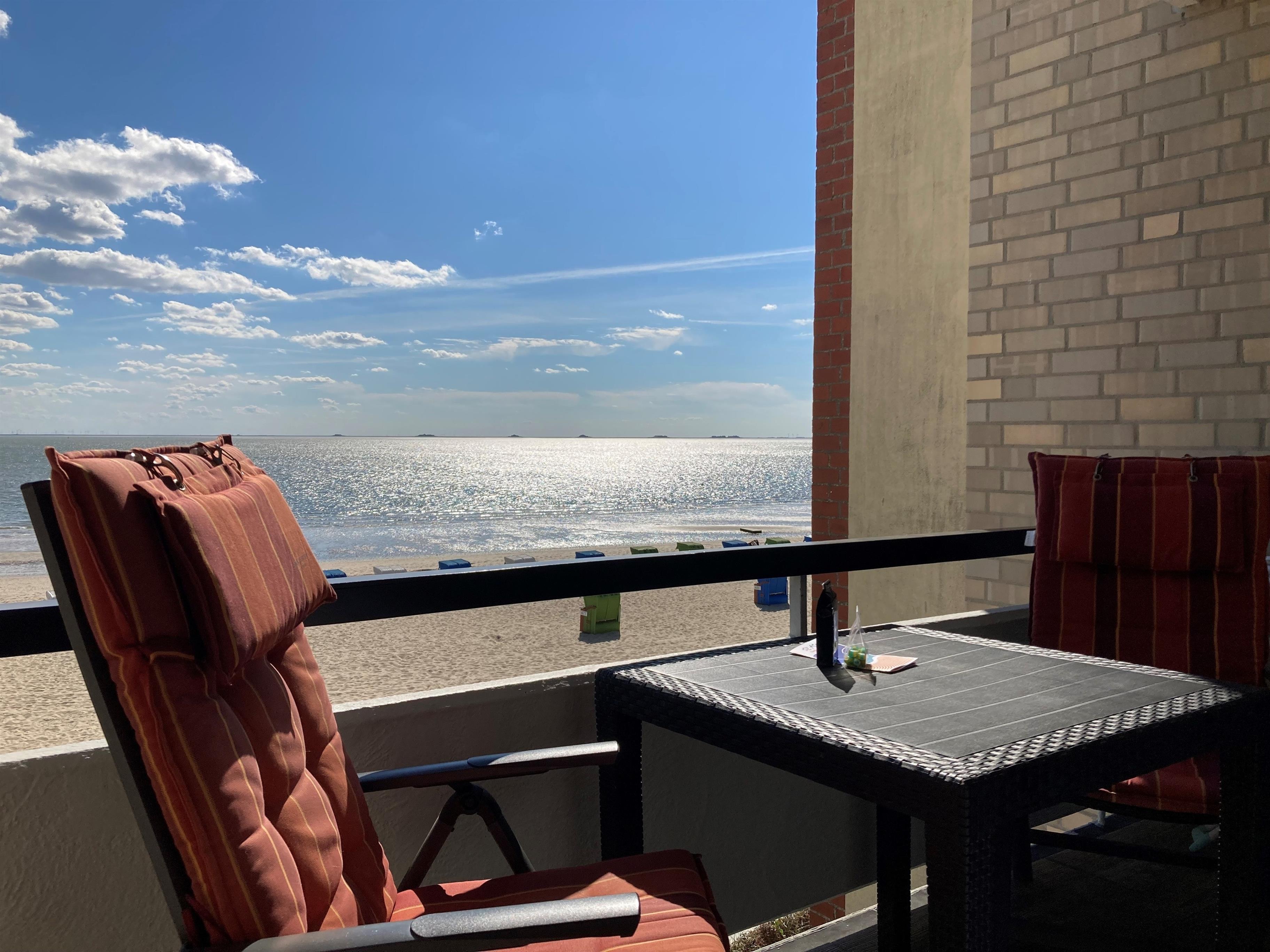 Windgeschützt in der Logia des Hauses Irma am Sandwall in Wyk genießen Sie bei jedem Wetter die Aussicht auf den Strand und das Wattenmeer. Ein besonders schöner Moment ist, wenn die Sonne am Meereshorizont erwacht..