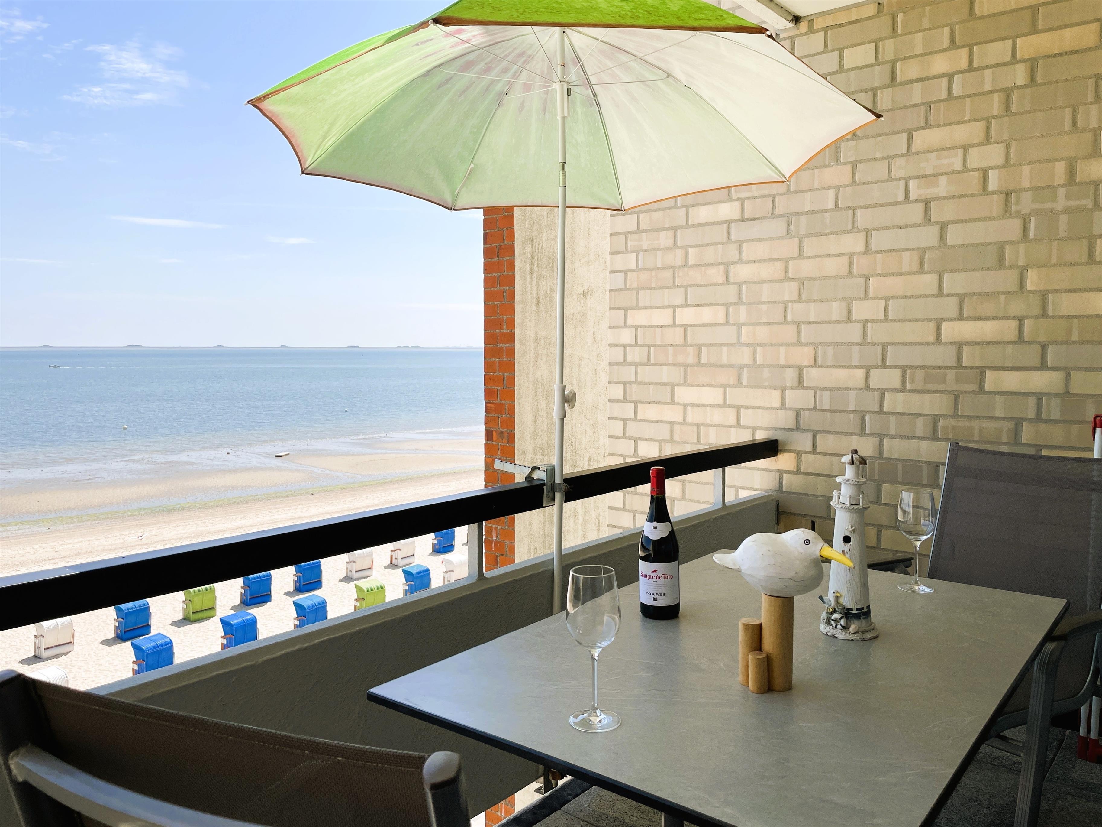 Windgeschützt in der Logia des Hauses Irma am Sandwall in Wyk genießen Sie bei jedem Wetter die Aussicht auf den Strand und das Wattenmeer. Ein besonders schöner Moment ist, wenn die Sonne am Meereshorizont erwacht..