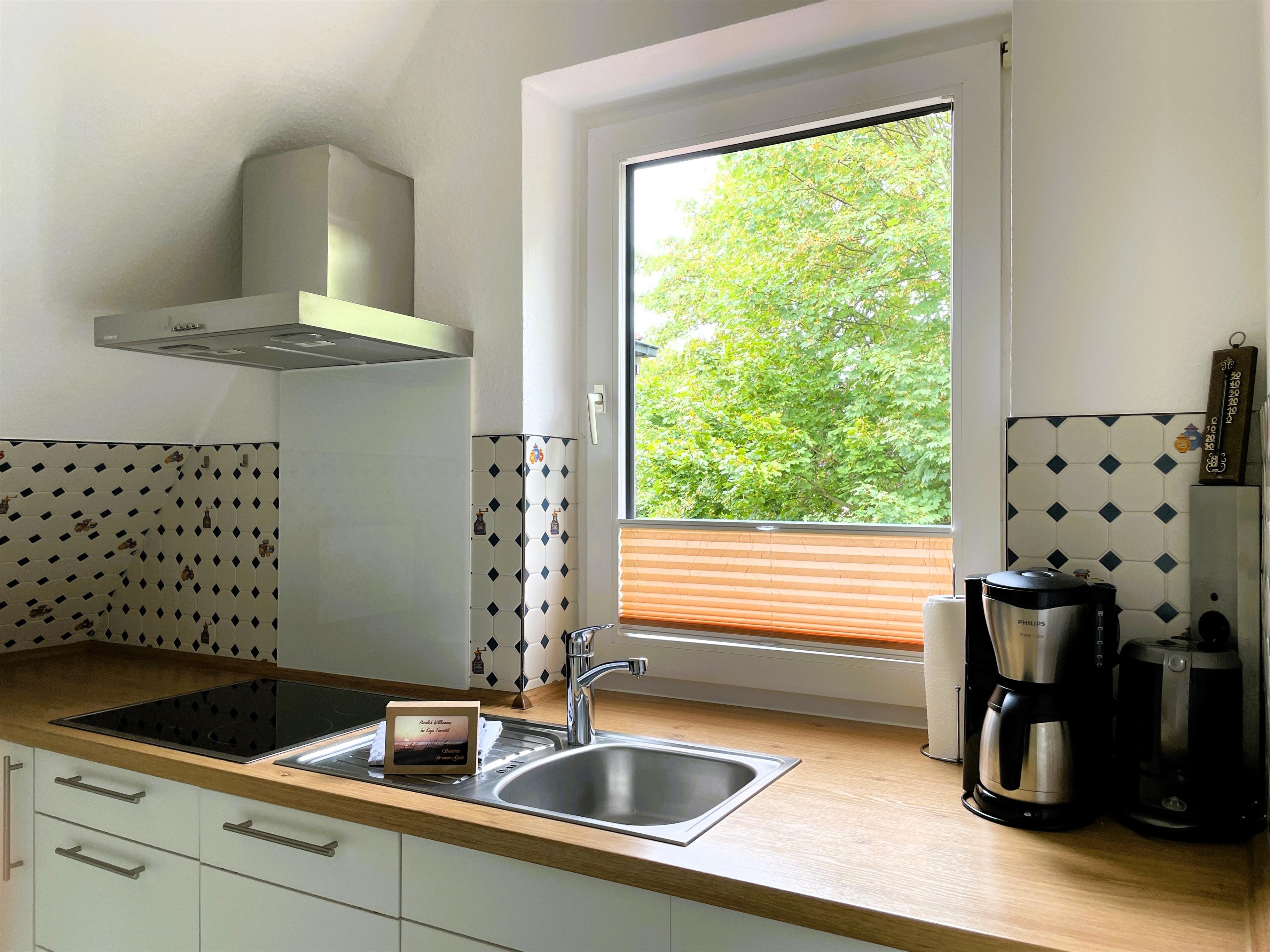 Unsere Wohnung Meeresbrandung befindet sich in der zweiten Etage in einem gepflegten, ruhig gelegenen , von Grün umgebenen Reihenhaus im Olhörnweg 1 und erstreckt sich über 2 Ebenen. Vom Eingang aus gehen Sie in eine vollausgestattete Küche mit Ceranfeld-Herd, Backofen, Mikrowelle, Wasserkocher, Kaffeemaschine, Geschirrspüler, Waschtrockner und Eierkocher, die zum Kochen einlädt.
