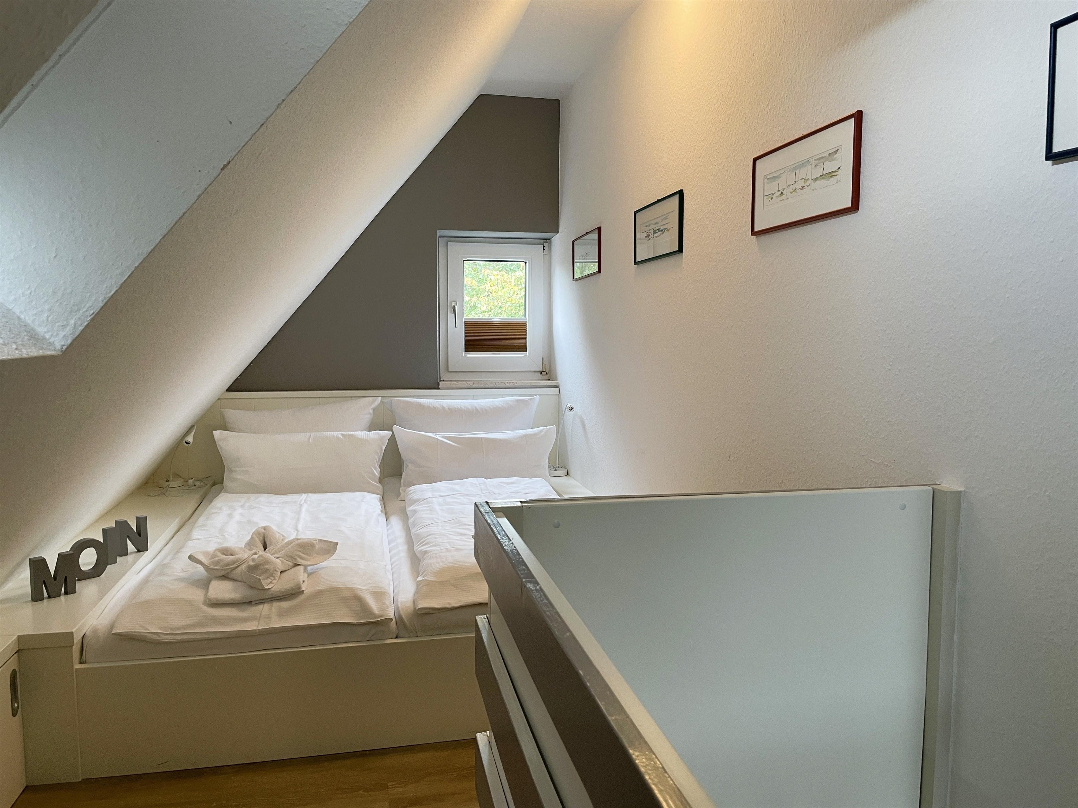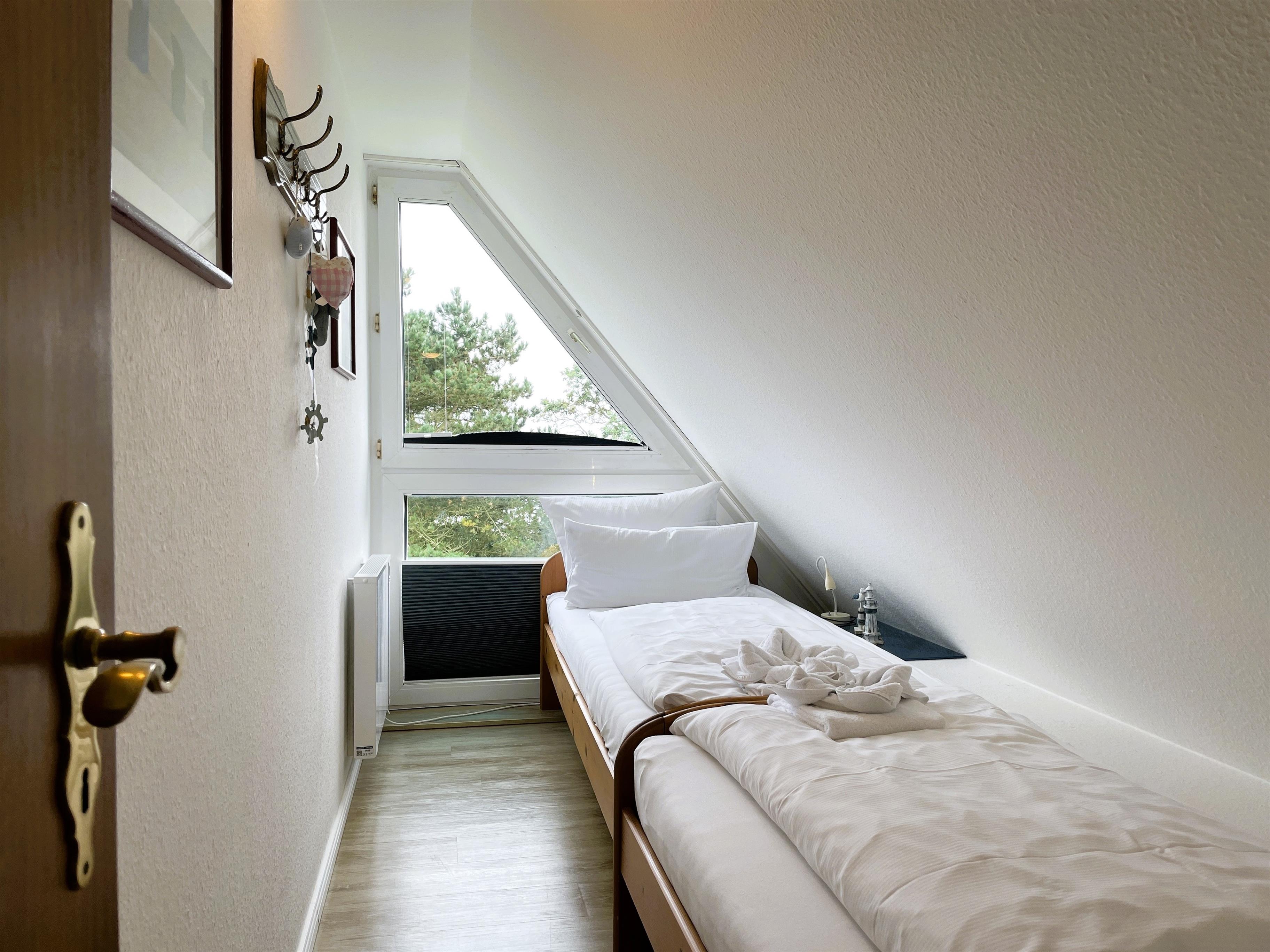Daneben befindet sich das kleine Badezimmer mit Dusche, welches funktional ist. Das helle geräumige Wohnzimmer mit hochwertigem Schlafsofa mit Lattenrost (150 x190cm), gemütlichem Essbereich, Kabelfernsehen, W-LAN, Telefon mit kostenfreier Nutzung des deutschen Festnetzes führt auf den Balkon hinaus, der einen traumhaften Blick über den weitläufigen Garten hin zum Meer bietet. Das Obergeschoß erreichen Sie über eine Raumspartreppe, die am oberen Ende mit einem Treppenschutzgitter gesichert ist. Hier befinden sich zwei ineinander übergehende Schlafräume mit einem Doppelbett (160x 200 cm) und zwei Einzelbetten (teils unter einer Dachschräge je 90x200 cm). Von dem einen Raum haben Sie ebenfalls den schönen Blick auf das Meer. Alle wichtigen Versorgungseinrichtungen wie Bäcker, Supermarkt usw. erreichen Sie innerhalb von 10 Gehminuten. Zum Strand sind es ca. 100m und das Meerwasserwellenbad AquaFöhr erreichen Sie in wenigen Gehminuten. Das Zentrum von Wyk sowie die Promenade mit gemütlichen Cafés und Boutiquen sind in wenigen Gehminuten erreichbar.