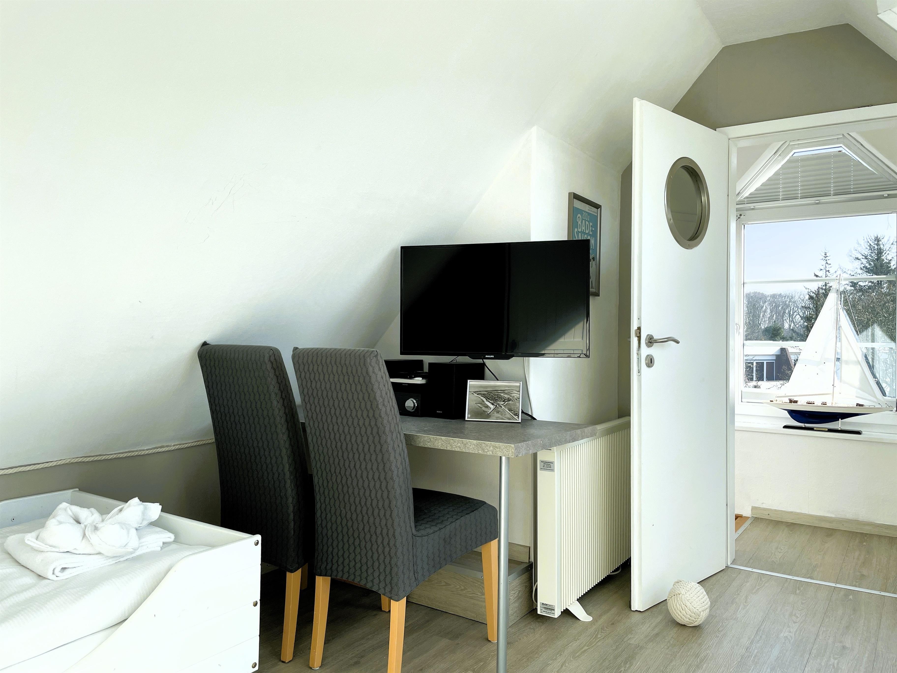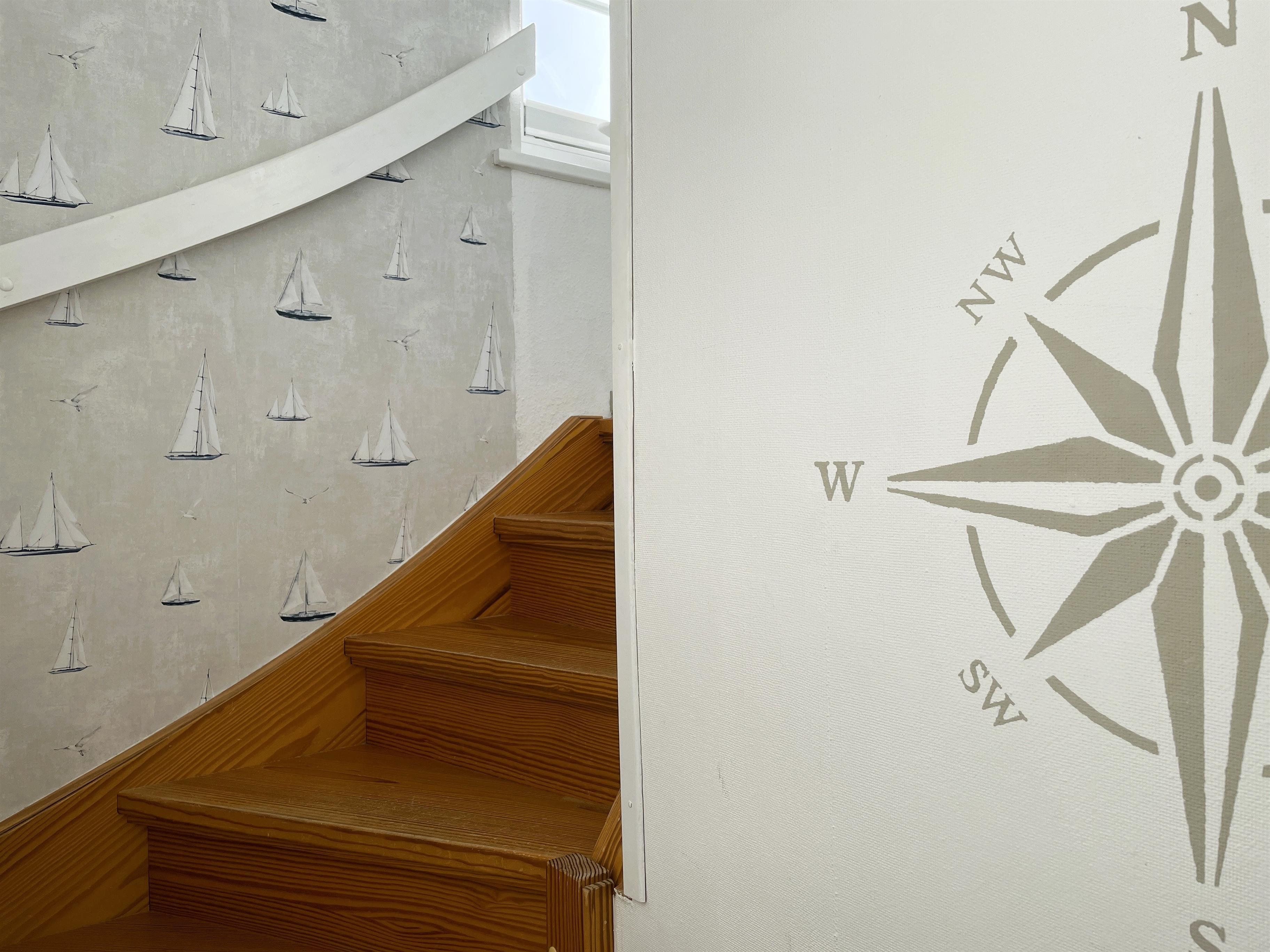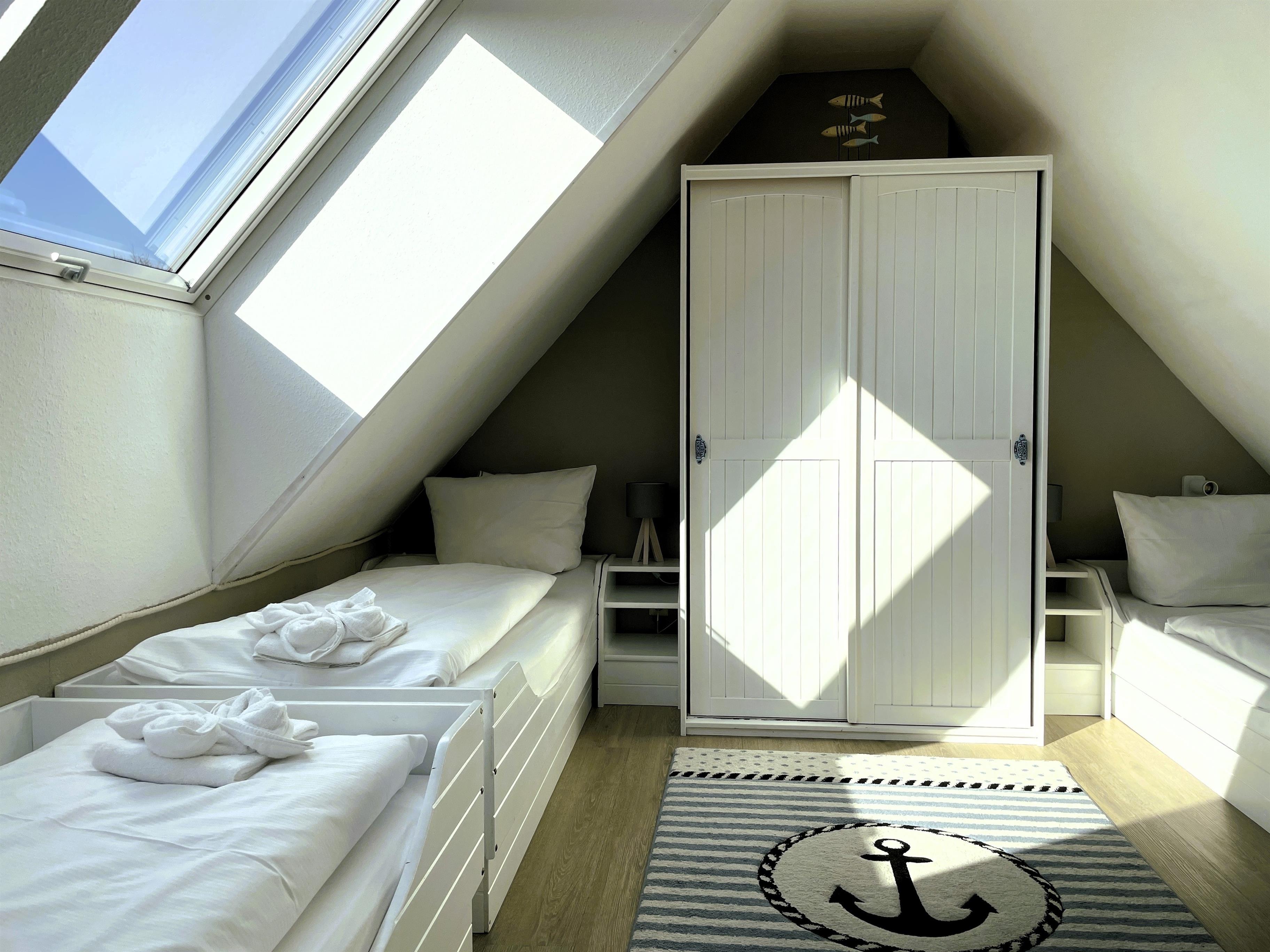 Die lichtdurchflutete Wohnung verteilt sich auf 2 Etagen. Im 1. Obergeschoss befinden sich das liebevoll mit kleinen Details dekorierte Wohnzimmer, eine gut ausgestattete Küchenzeile mit Essbereich, ein Badezimmer mit Dusche und ein gemütliches Schlafzimmer mit Doppelbett (160x200 cm) und Kleiderschrank. Über eine robuste Treppe geht’s ins Dachgeschoss. Drei Einzelbetten (90x200cm), ein Kleiderschrank und ein Schreibtisch sowie ein zusätzlicher Fernseher stehen für Sie bereit. Maritim eingerichtet präsentiert sich dieser Raum nicht nur als Schlafraum sondern auch als Wohlfühlraum, wenn Sie sich mal zurückziehen wollen. Für Schietwedder-Tage haben wir für die Großen und Kleinen Gesellschaftsspiele, Bücher, Kabel TV und Stereoanlage, falls mal Langeweile aufkommen sollte.