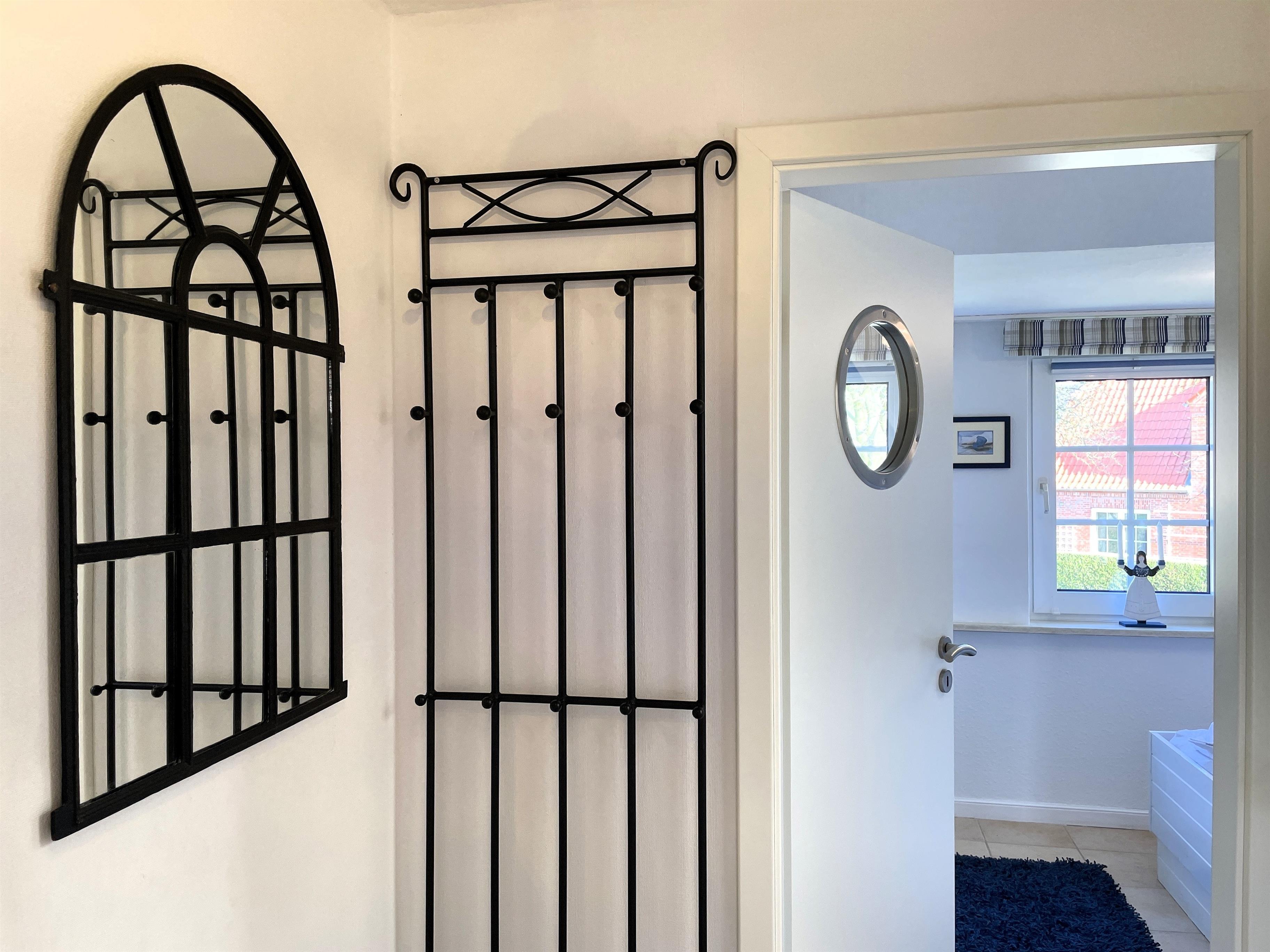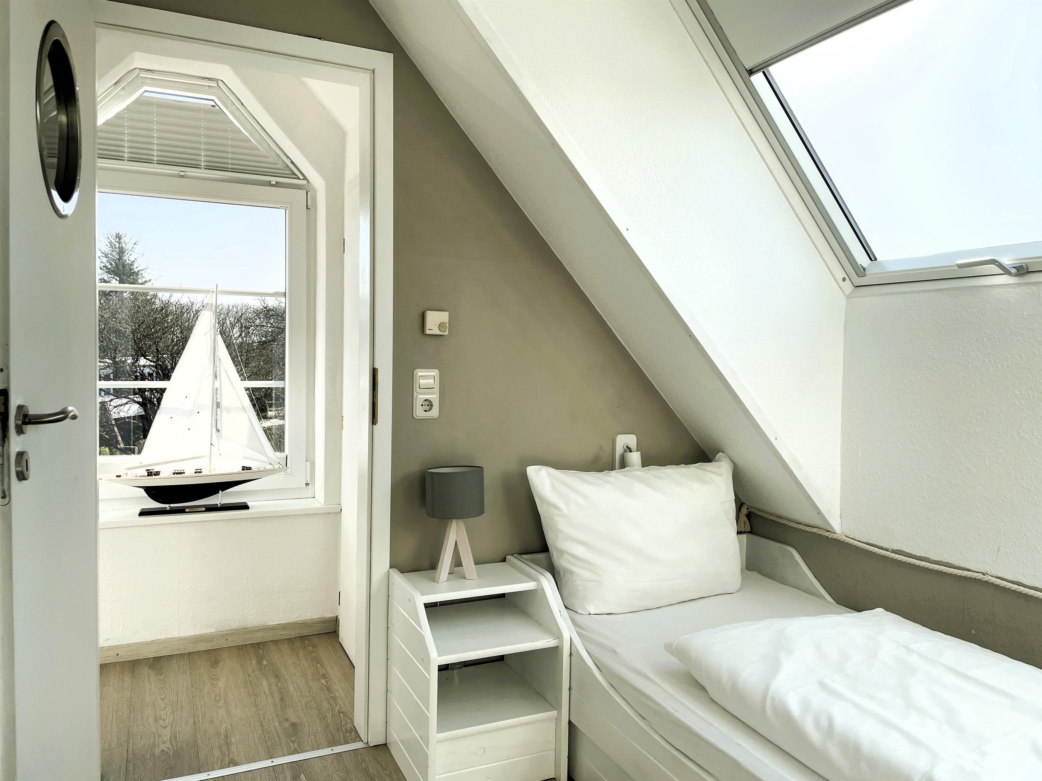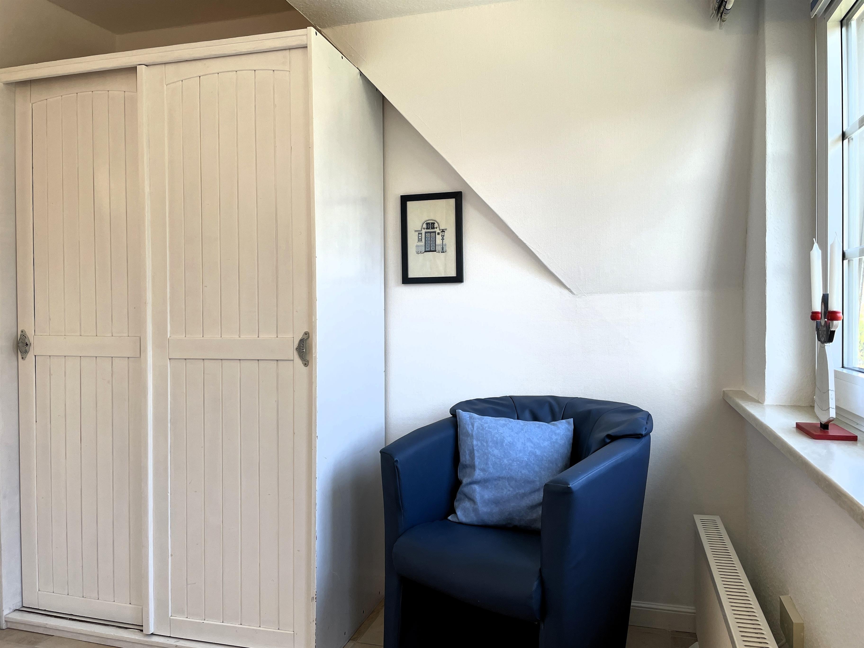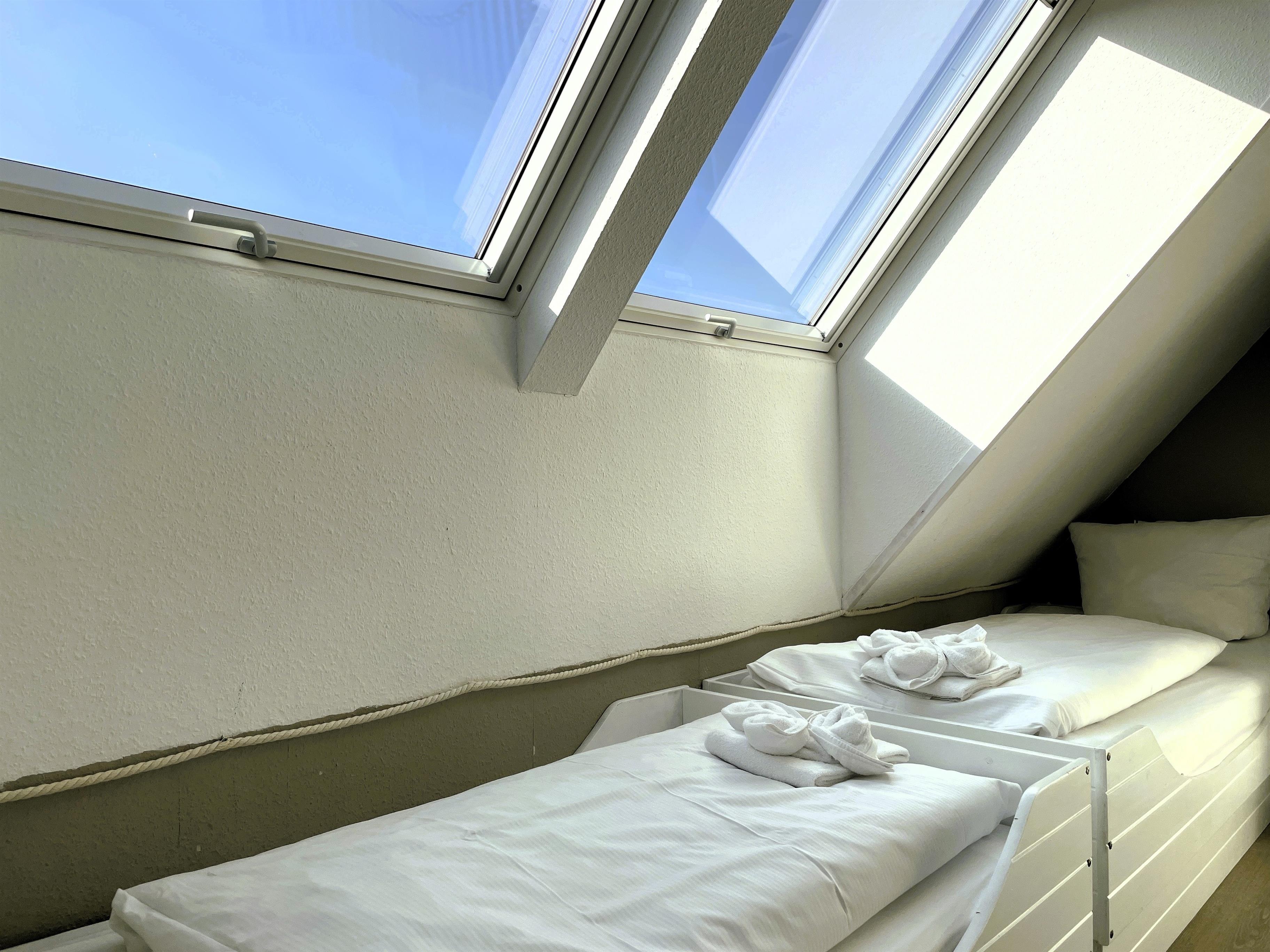 Die lichtdurchflutete Wohnung verteilt sich auf 2 Etagen. Im 1. Obergeschoss befinden sich das liebevoll mit kleinen Details dekorierte Wohnzimmer, eine gut ausgestattete Küchenzeile mit Essbereich, ein Badezimmer mit Dusche und ein gemütliches Schlafzimmer mit Doppelbett (160x200 cm) und Kleiderschrank. Über eine robuste Treppe geht’s ins Dachgeschoss. Drei Einzelbetten (90x200cm), ein Kleiderschrank und ein Schreibtisch sowie ein zusätzlicher Fernseher stehen für Sie bereit. Maritim eingerichtet präsentiert sich dieser Raum nicht nur als Schlafraum sondern auch als Wohlfühlraum, wenn Sie sich mal zurückziehen wollen. Für Schietwedder-Tage haben wir für die Großen und Kleinen Gesellschaftsspiele, Bücher, Kabel TV und Stereoanlage, falls mal Langeweile aufkommen sollte.