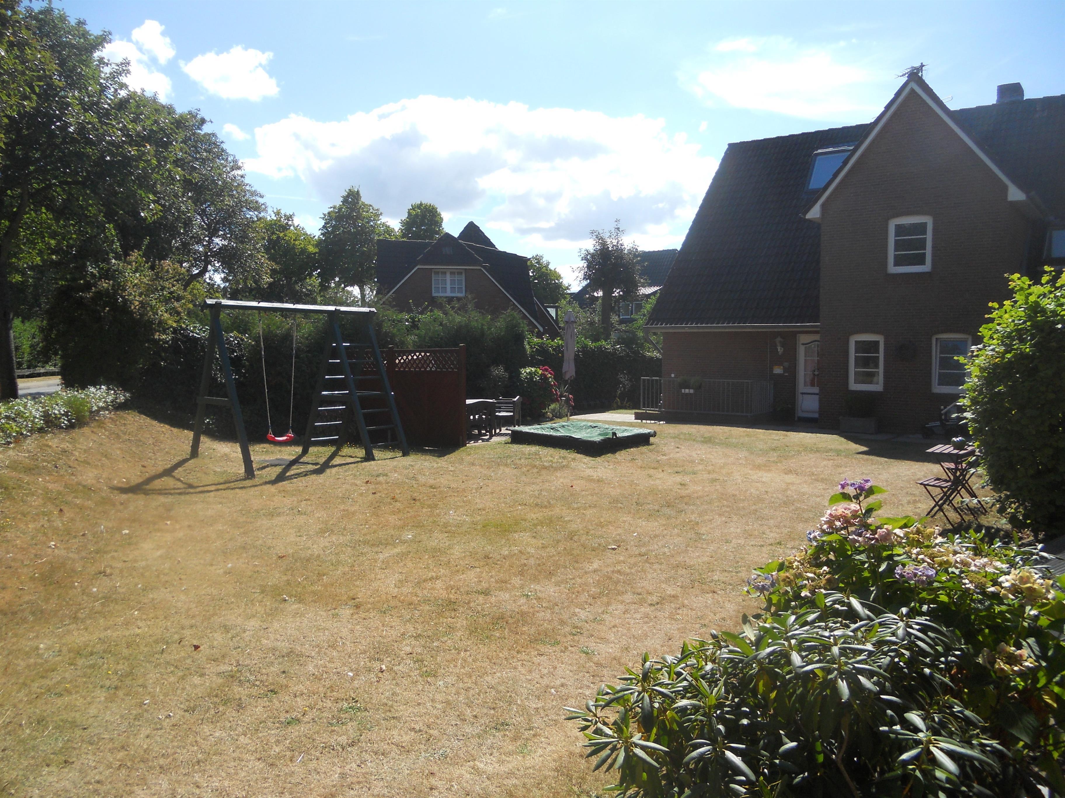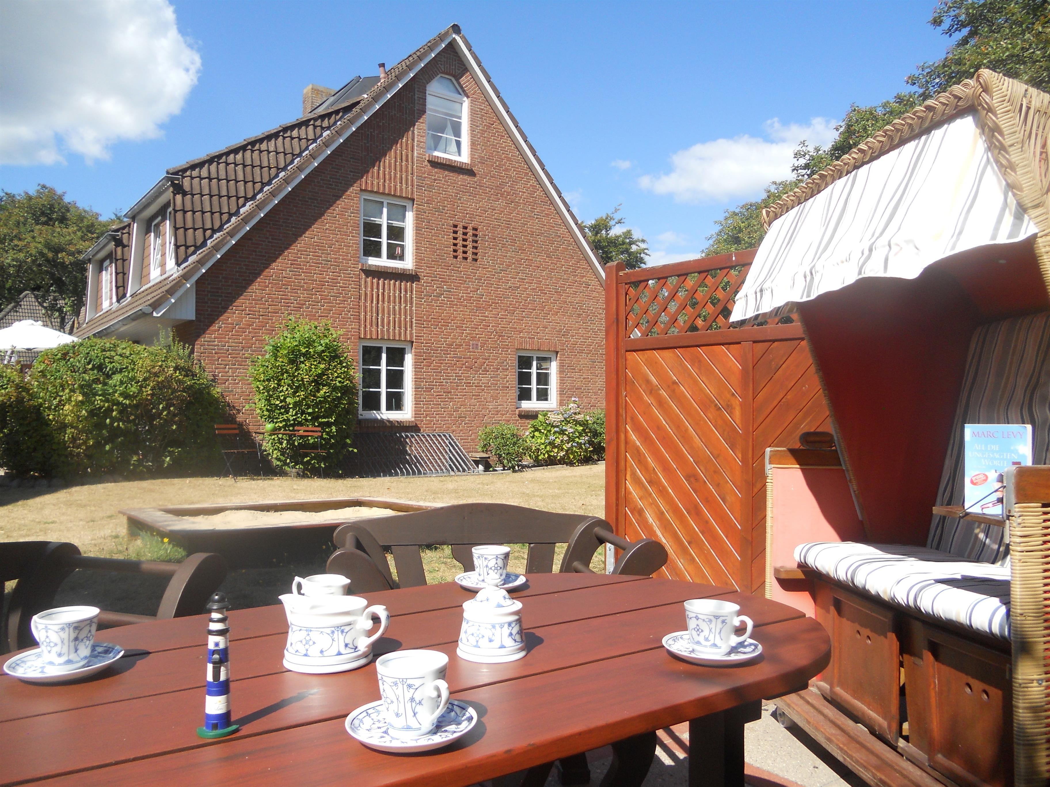 Frühstück im Bett oder doch lieber im angrenzenden Garten? – Beides ist möglich! Der Garten bietet neben einer Sandkiste und einer Schaukel auch eine Sitzecke mit Strandkorb. Hier besteht die Möglichkeit auch zu grillen.