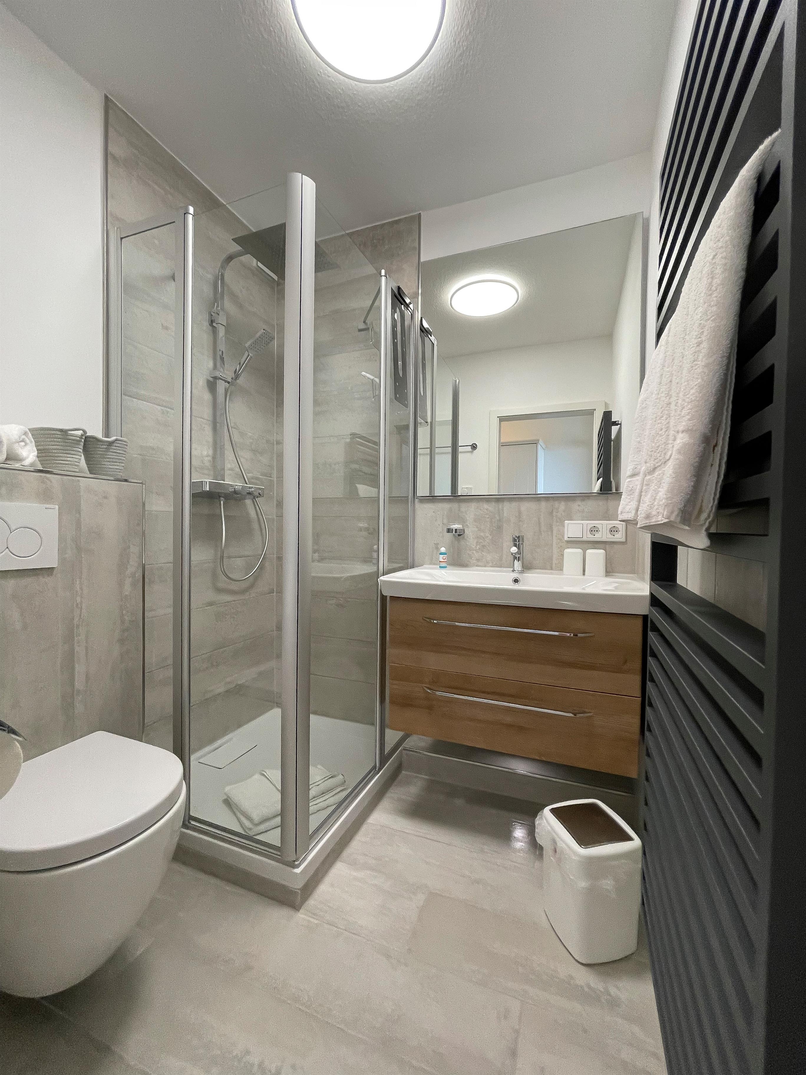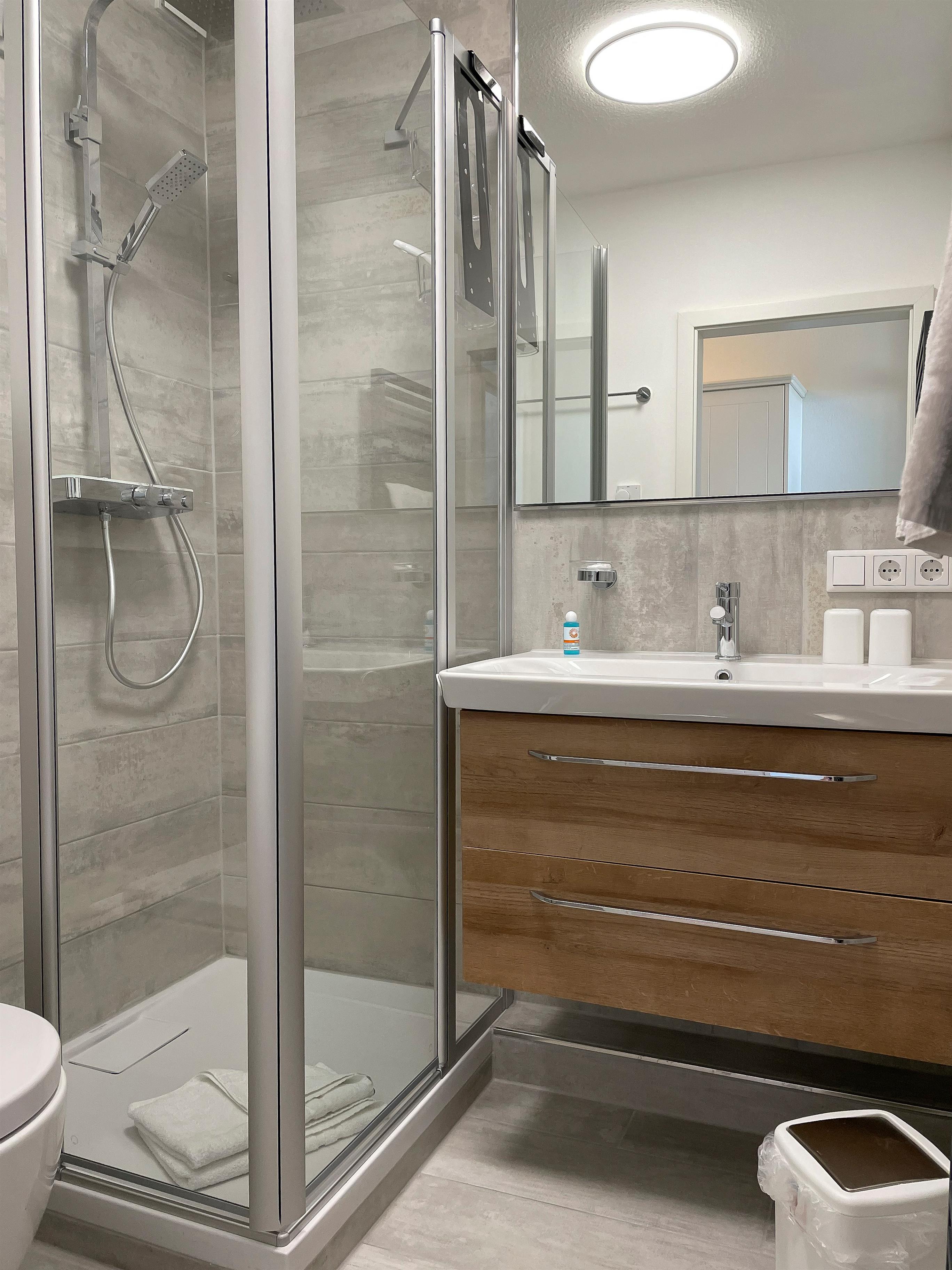 Ein stilvolles Duschbad rundet das Wohlfühlambiente ab.