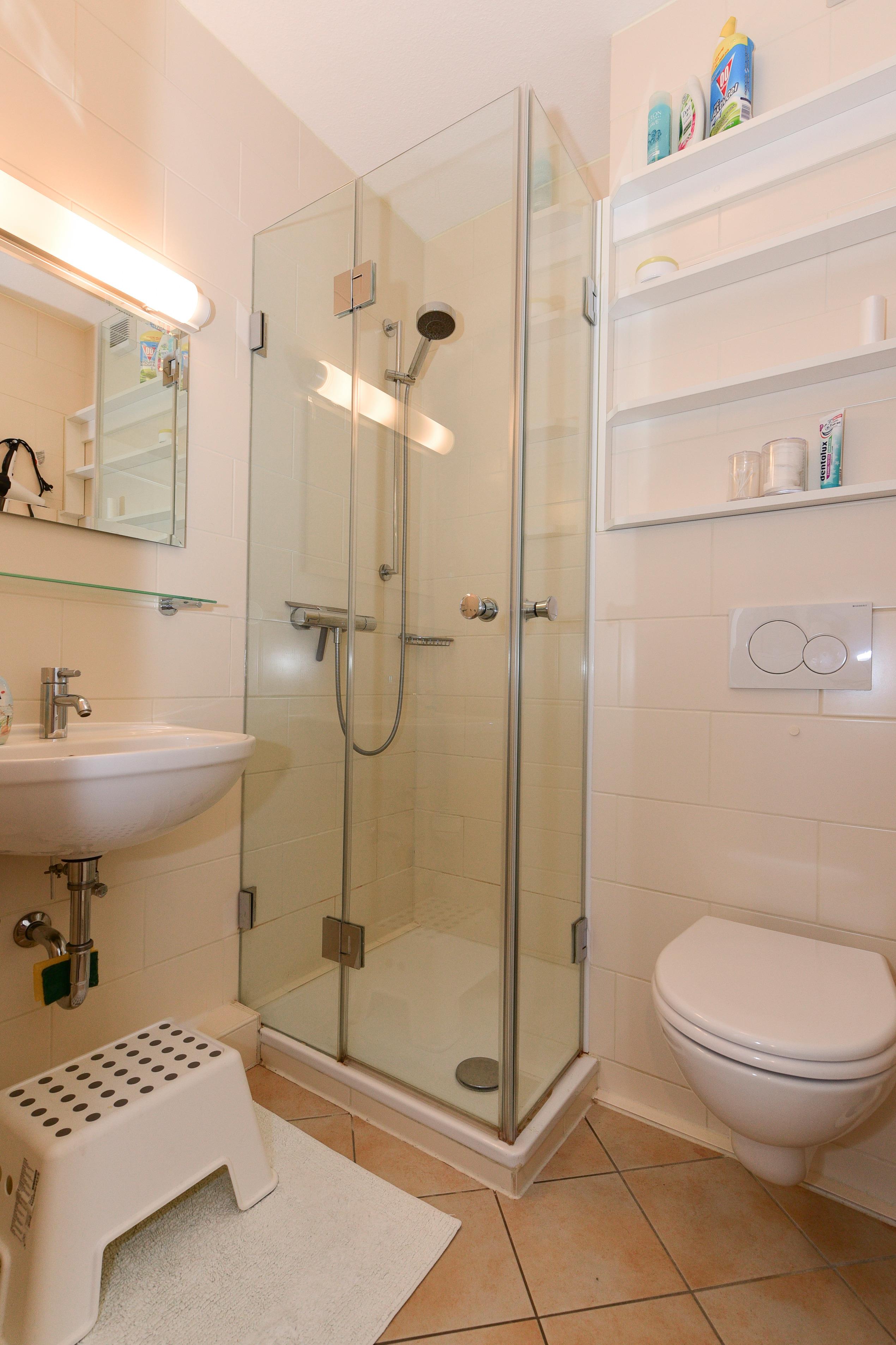 Das helle badezimmer mit Dusche lädt Sie ein, sich nach einem Strandtag zu erfrischen und neue Energie zu tanken.