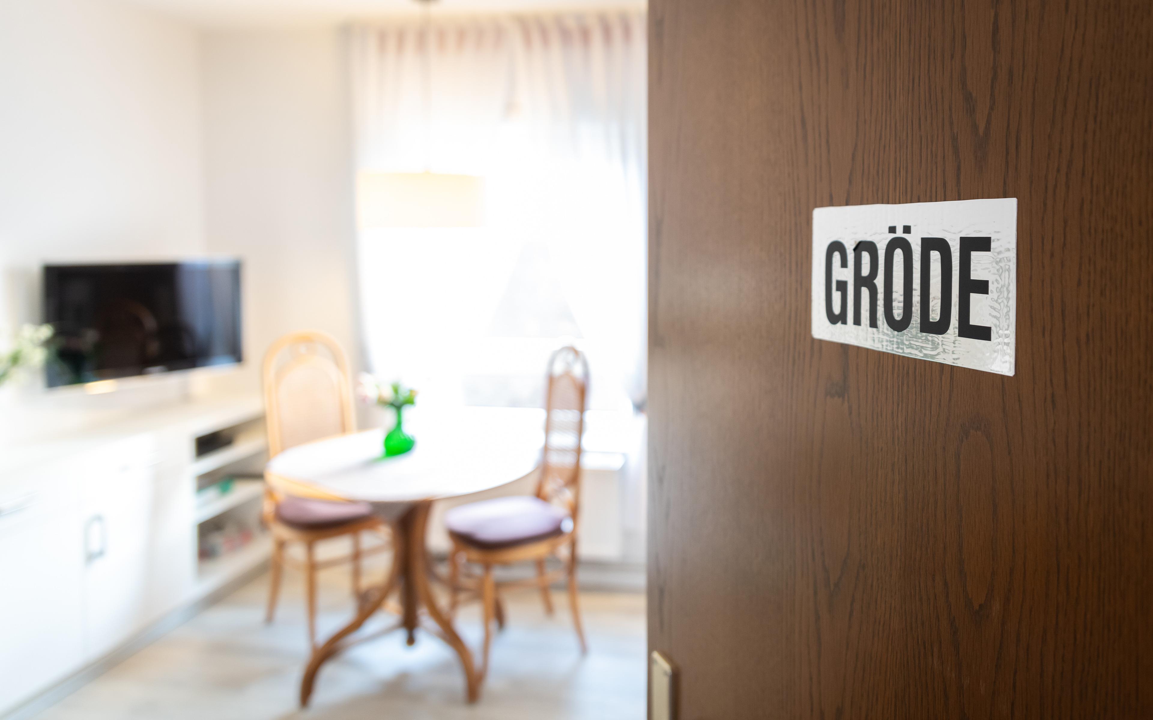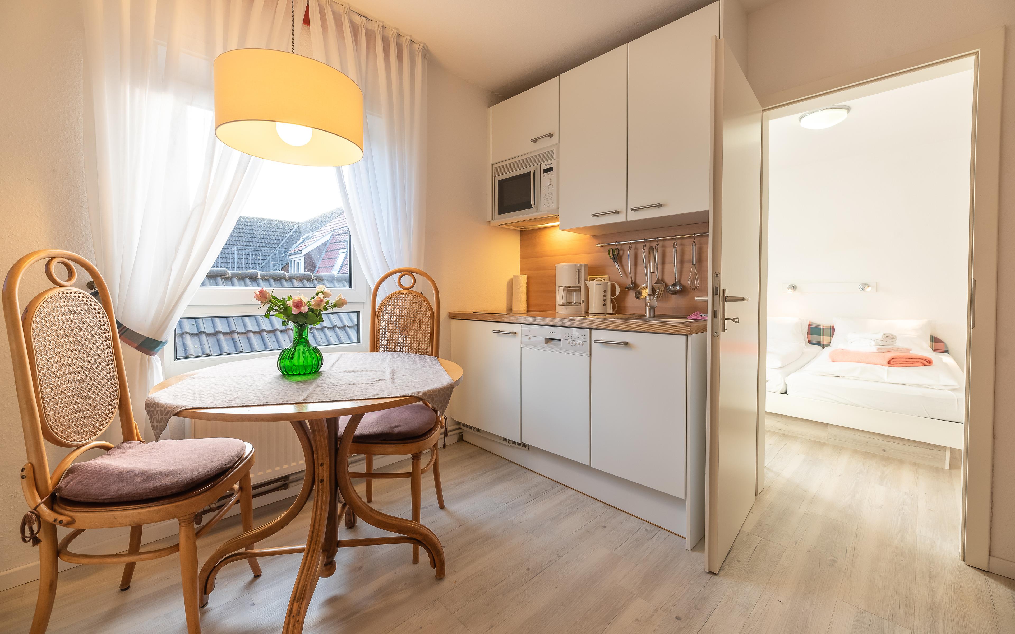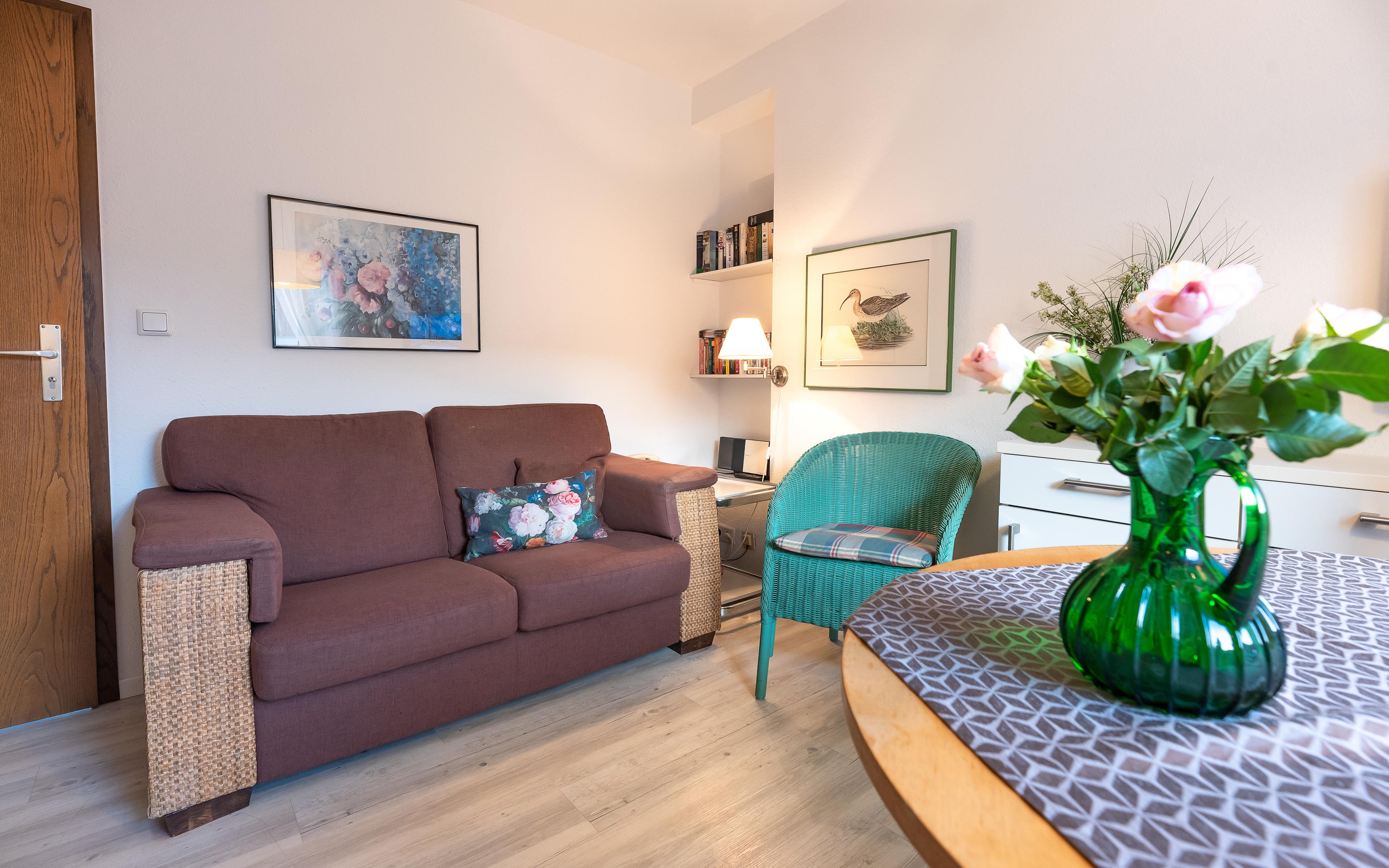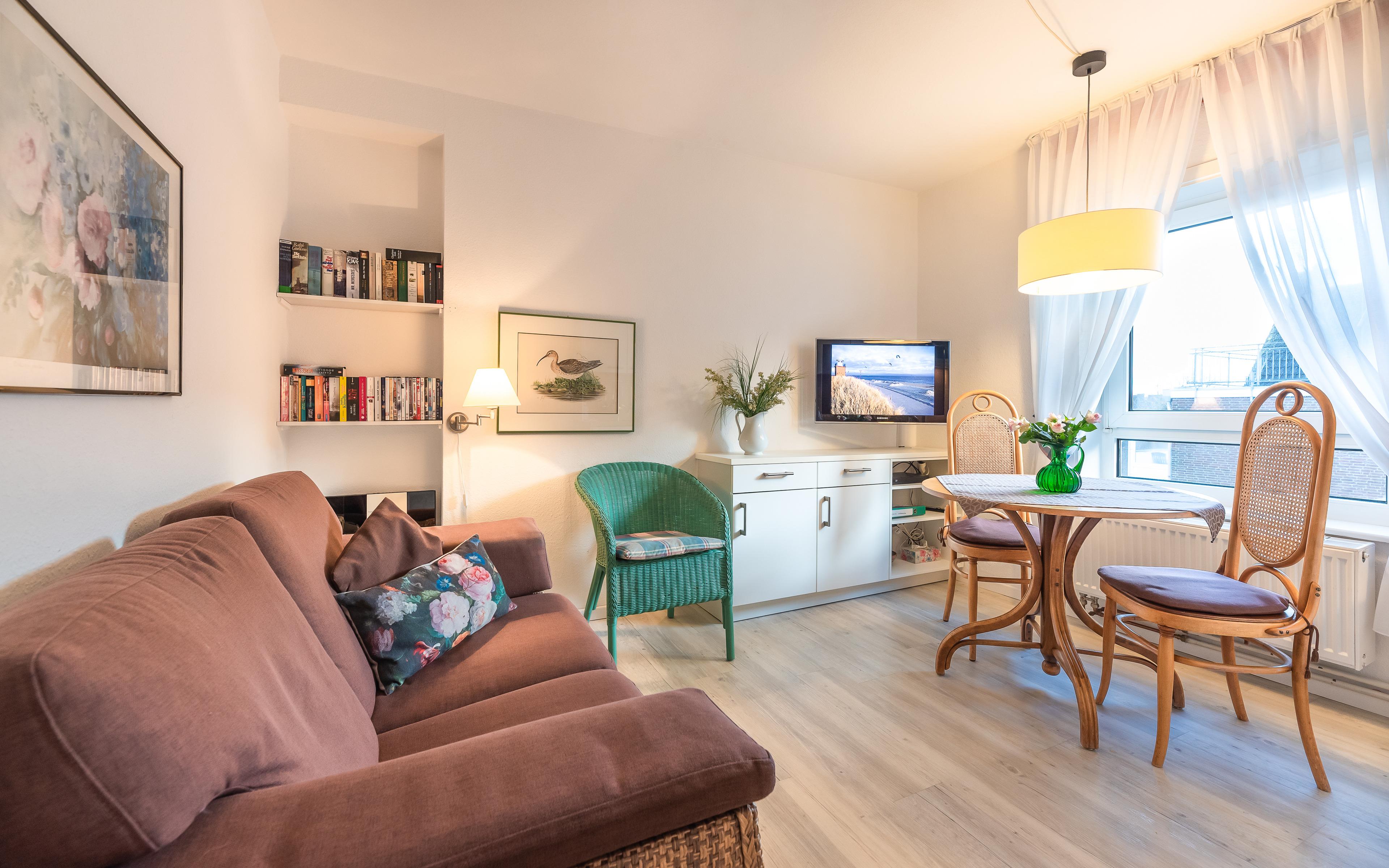 Die kleine aber feine Wohnung "Gröde" liegt ebenfalls im zweiten Stzock des Hauses in der Innenstadt und eignet sich ideal für 1 bis 2 Personen. Der Wohnraum mit Sofa, Essecke und kleiner Küchenzeile ist optimal genutzt und liebevoll hergerichtet. Von hier uas gelangen Sie in das Schlafzimmer mit Doppelbett und Kleiderschrank. Das ans Schlafzimmer angrenzende Bad ist mit einer Dusche und einem beleuchteten Spiegel ausgestattet und verfügt zudem über ein kleines Fenster. In der Wohnung Gröde können Sie herrliche Urlaubstage mitten in der Wyker Innenstadt erleben.
