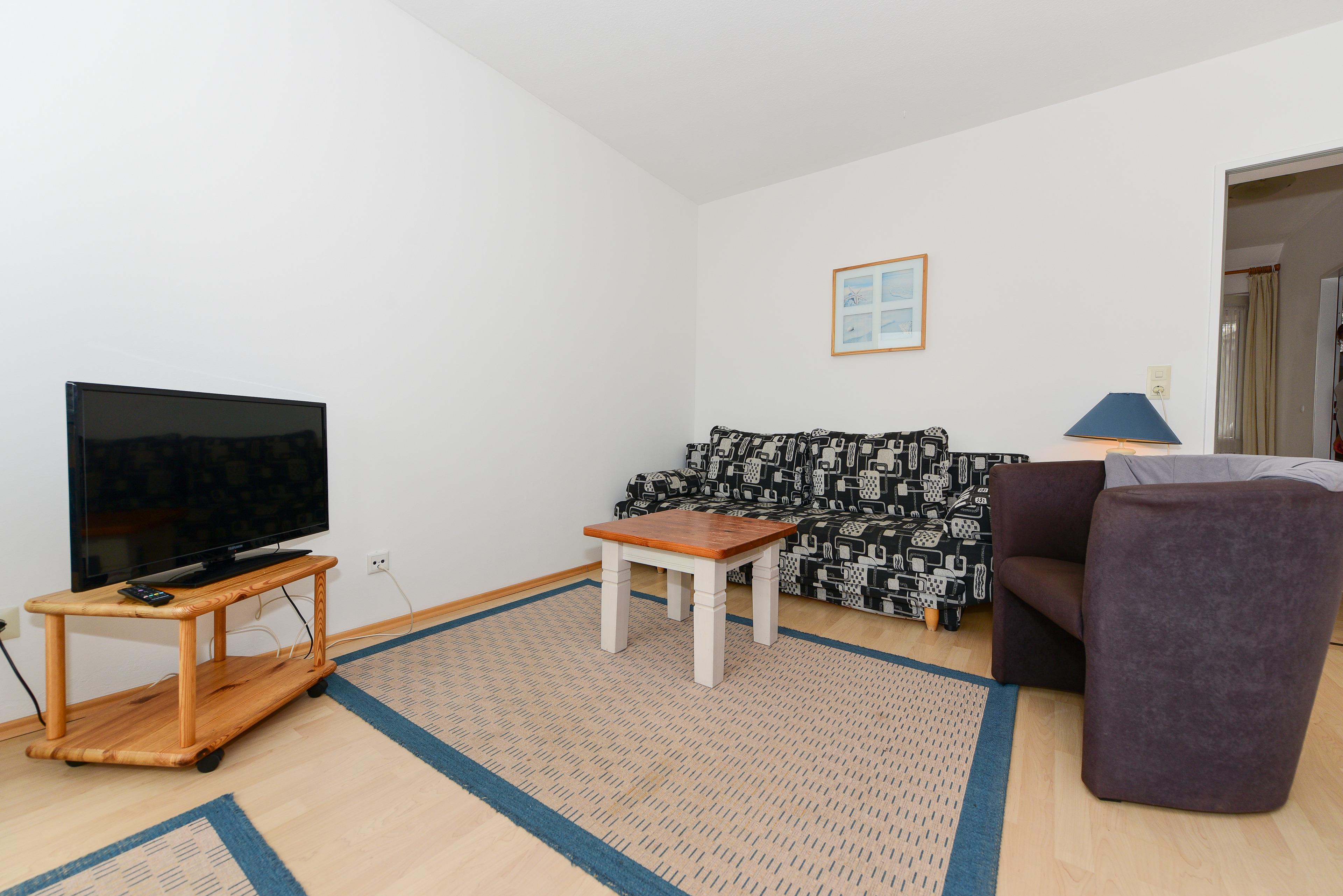 Das geräumige, lichtdurchflutete Wohnzimmer mit Balkon und teilweisem Meerblick lädt zu entspannenden Stunden ein. Das Schlafzimmer ist mit einem komfortablen Doppelbett ausgestattet und zusätzlich bietet das Wohnzimmer eine Schlafcouch.