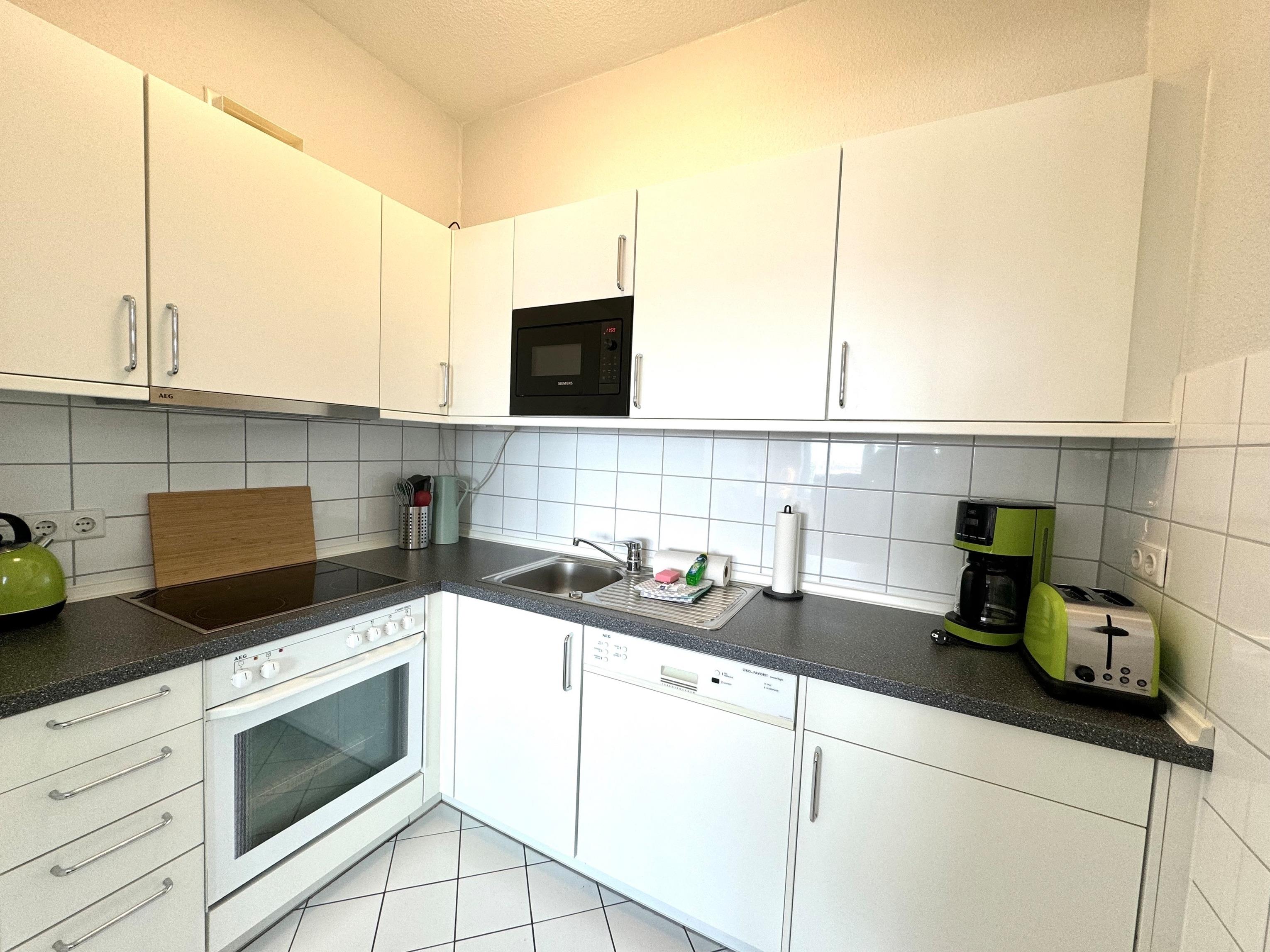 Der angrenzende Küchenbereich ist bestens ausgestattet und lädt zu genussvollen Momenten ein: ein 4-Platten-Cerankochfeld mit Backofen, Kühlschrank mit kleinem Gefrierfach, Mikrowelle, Geschirrspülmaschine, Filterkaffeemaschine, Toaster und Wasserkocher sowie umfangreiche Kochutensilien stehen Ihnen zur Verfügung. Perfekt für ein entspanntes Frühstück im ersten Sonnenlicht oder ein spätes Dinner nach einem langen Strandtag.