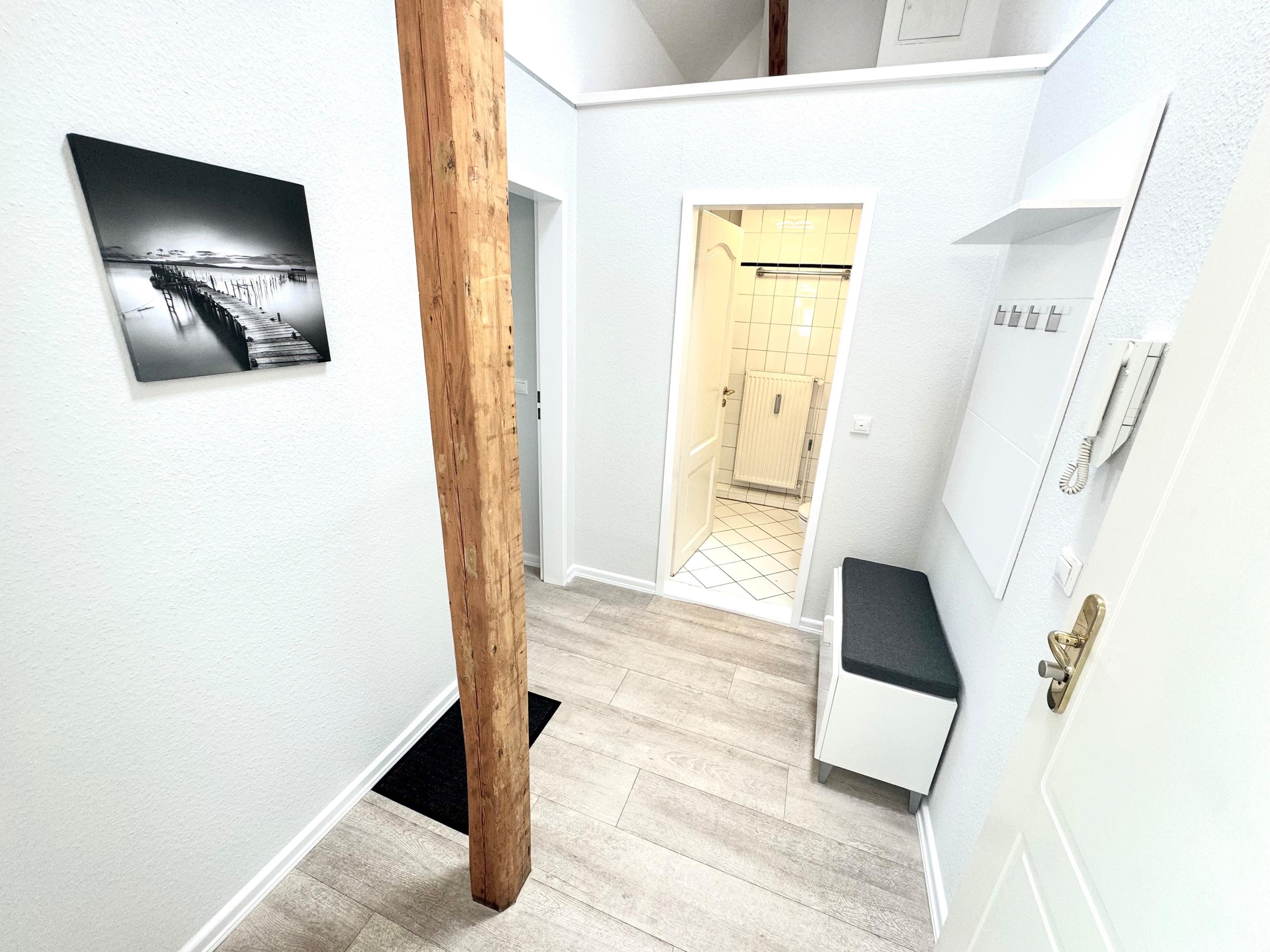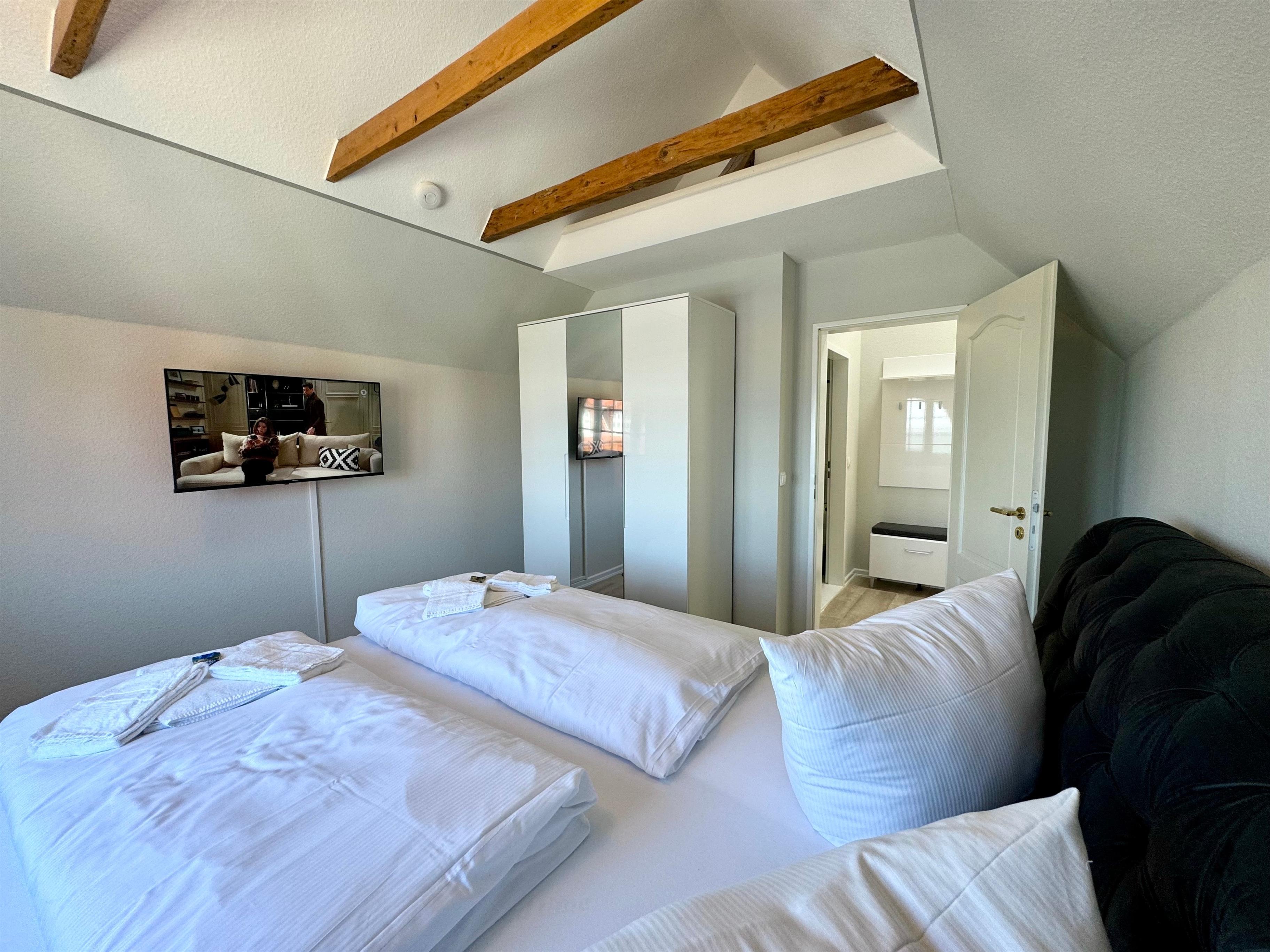 In dieser Ferienwohnung befindet sich ein modernes Schlafzimmer mit Boxspring-Doppelbett und SAT-TV. Ebenso vom Flur ausgehend erreichen Sie das Wannenbad mit Bade- und Duschamatur und WC.