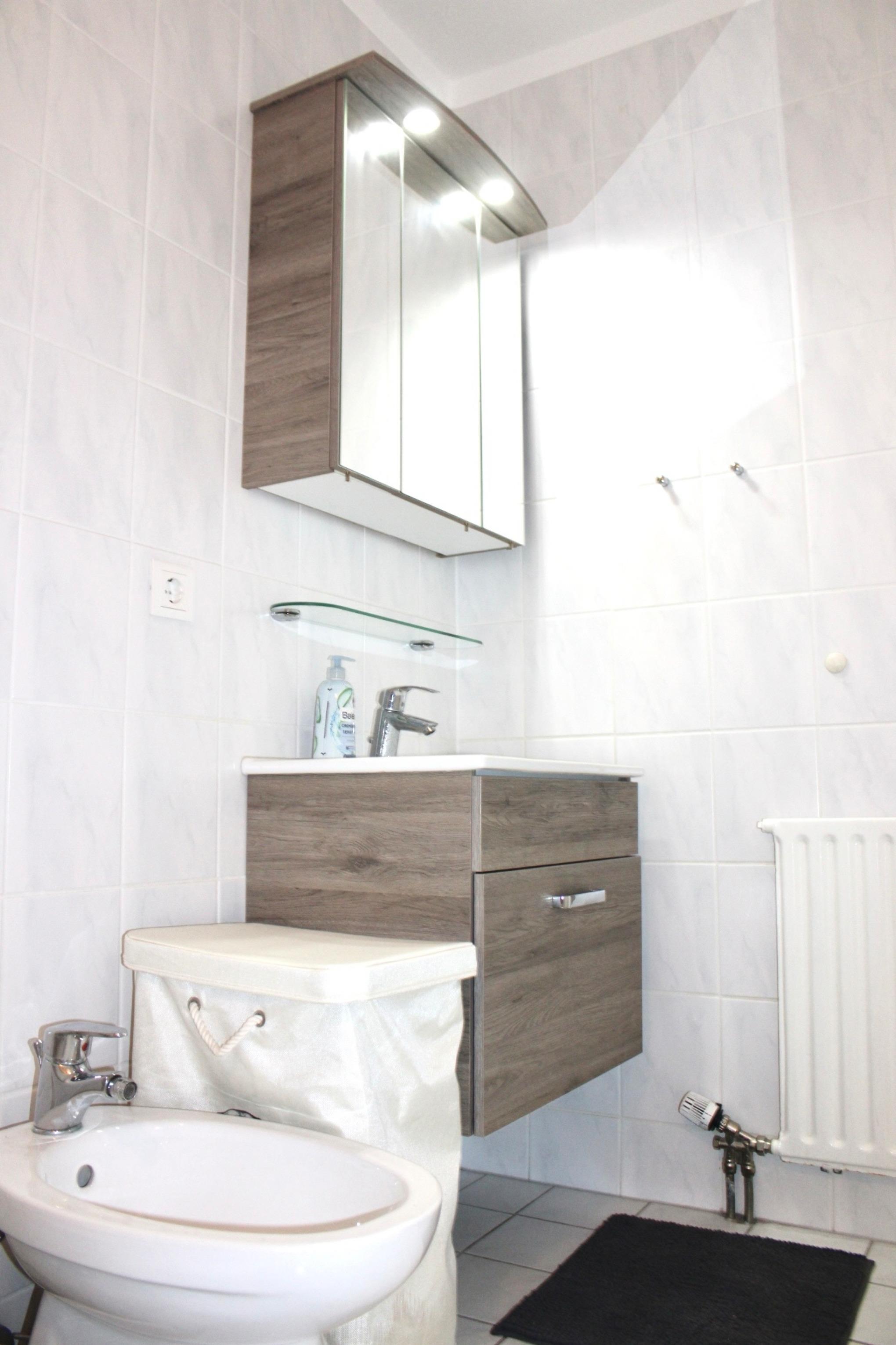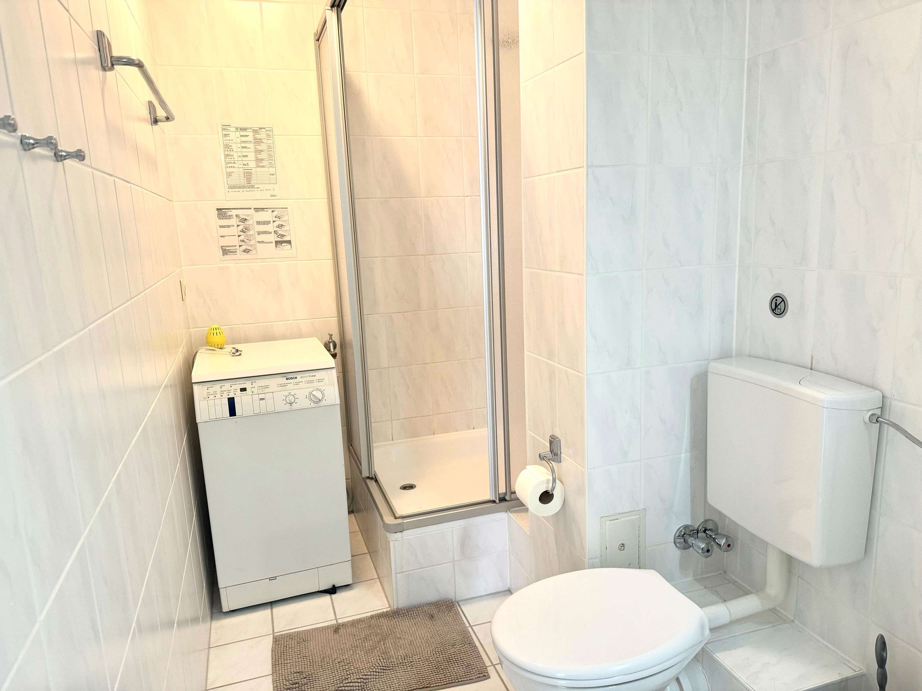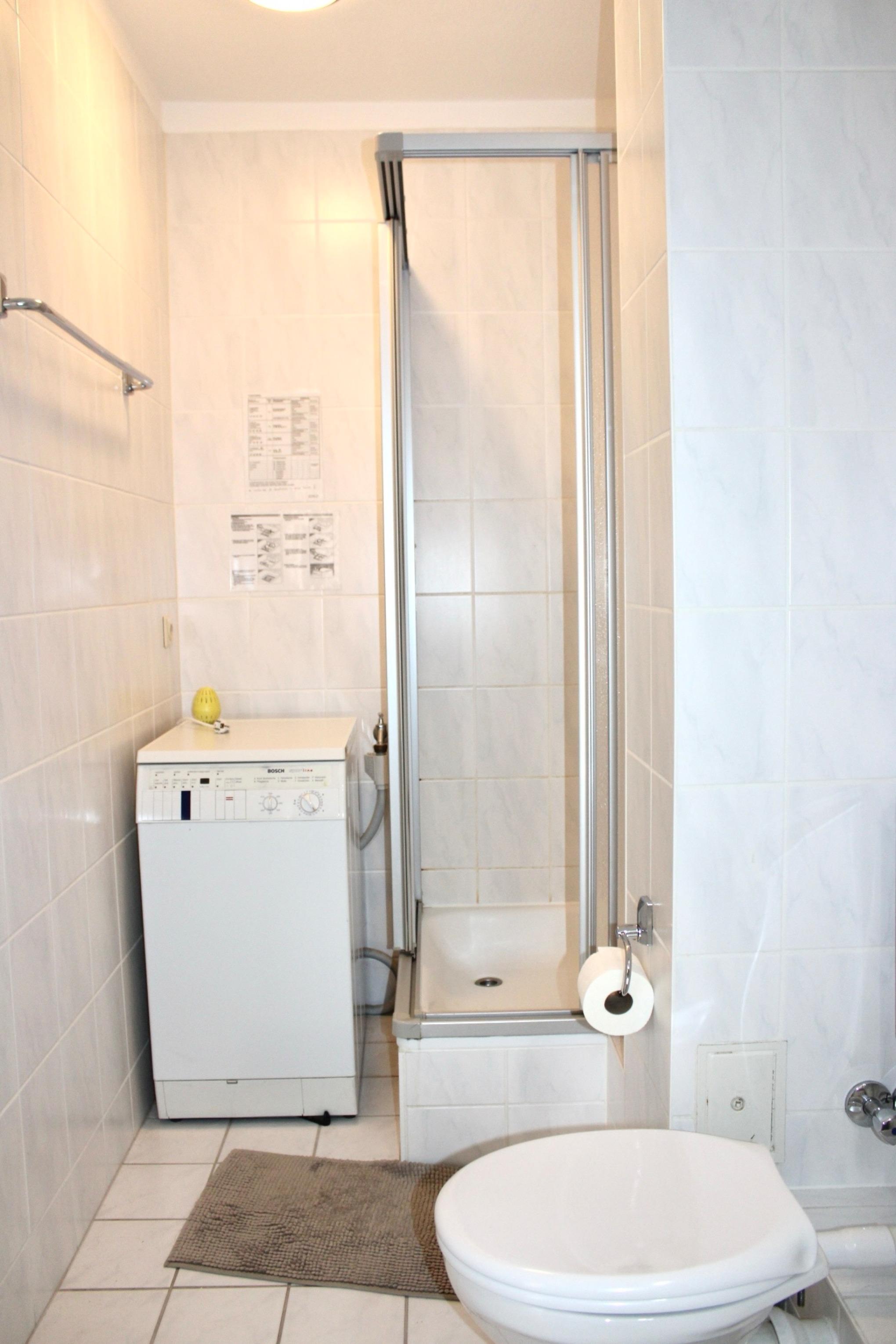 Das Badezimmer ist praktisch eingerichtet. Eine Wachmaschine steht dort kostenfrei zur Verfügung.