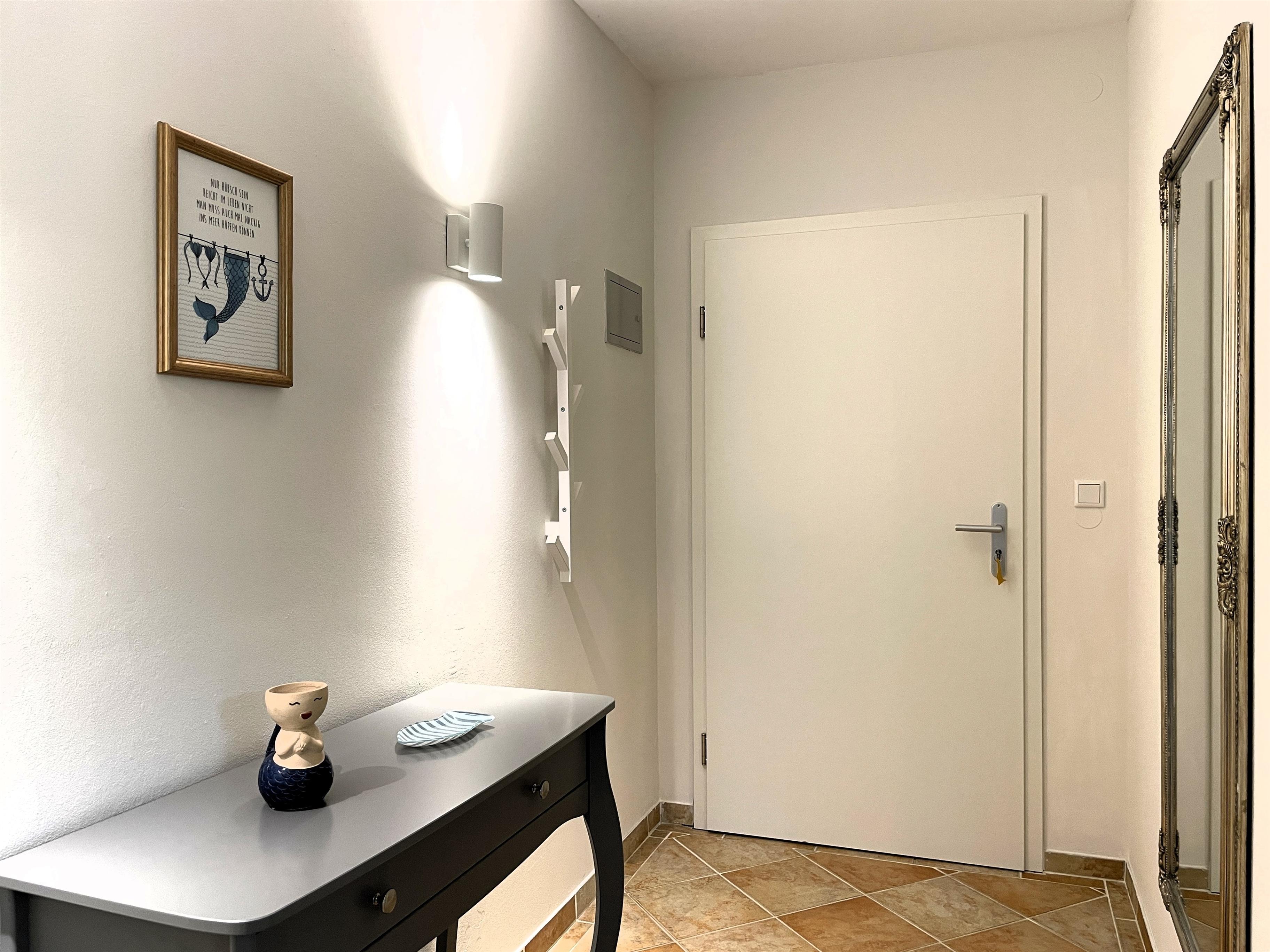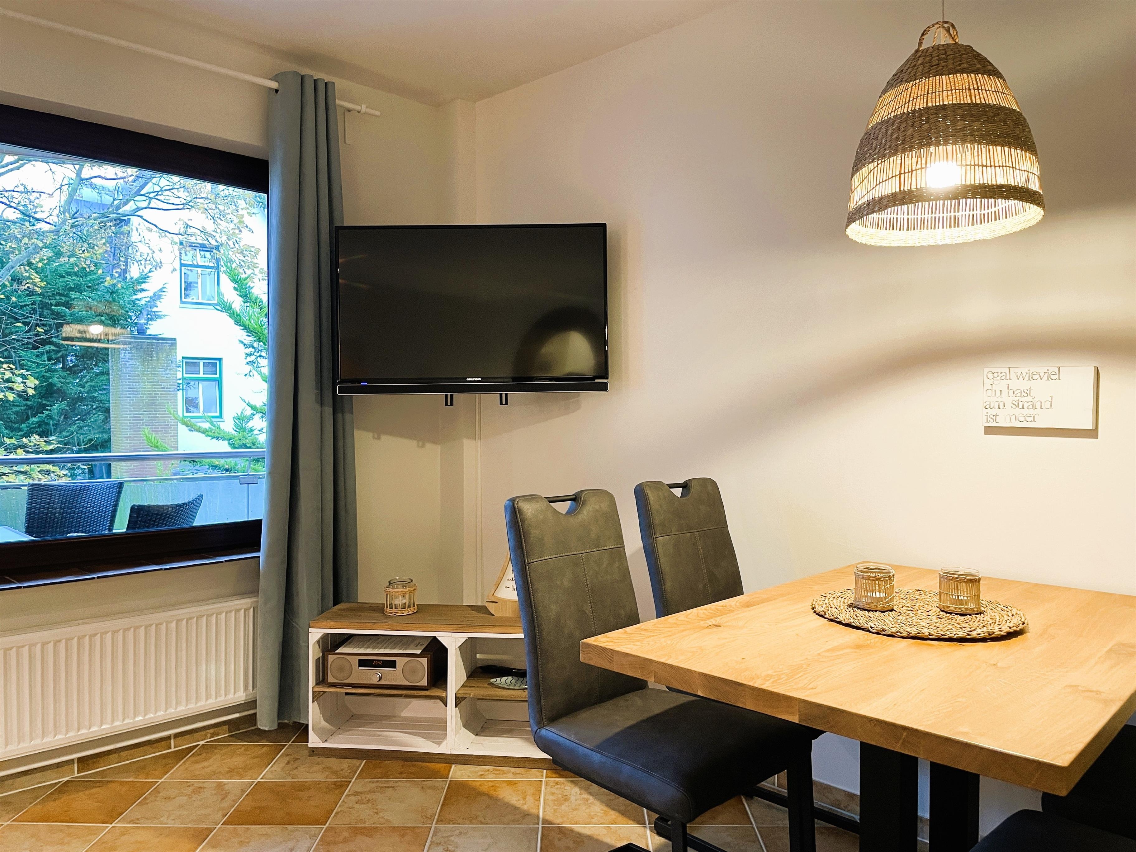 Das helle Wohnzimmer mit WLAN, Radio und TV mit angrenzender, gut ausgestatteter Küche lädt zum Verweilen ein. Von hier aus gelangen Sie auf den sonnigen Südbalkon - ideal für entspannte Momente im Freien. Das separate Schlafzimmer mit Doppelbett hat einen maritimen Flair und eine Lampe mit Ventilator. Das Fenster ist zum Flur ausgerichtet. Das Badezimmer ist funktional mit Wanne, WC und Lüftung ausgestattet. Familien mit Kindern und Haustierbesitzer sind in dieser rauchfreien Ferienwohnung herzlich willkommen. Die zentrale Lage auf Föhr ermöglicht Ihnen, die Schönheit der Insel mühelos zu erkunden.