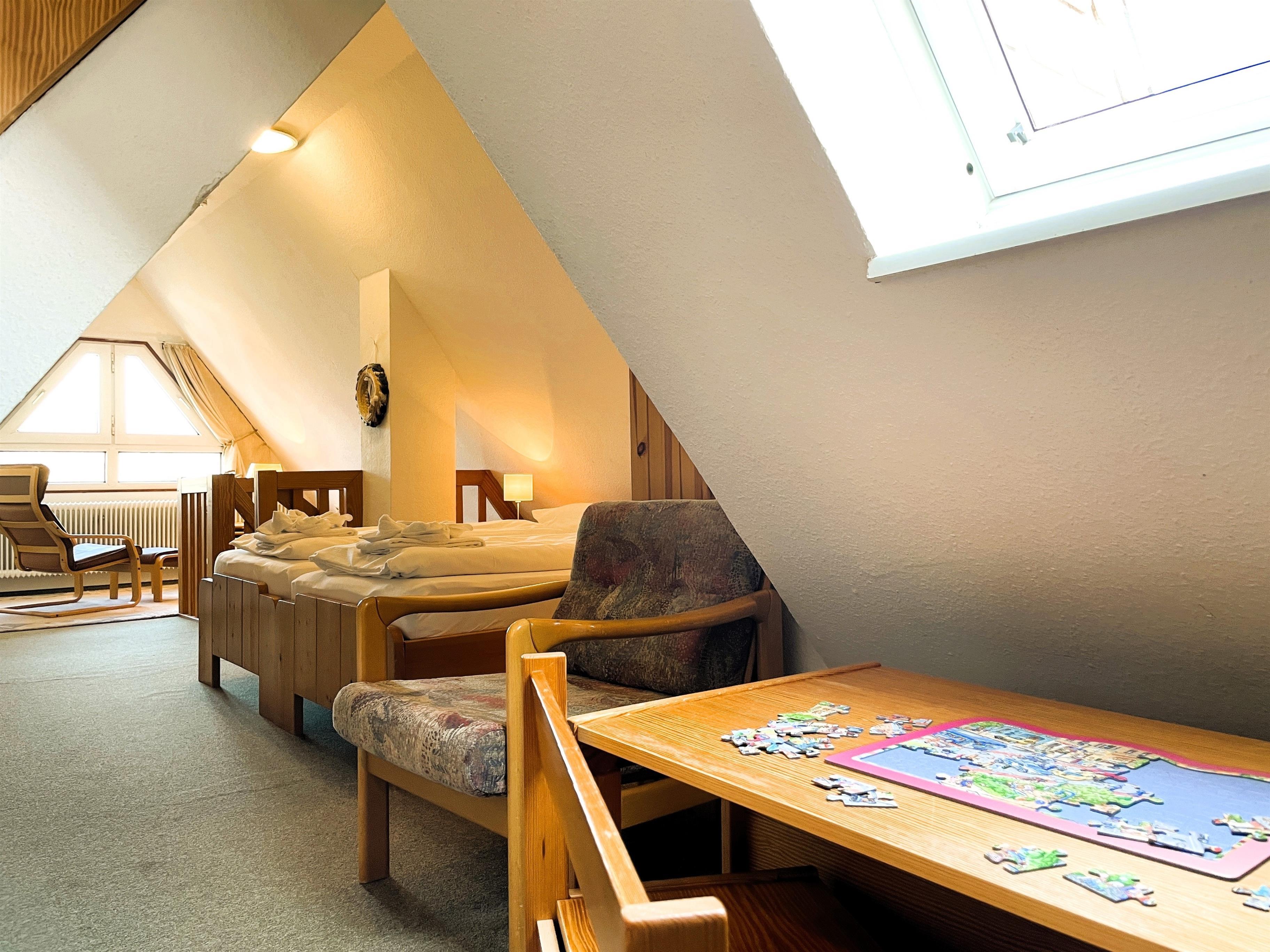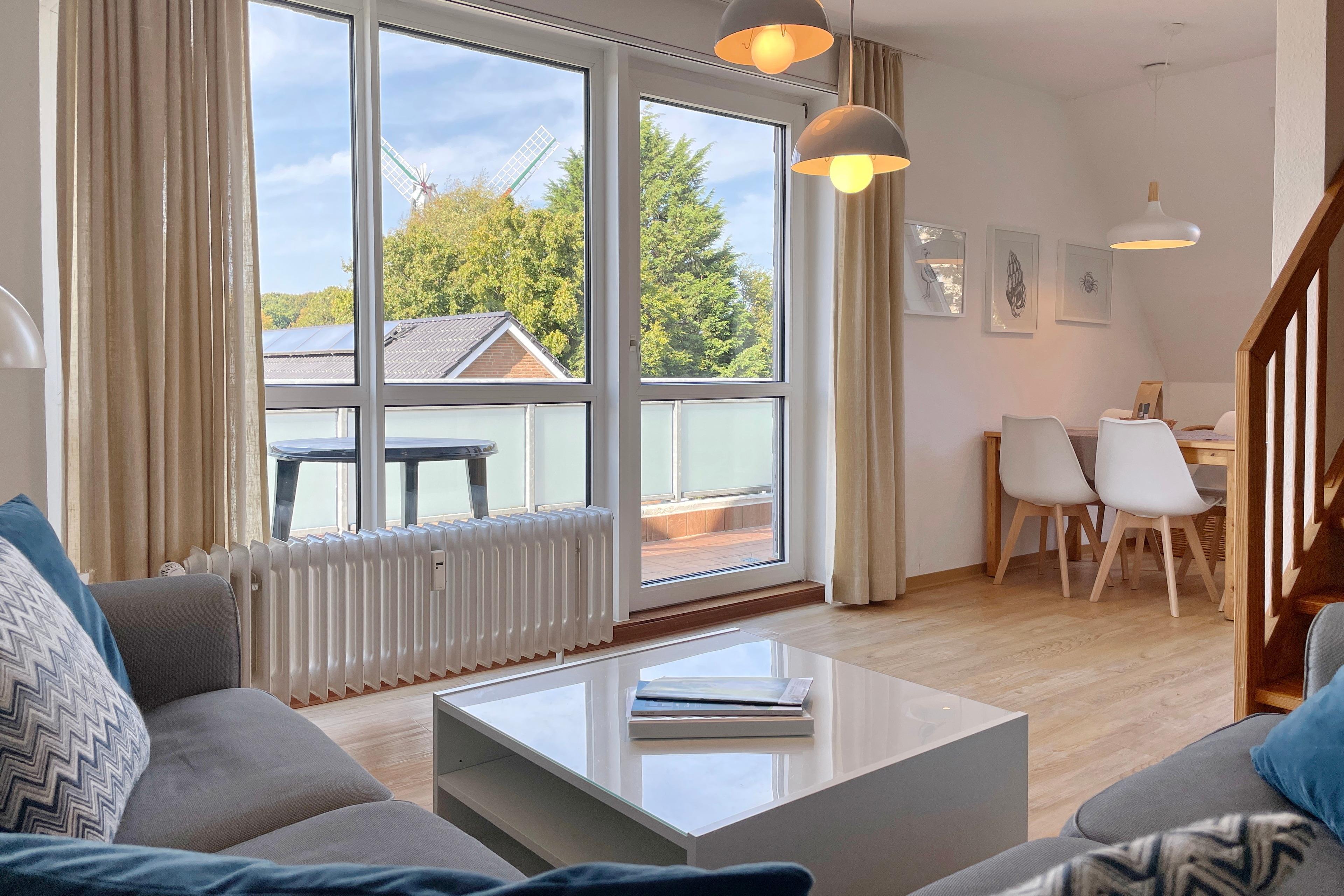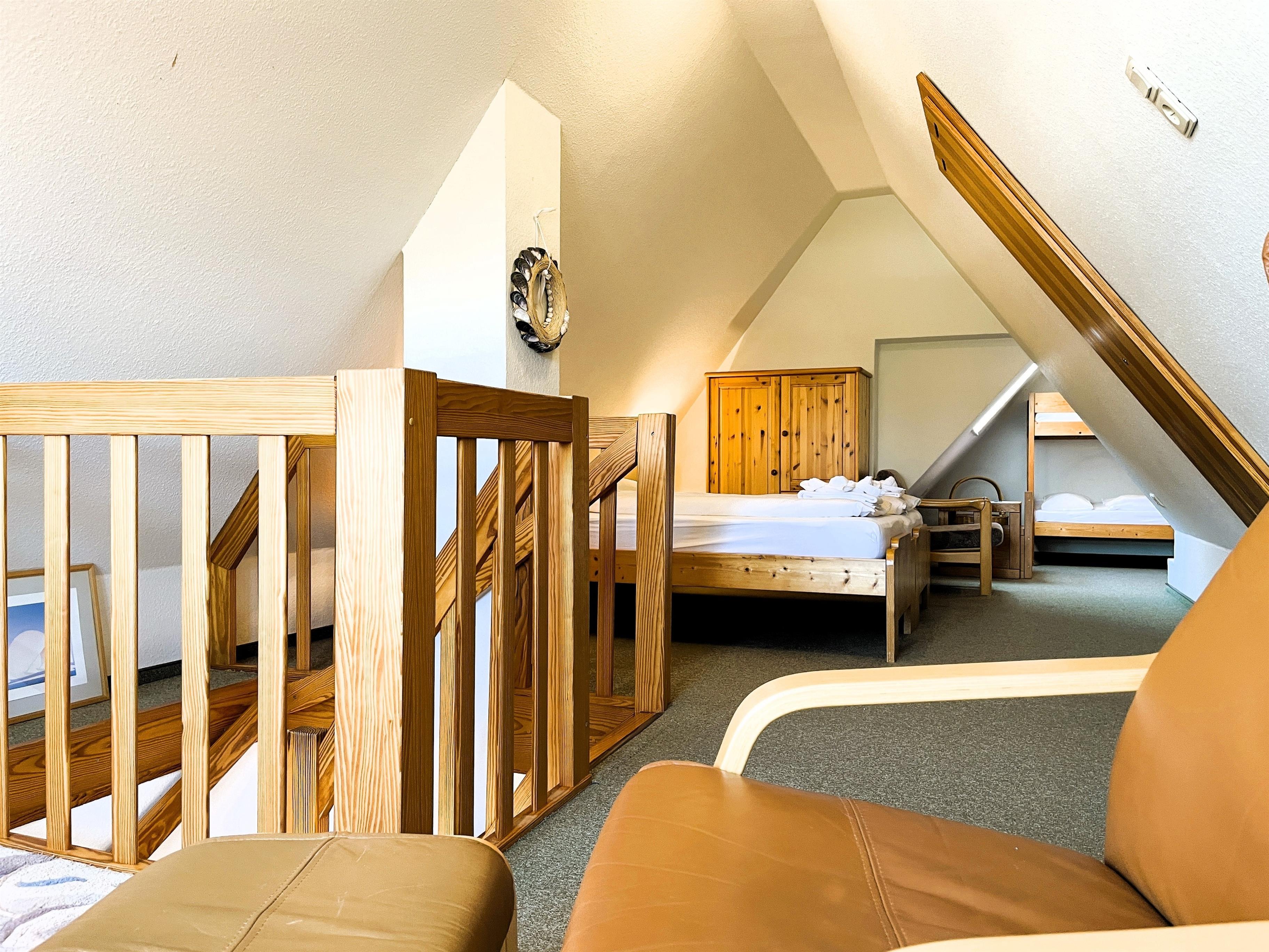 Unser Seeadler 14 ist eine helle Maisonette-Wohnung in der beliebten Anlage Seeadler am Sandwall - unweit der Wyker Innenstadt. Genießen Sie herrliche Urlaubstage in dieser charmanten Wohnung. Maritime Accessoires geben der Wohnung ihren nordfriesischen Charme. Im zweiten Stock befindet sich der Wohnraum mit einer bequemen Couch, einer integrierten Essecke und einer gut ausgestatteten Küchenzeile. Das Bad ist mit Dusche ausgestattet. Im Schlafzimmer laden zwei Einzelbetten zum Ausschlafen ein. Auf der offenen dritten Etage befindet sich neben einer Leseecke mit Blick auf die Wyker Mühle und ein Doppelbett zum Träumen. Direkt angrenzend steht ein Etagenbett und ein Maltisch für die Kleinen bereit. Im Sommer können Sie auf dem Balkon relaxen, der von ca. Mai bis September mit Gartenmöbeln ausgestattet ist. Schauen Sie gleich nach freien Zeiten in unserem Seeadler 14 und buchen Sie Ihre erholsame Föhrer Auszeit!