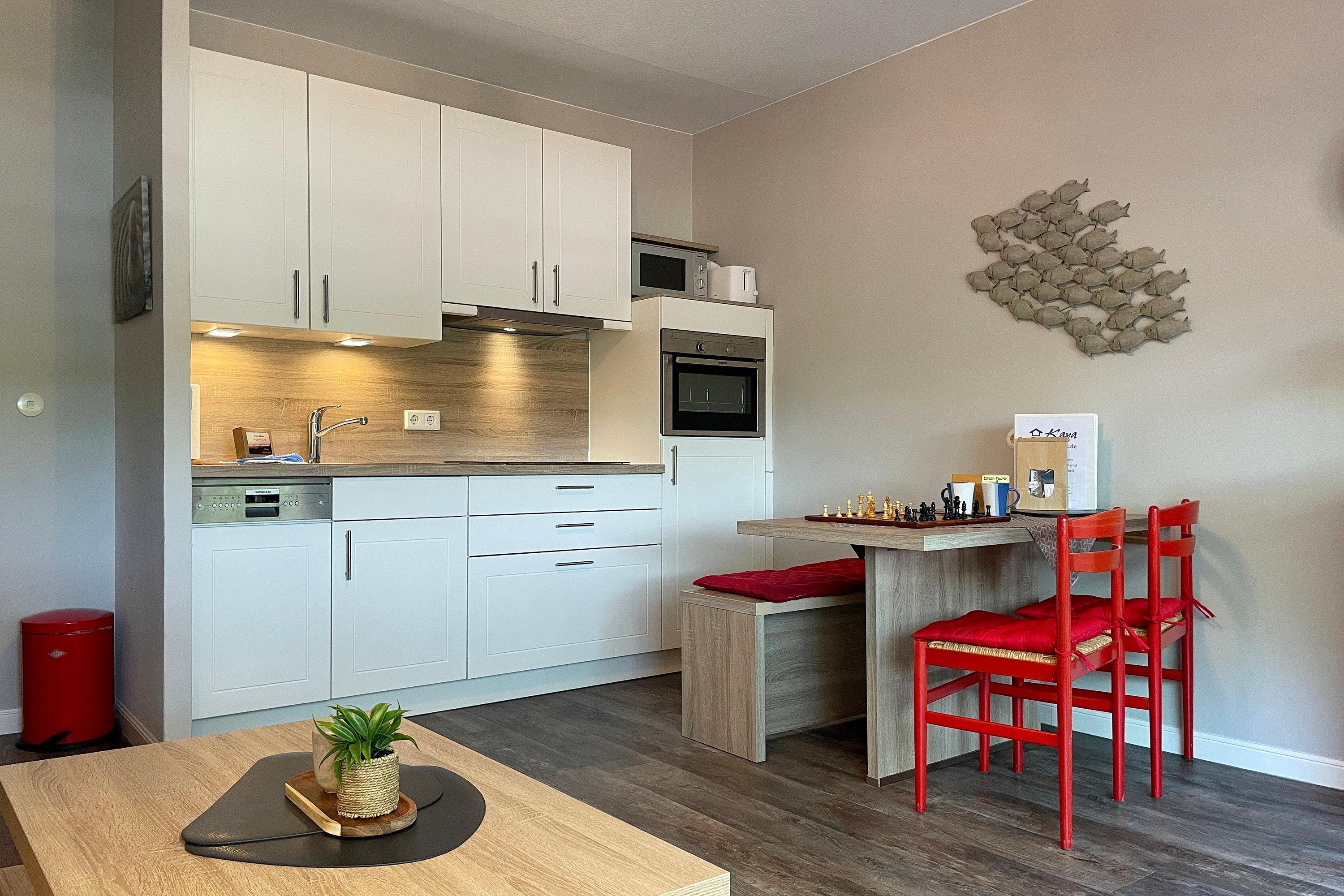 Unser gemütliches Wohnzimmer lädt zum Entspannen ein und bietet eine gemütliche Sitzecke sowie eine Essgruppe, an der Sie Ihre Mahlzeiten genießen können. Die gut ausgestattete Küchenzeile lässt keine Wünsche offen – ob Frühstück, Mittagessen oder Abendessen, hier können Sie nach Herzenslust kochen. Moderne Annehmlichkeiten wie WLAN und TV sorgen dafür, dass Sie auch im Urlaub immer bestens vernetzt bleiben. Das Badezimmer mit Fußbodenerwärmung ist mit einer komfortablen Dusche und einem Handtuchheizung ausgestattet und verfügt über eine Waschmaschine, den Sie kostenfrei nutzen können – ideal für längere Aufenthalte. Das separate Schlafzimmer bietet zwei bequeme Einzelbetten (90 x 200 cm), die für erholsame Nächte sorgen. Unser Seeblick 16 befindet sich in einer der besten Lagen auf Föhr: direkt am beliebten Sandwall, der Strandpromenade von Wyk. Von hier aus erreichen Sie den Strand, gemütliche Cafés, Restaurants und Einkaufsmöglichkeiten in wenigen Minuten zu Fuß. Genießen Sie den Blick auf das Meer oder unternehmen Sie ausgedehnte Spaziergänge entlang der Küste.