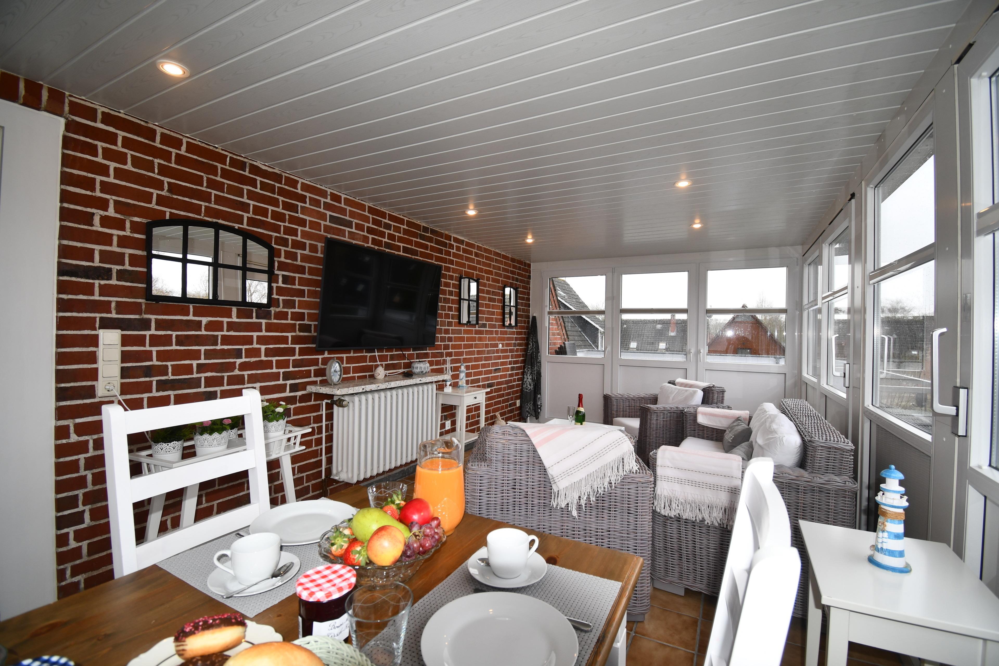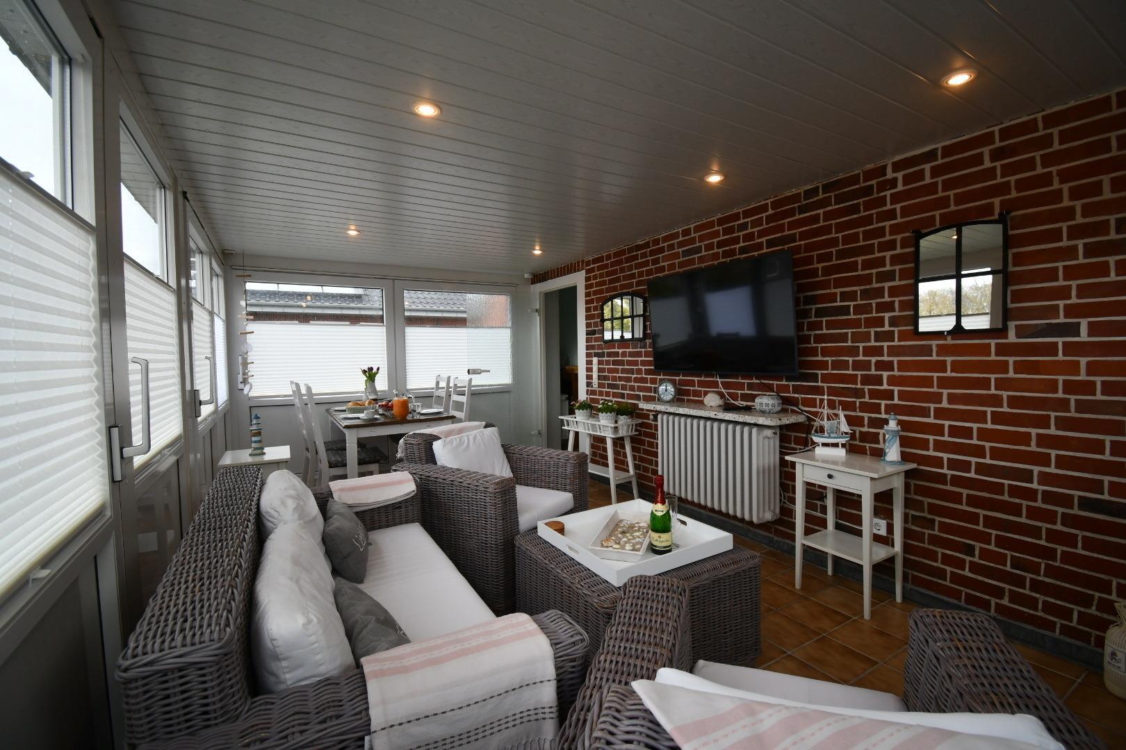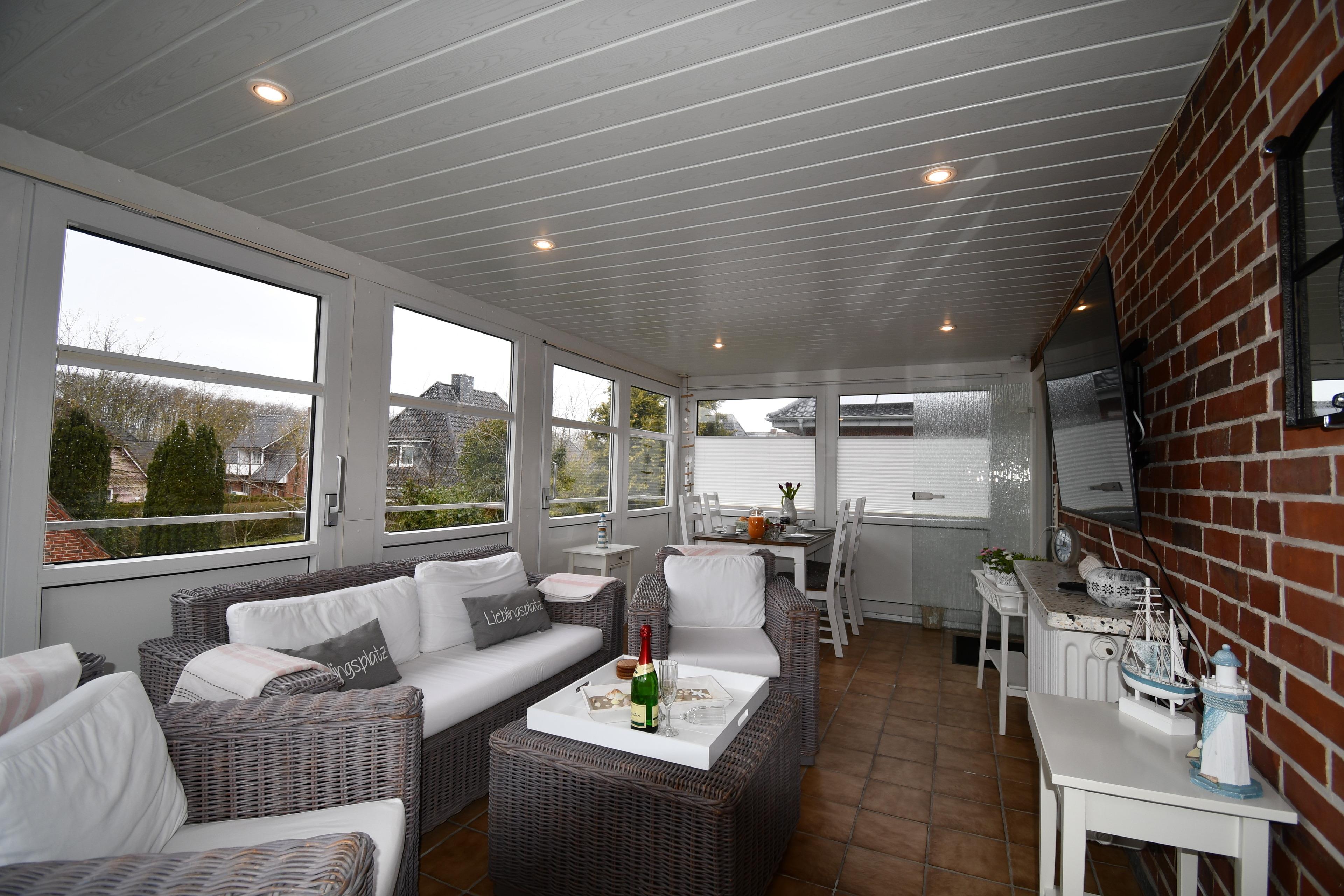Wintergarten: Sofa, 2 Sessel, Couchtisch und Esstisch mit Stühlen