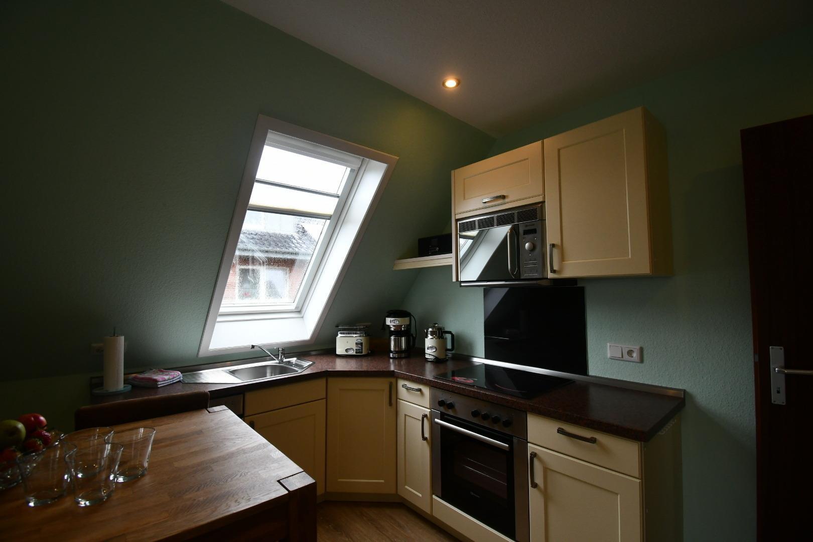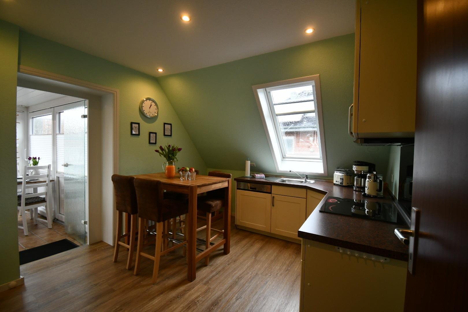 Küche: Kühlschrank mit extra Gefrierfach, Mikrowelle, Ceran Kochfeld und Backofen, Spülmaschine, Kaffeemaschine, Toaster und andere Utensilien für ein gelungenes Frühstück oder ein selbst gekochtes Menü. Hier nehmen Sie Ihre Speisen am Bar-Tisch mit Barhockern ein.