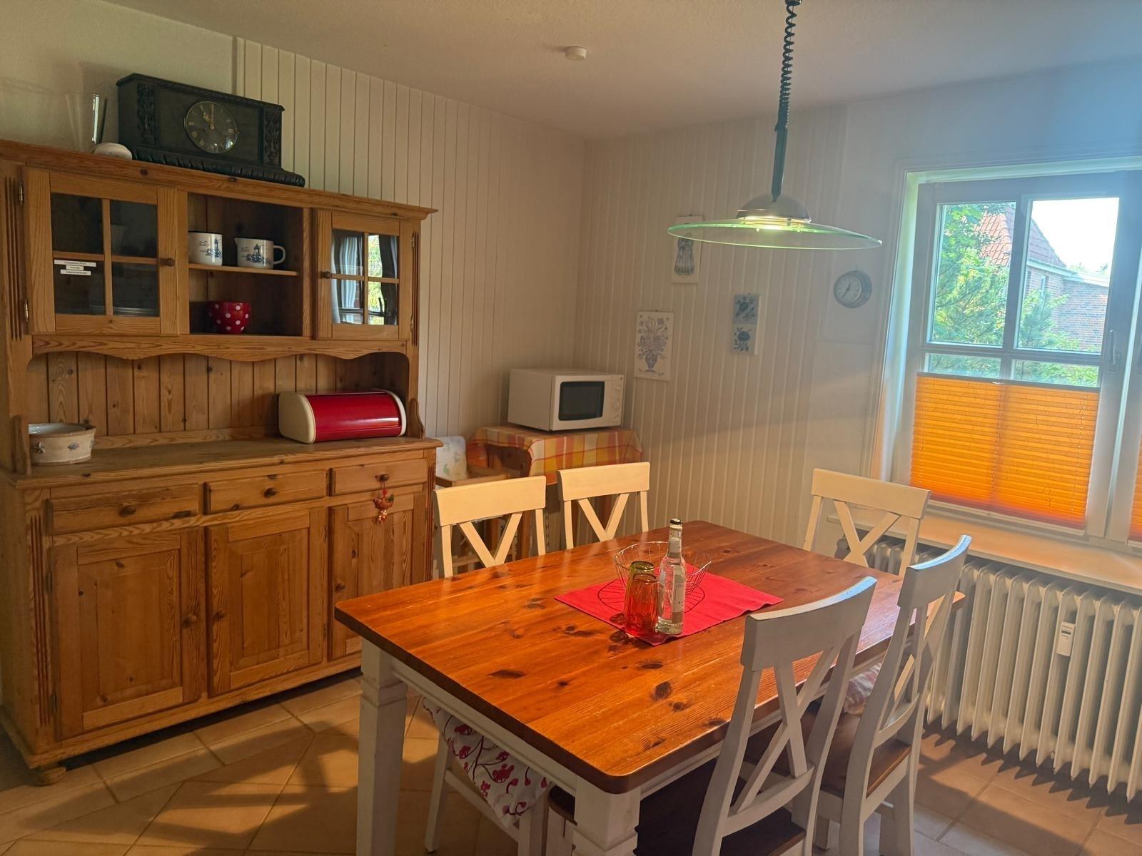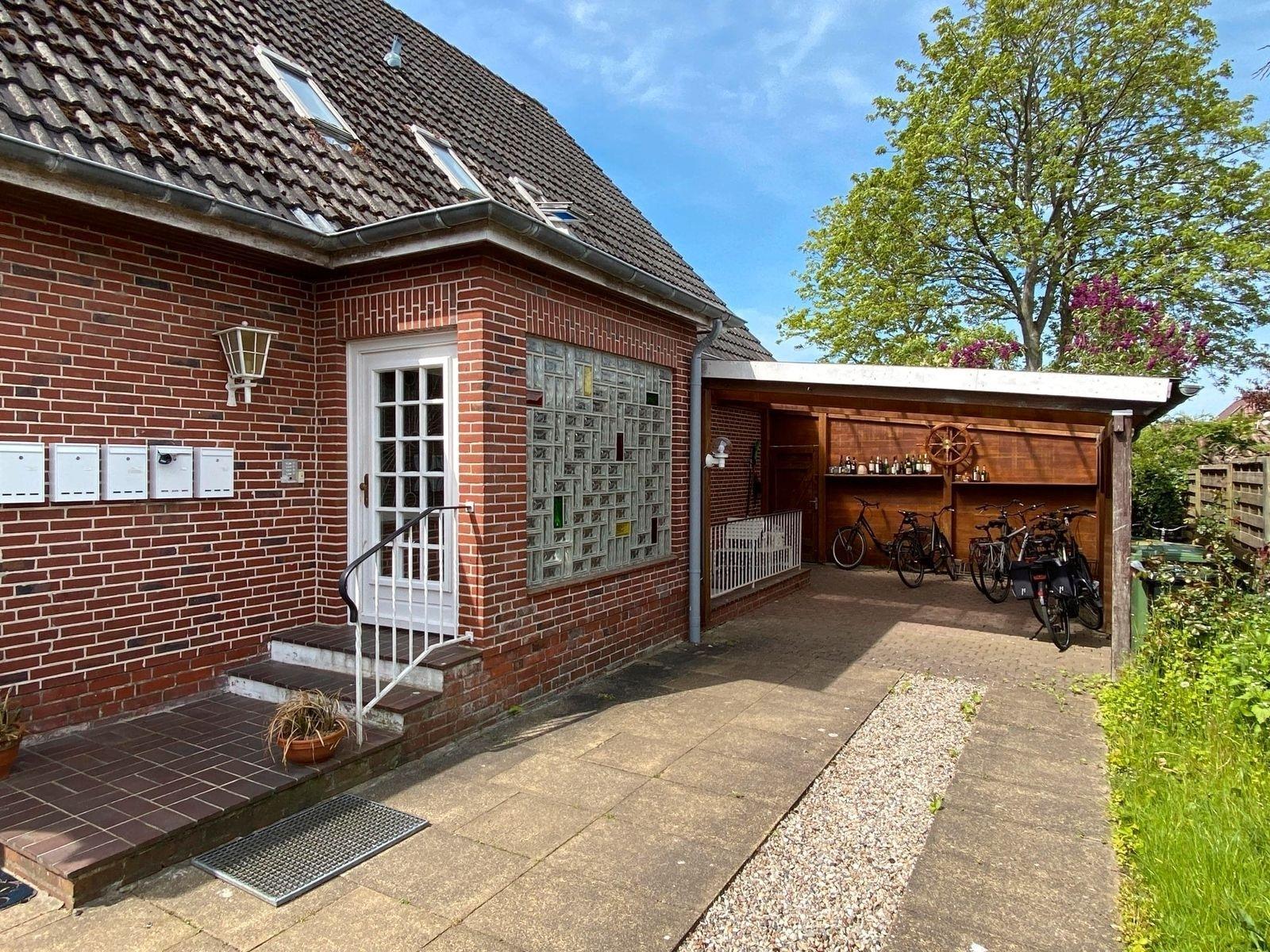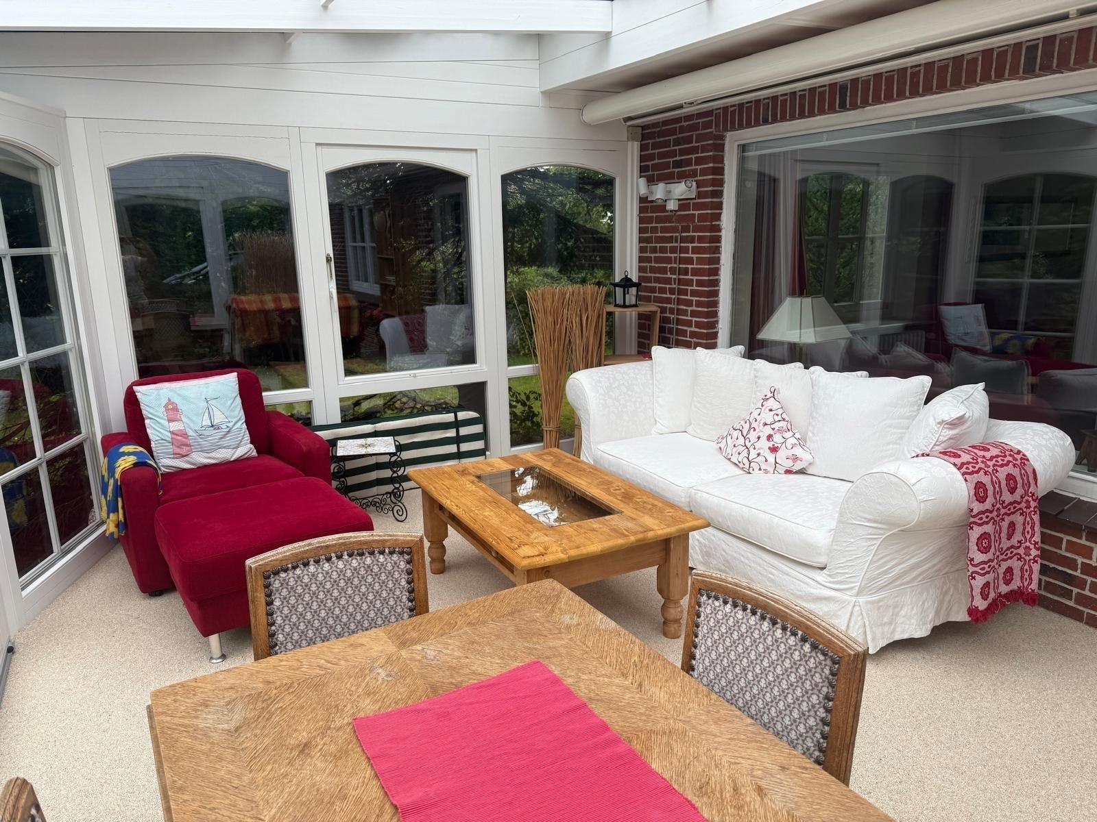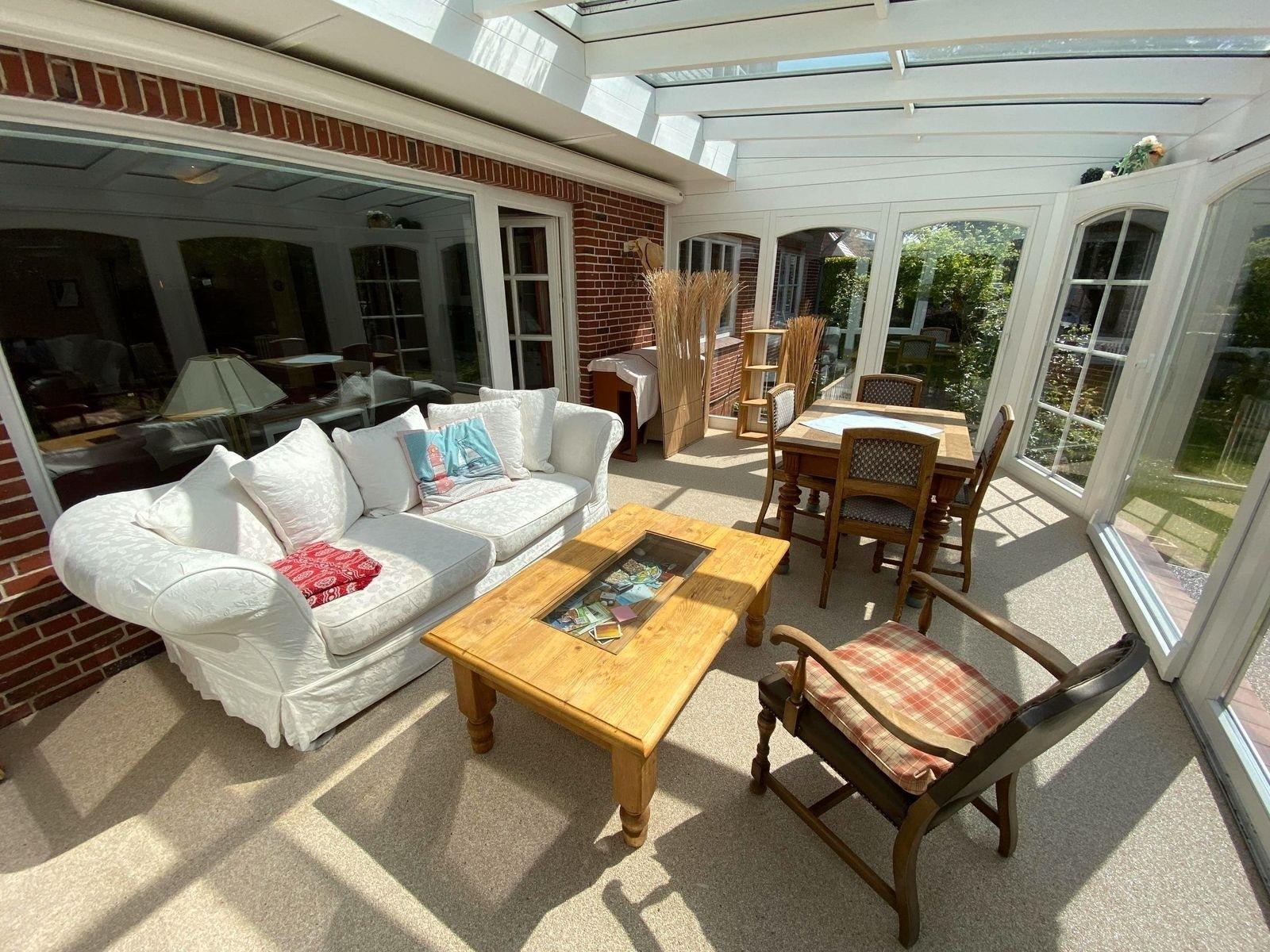 Herzstück der Wohnung ist der helle Wintergarten mit direktem Zugang zum naturbelassenen Garten. Hier beginnt der Tag mit einem Kaffee im Grünen und endet mit entspannten Stunden inmitten frischer Nordseeluft. Der Garten lädt zu Ruhe, Entschleunigung und kleinen Auszeiten ein.