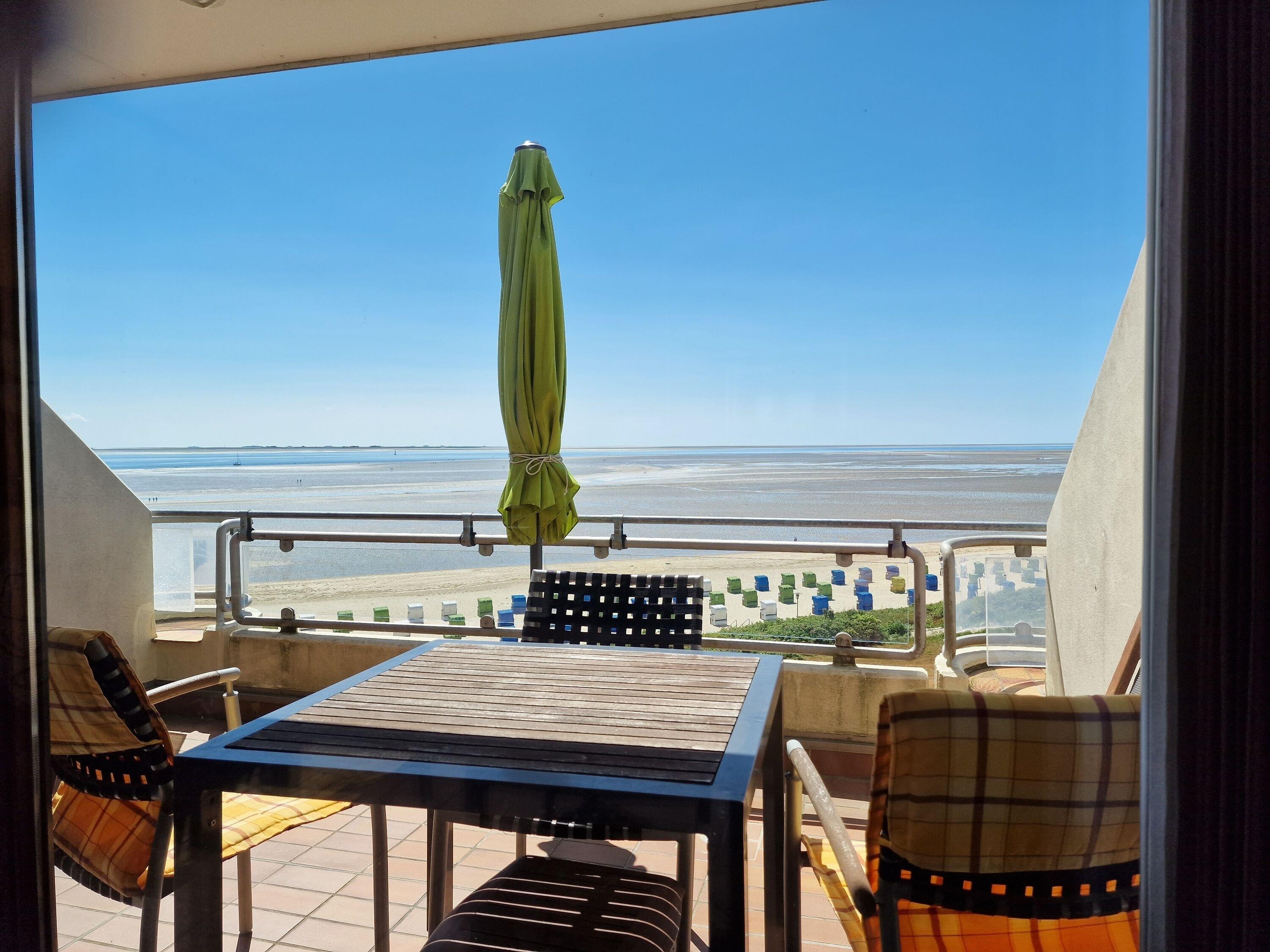 Vom Balkon aus genießen Sie einen herrlichen Panoramablick zu den Halligen. Zur Erholung steht Ihnen außerdem ein Schwimmbad im Appartementhaus zur Verfügung.