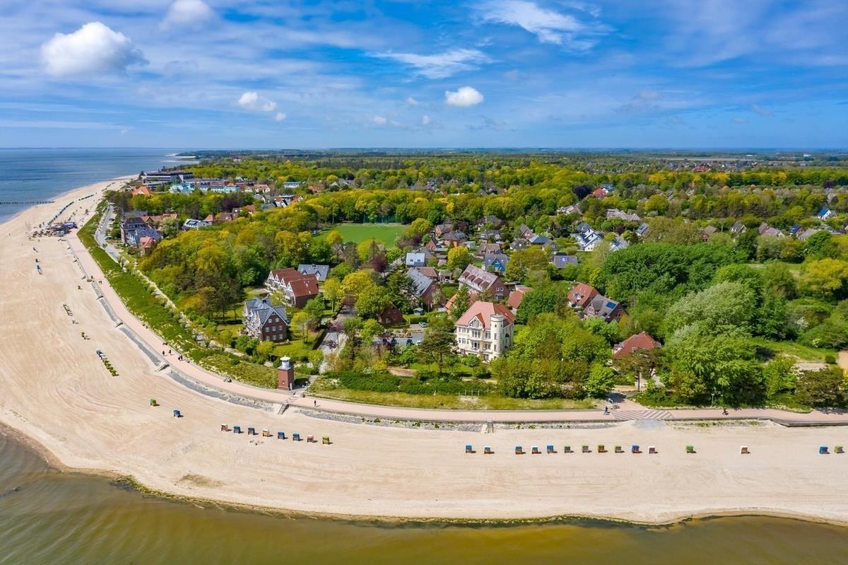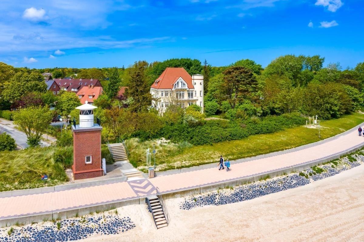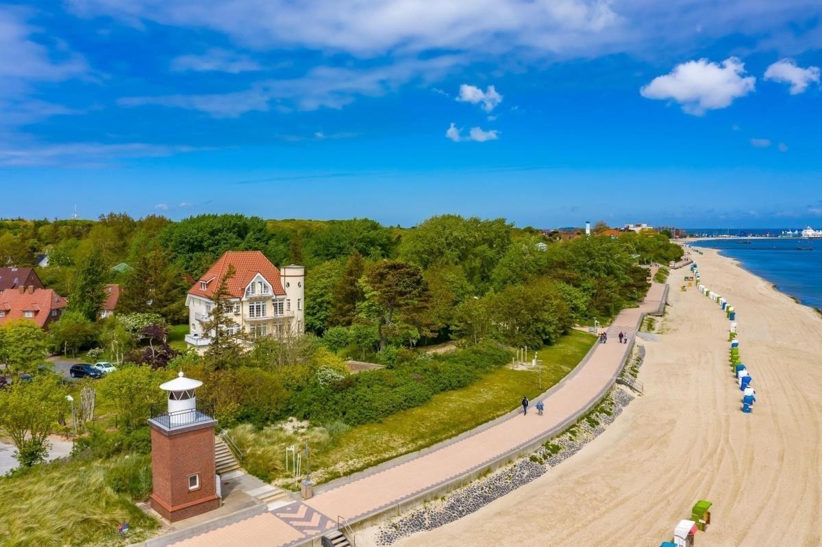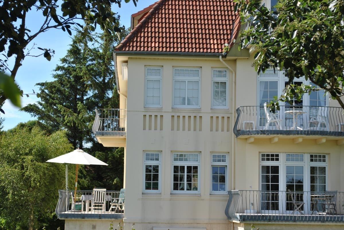 Moderne Ferienwohnung in ruhiger Jugendstilvilla direkt am Südstrand von Wyk auf Föhr mit großem Balkon und Strandkorb.