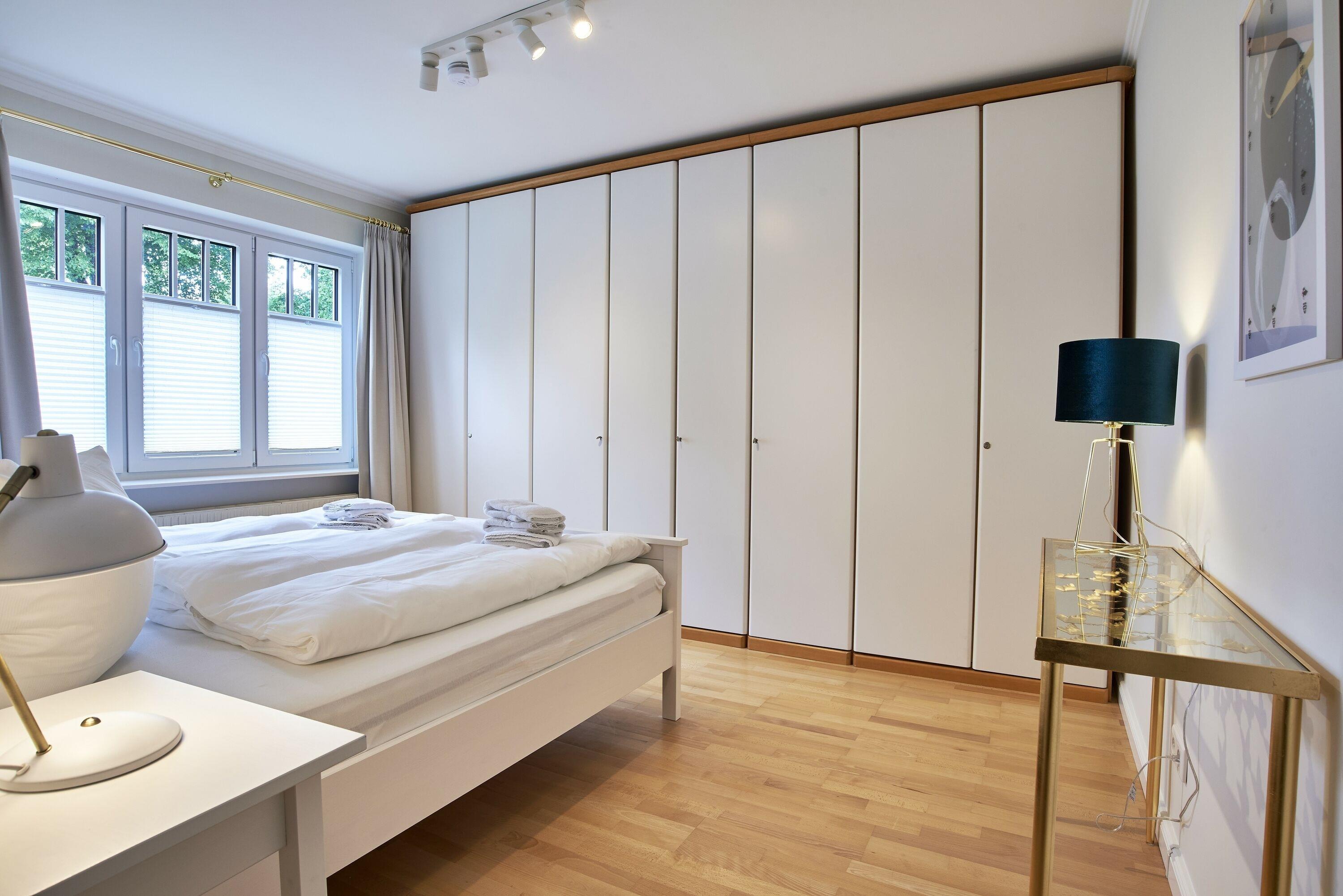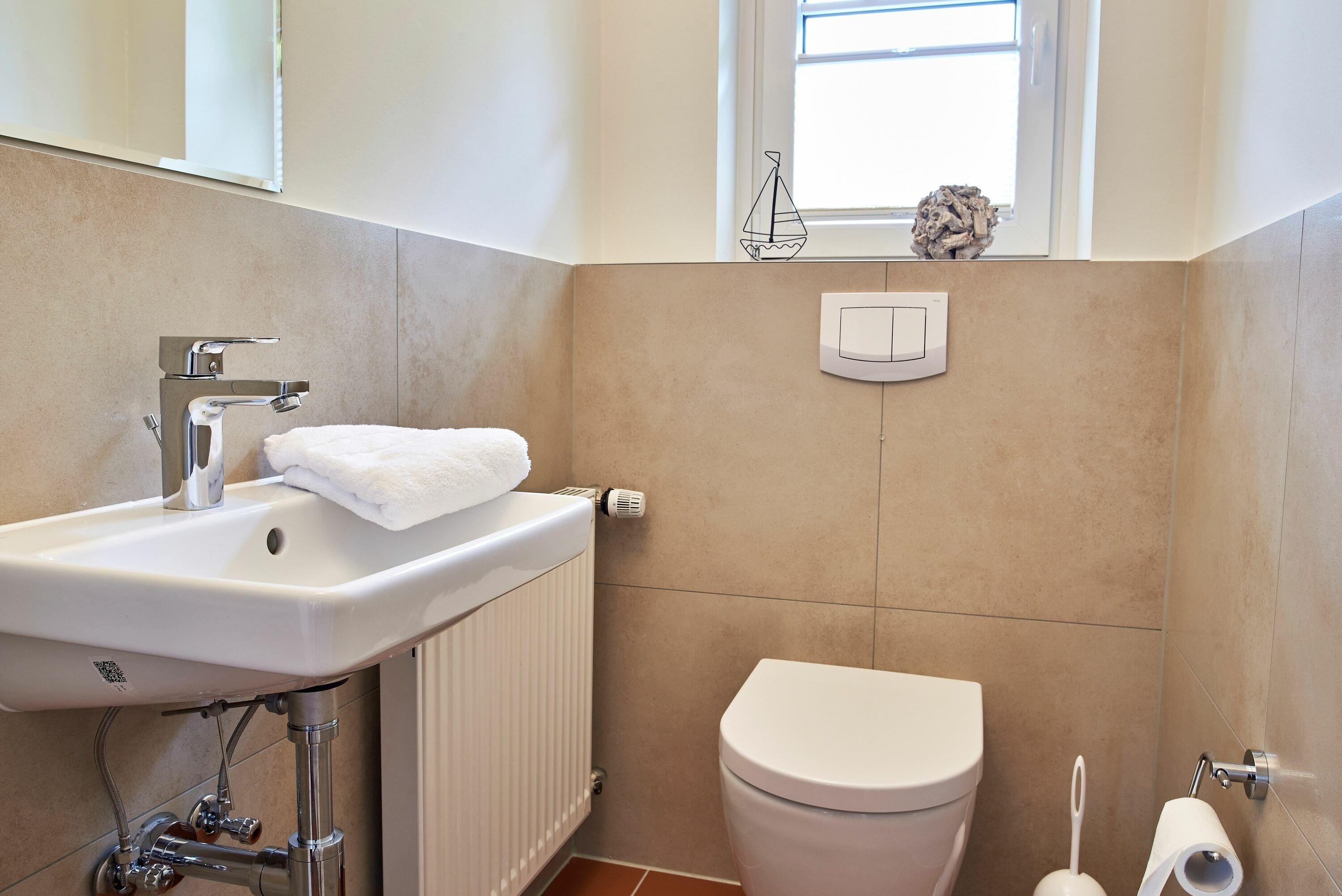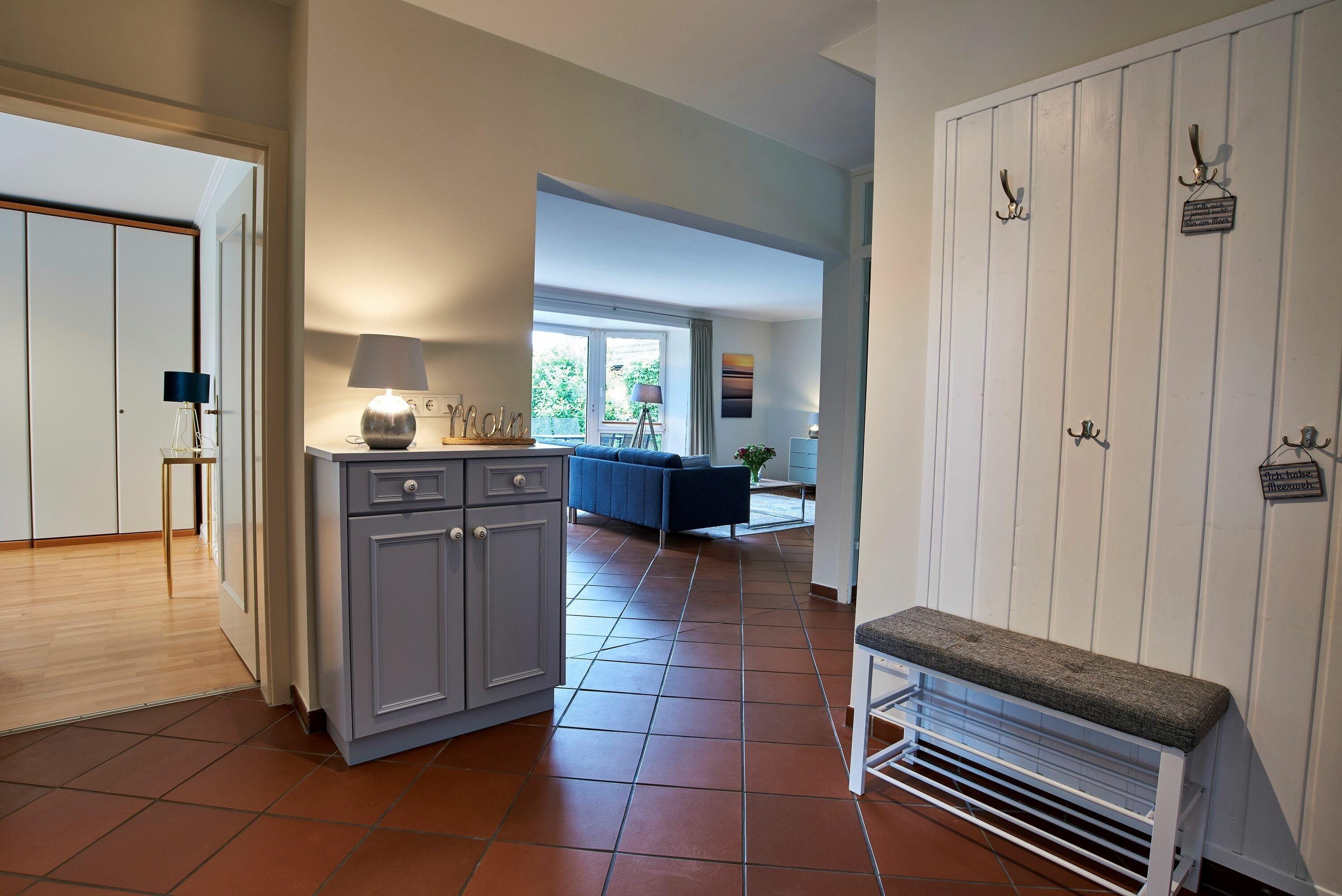 Die großzügige Erdgeschoßwohnung (95 qm) bietet zwei Schlafzimmer, jeweils mit einem Doppelbett. Das Badezimmer wartet mit einer ebenerdigen Regendusche und viel Ablagefläche auf. Im Flur ist eine Garderobe, die Platz für alle Fleece-, Regen- und weitere Jacken hat vorhanden. Weiterhin gibt es noch ein zusätzliches Gäste-WC.