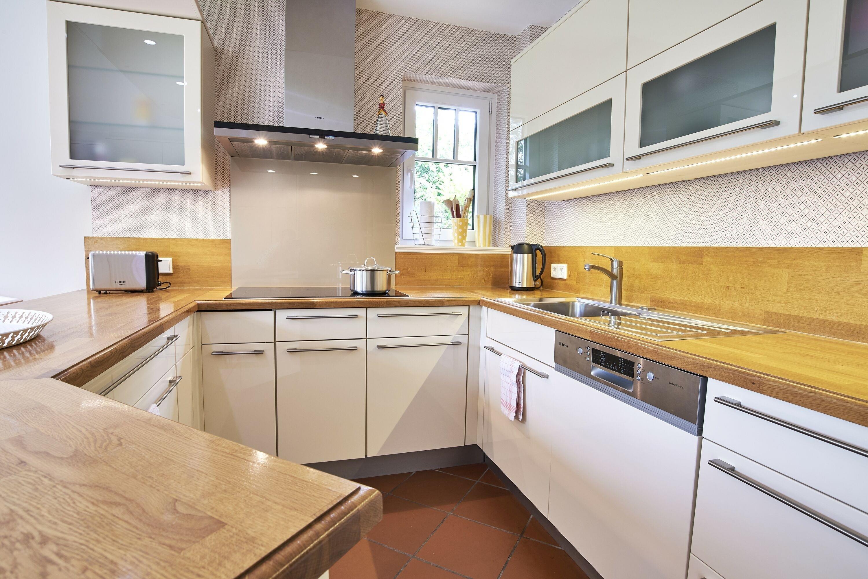 Etwas ganz Besonderes ist die Küche! Das Refugium für Hobbyköche, wo Kochen zur Erholung wird, mit hochwertigen Einbaugeräten wie Induktionskochfeld und gemütlicher Sitzecke. Und direktem Ausgang auf die zweite Terrasse der Wohnung.