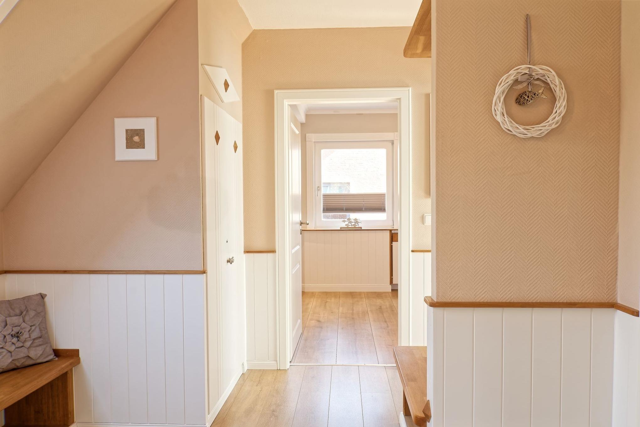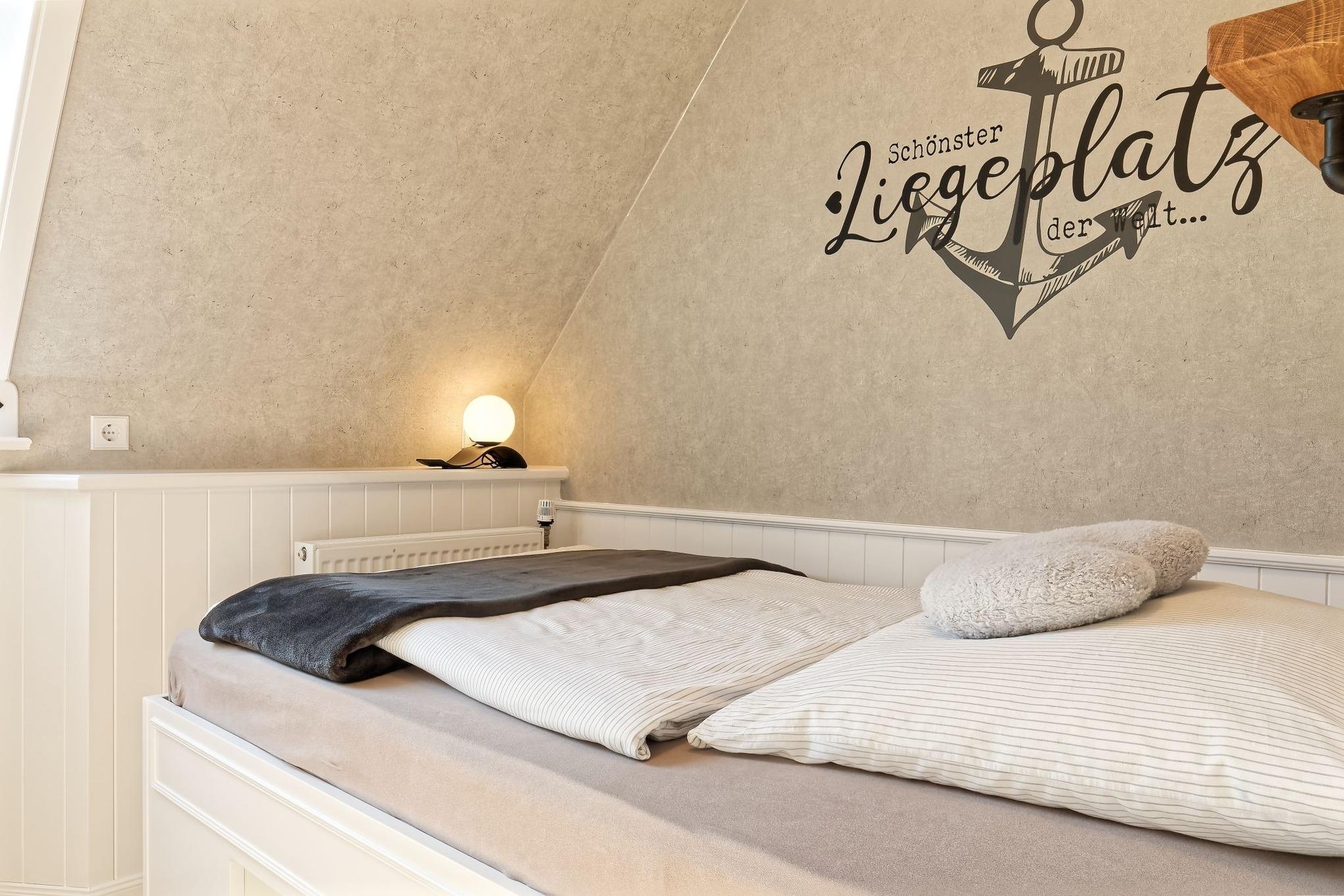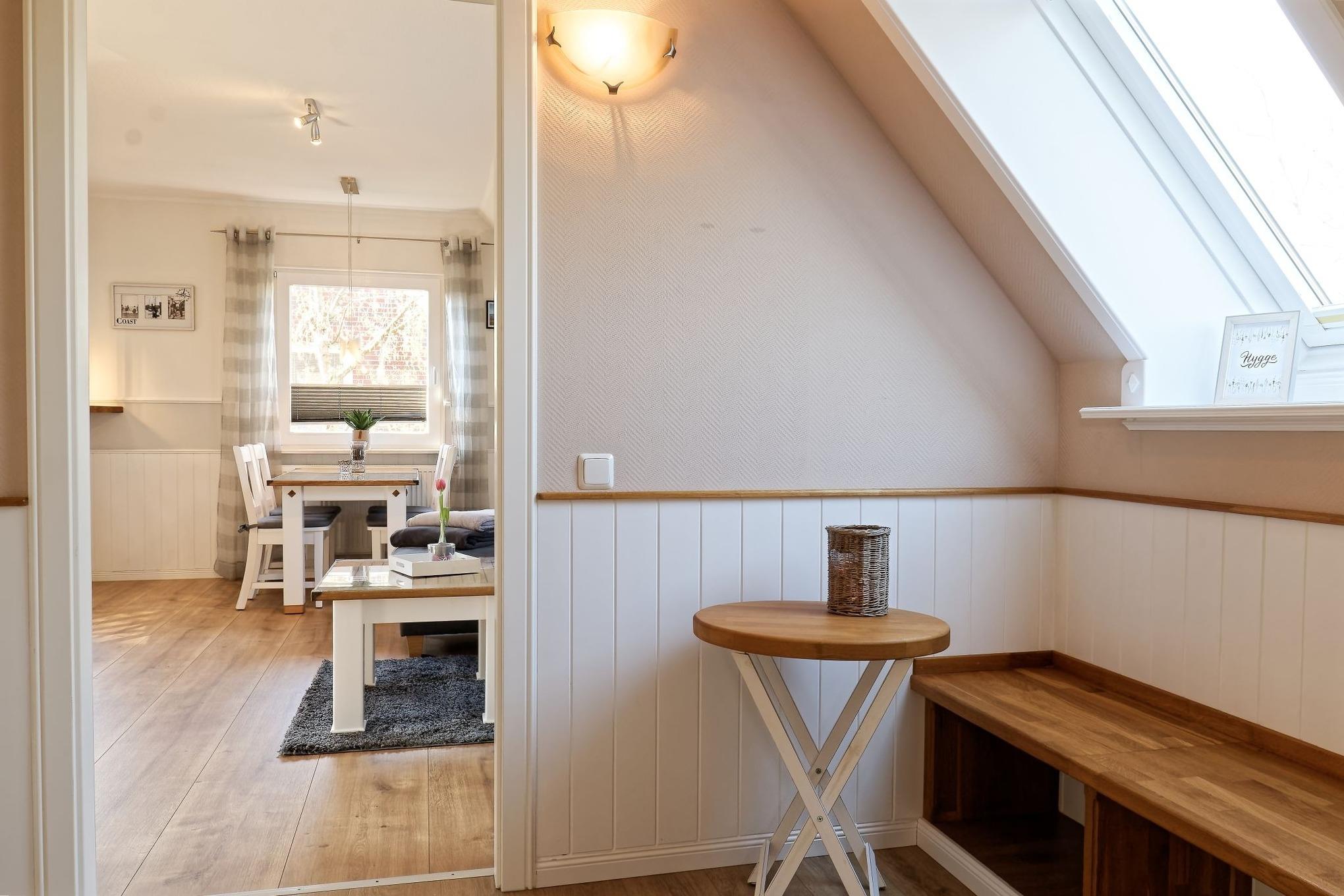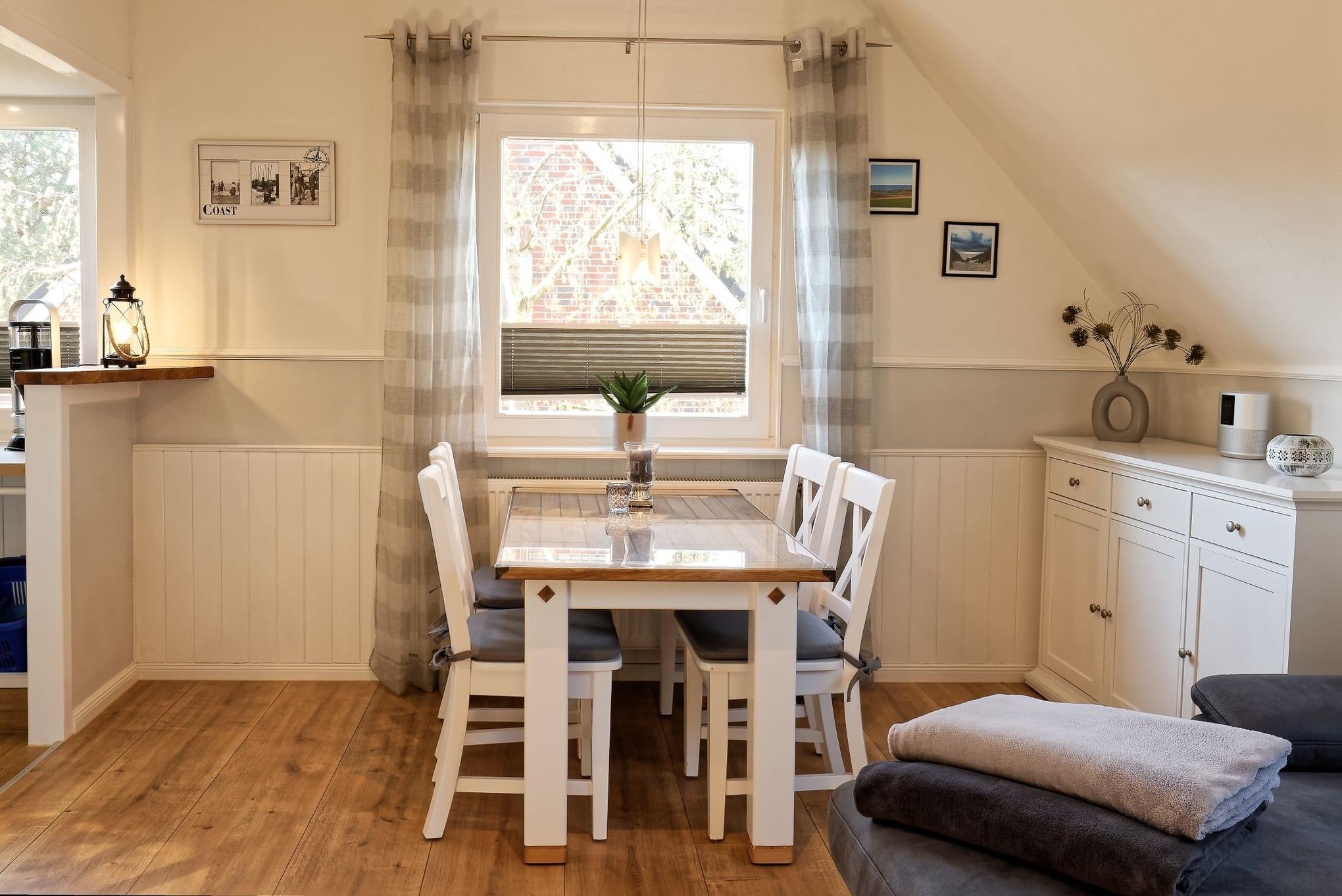 Genießen Sie Ihren Urlaub in unserer gemütlichen, liebevoll eingerichteten Ferienwohnung. Entspannen fängt beim Wohlfühlen an. Mit gemütlichen Dachschrägen, großzügigen, behaglichen Räumen befindet sich die Wohnung im 1. Obergeschoß. Neben dem Haus befindet sich eine lauschige Terrasse mit Sitzmöglichkeiten und Strandkorb sowie einen abschließbaren Fahrradabstellraum.