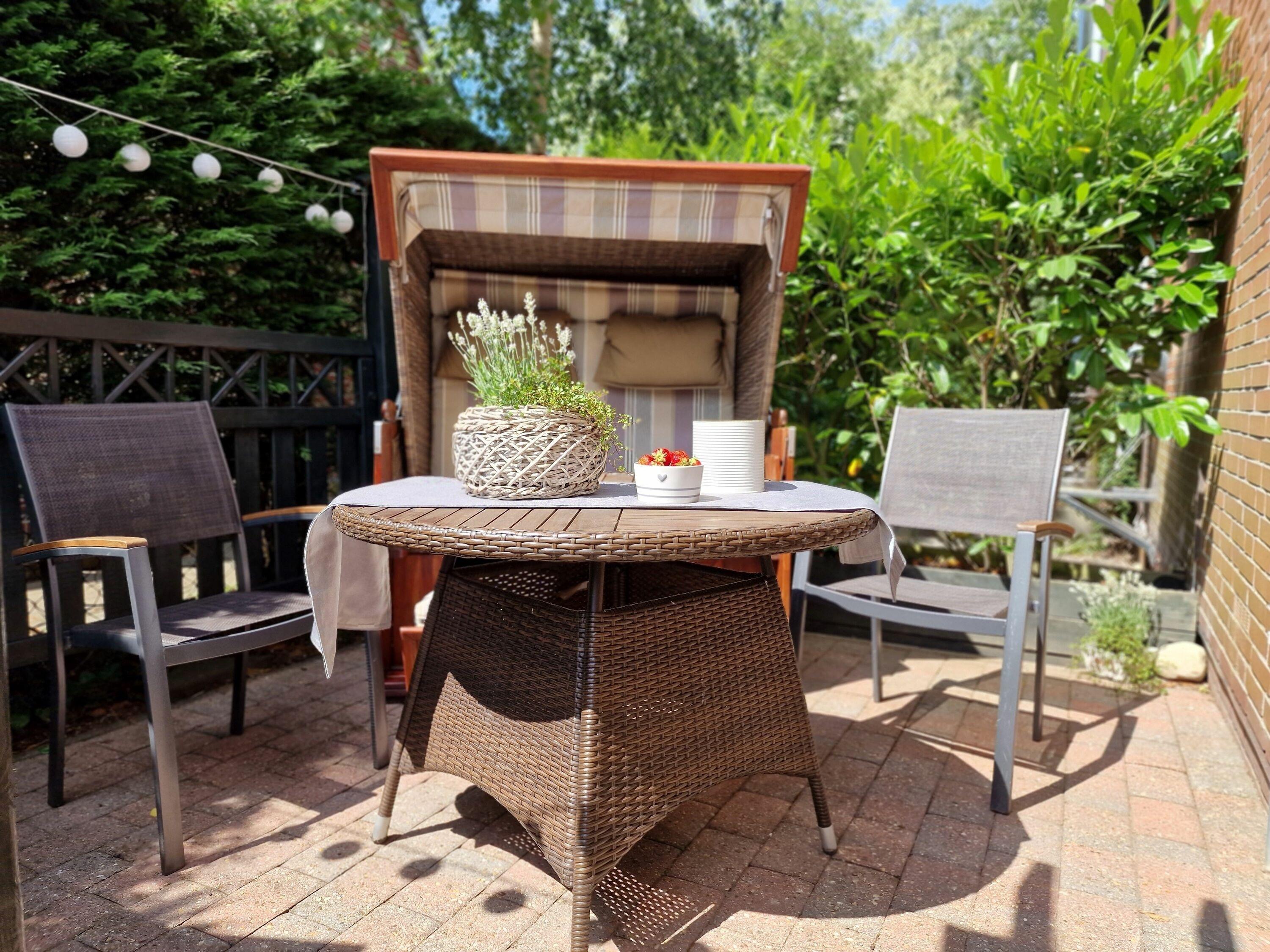 Gemütliche Ferienwohnung mit Terrasse und Strandkorb in Wyk auf Föhr für entspannte Urlaubstage.
