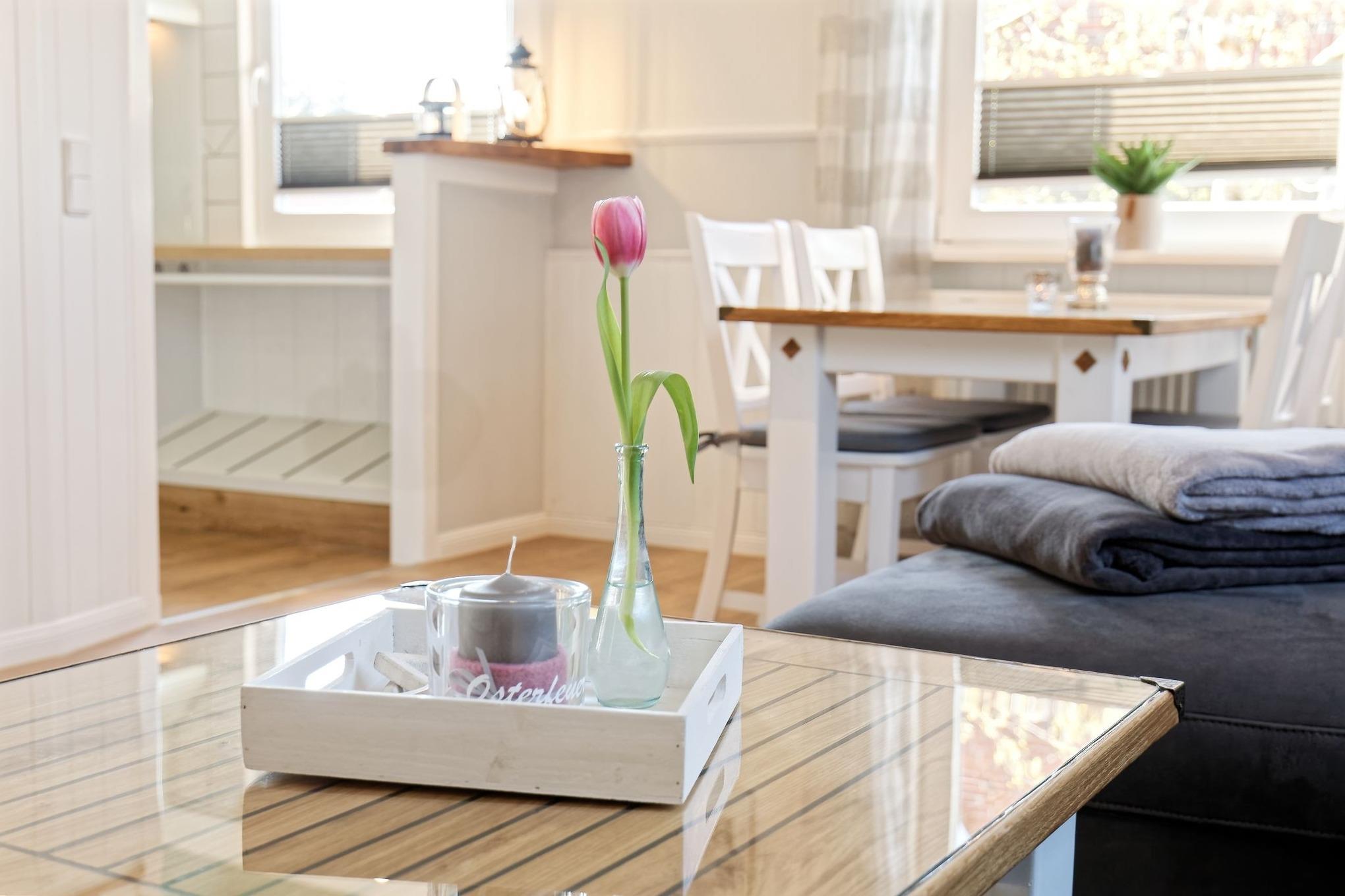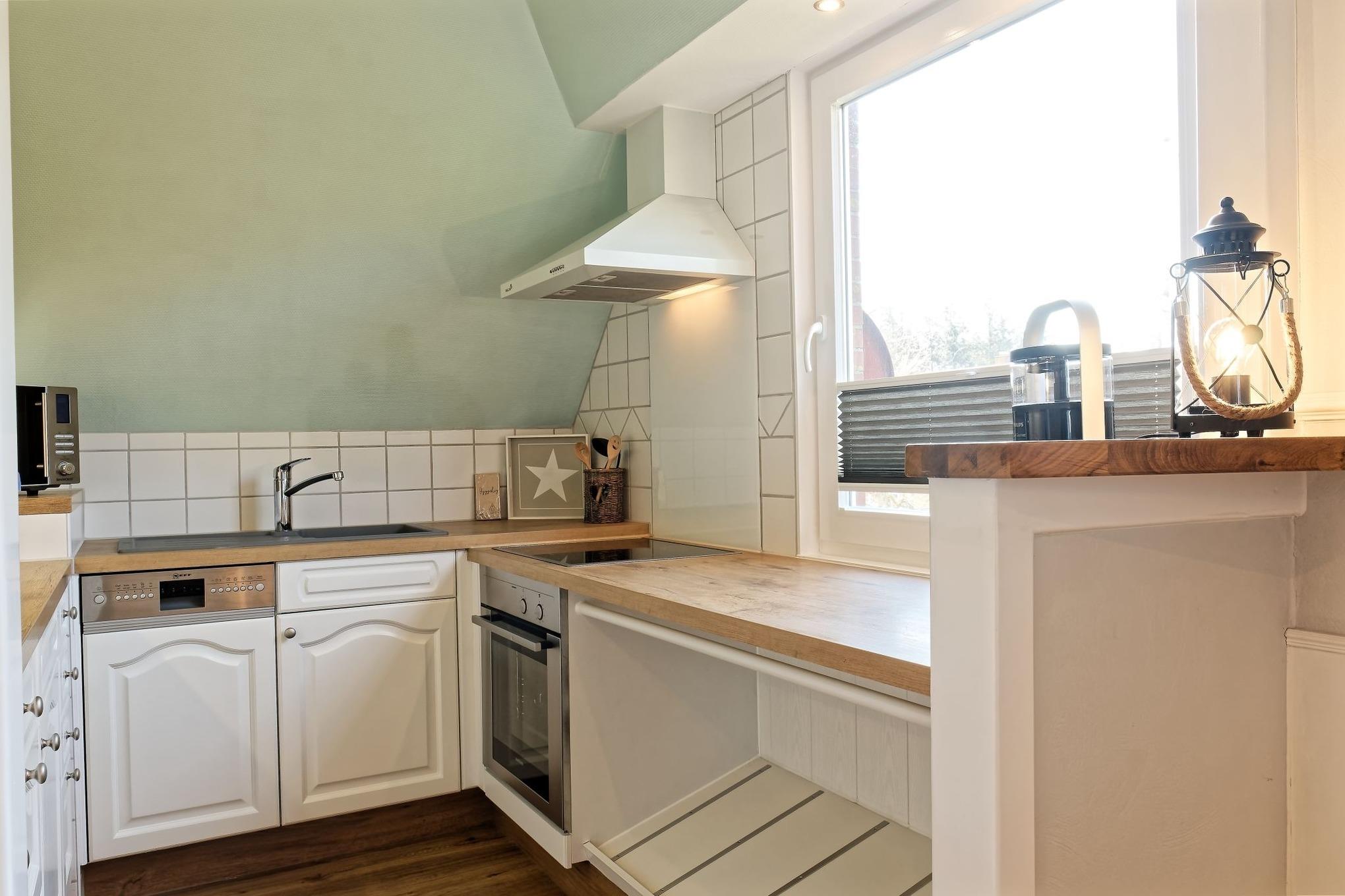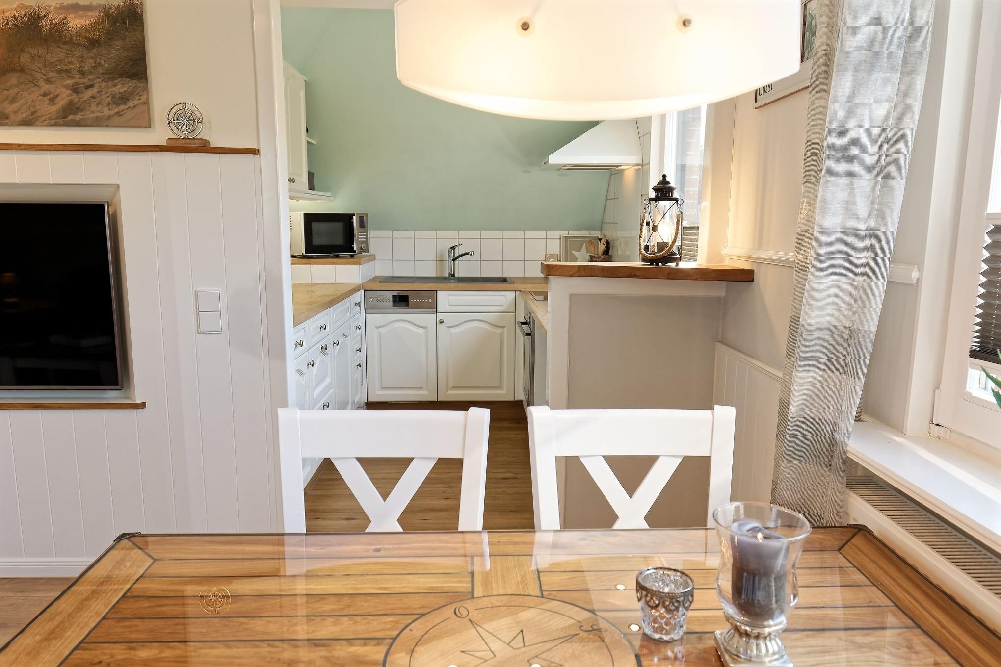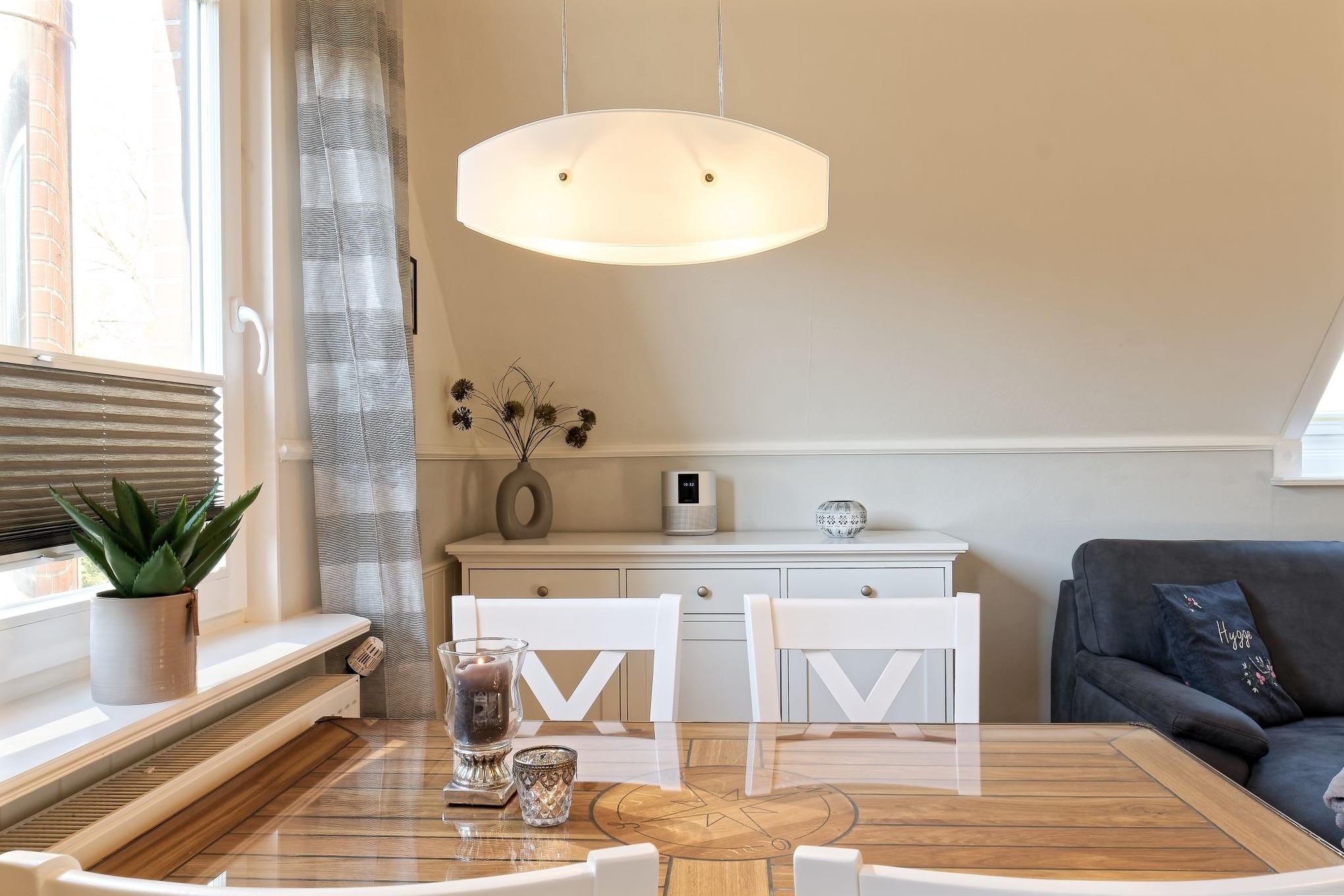 Unsere gemütliche Ferienwohnung zeichnet sich aus durch die liebevolle Einrichtung mit Einbaumöbeln und die hellen lichtdurchfluteten Räume, die sich auch durch die eingebauten Plissees und Jalousien abdunkeln lassen.