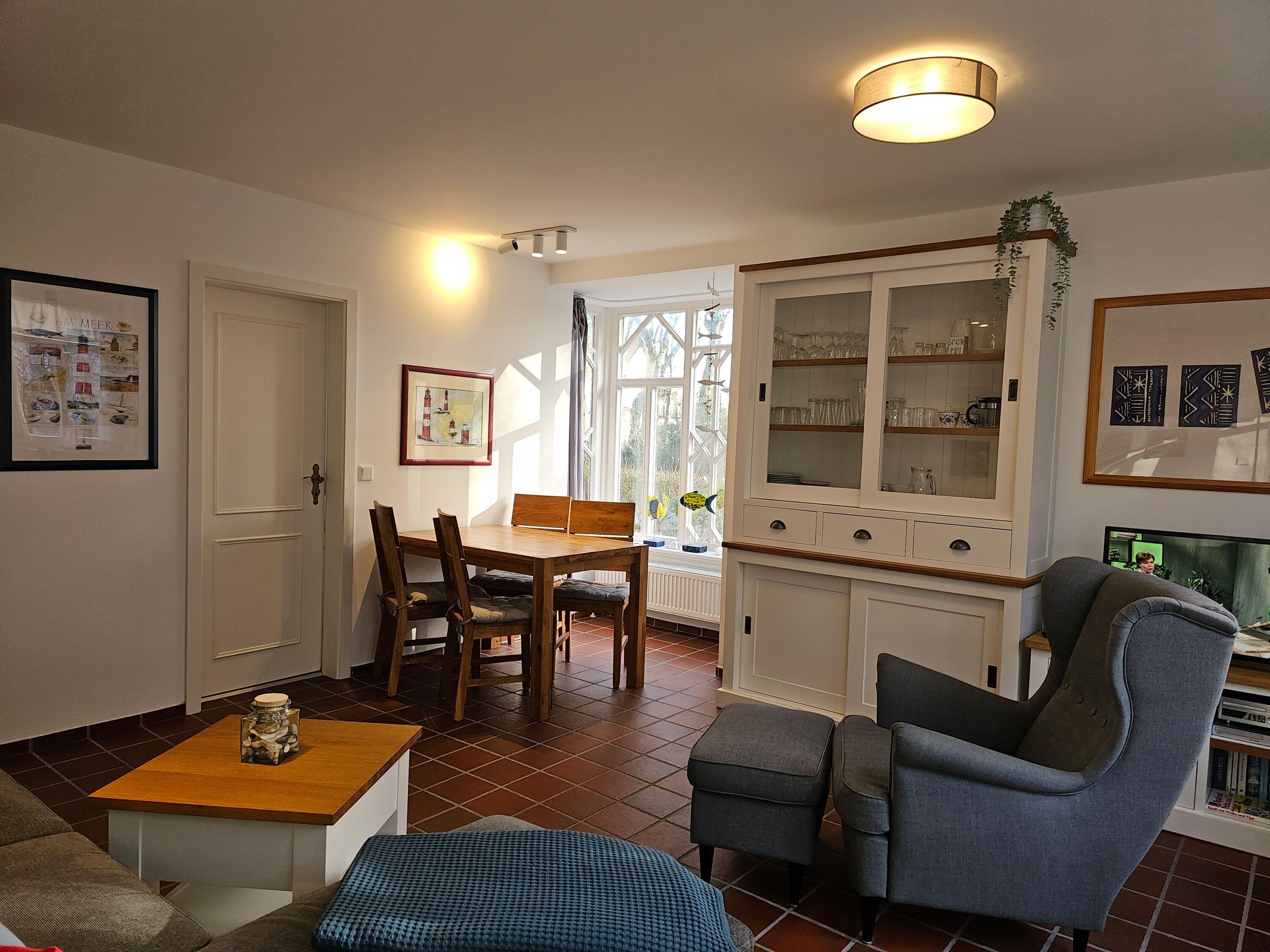 Unsere ca. 50 qm große Erdgeschosswohnung im Haus Gud Tidj erstrahlt seit Anfang 2022 im neuen Glanz und bietet bis zu 4 Personen Platz, um herrliche Urlaubstage zu verbringen. Die zentrale Lage in der Badestraße ist der ideale Ausgangsort für Ausflüge. Das Aquafoehr, die Wyker Innenstadt, das Friesenmuseum und der schöne Strand sind in wenigen Minuten zu erreichen. Das einladende Wohnzimmer mit integriertem Essbereich ist der Mittelpunkt der Wohnung und wurde von den Eigentümer zeitgemäß und gemütlich eingerichtet. Neben einem Flachbild- TV, DVD- Player, einer Musikanlage und WLAN finden Sie hier auch einige Gesellschaftsspiele und einen bequemen Lesesessel. Am Wohnbereich angrenzend befindet sich die moderne und gut ausgestattete Küchenzeile mit Ceranfeld und Backofen, Mikrowelle, Geschirrspüler, Wasserkocher und Kaffeemaschine und einer Senseo Maschine. Hier finden Sie alles, was Sie fürs tägliche Kochen benötigen. Des Weiteren verfügt die Wohnung über ein hellgefliestes Bad mit Dusche und Fenster und zwei liebevoll hergerichtete Schlafräume.