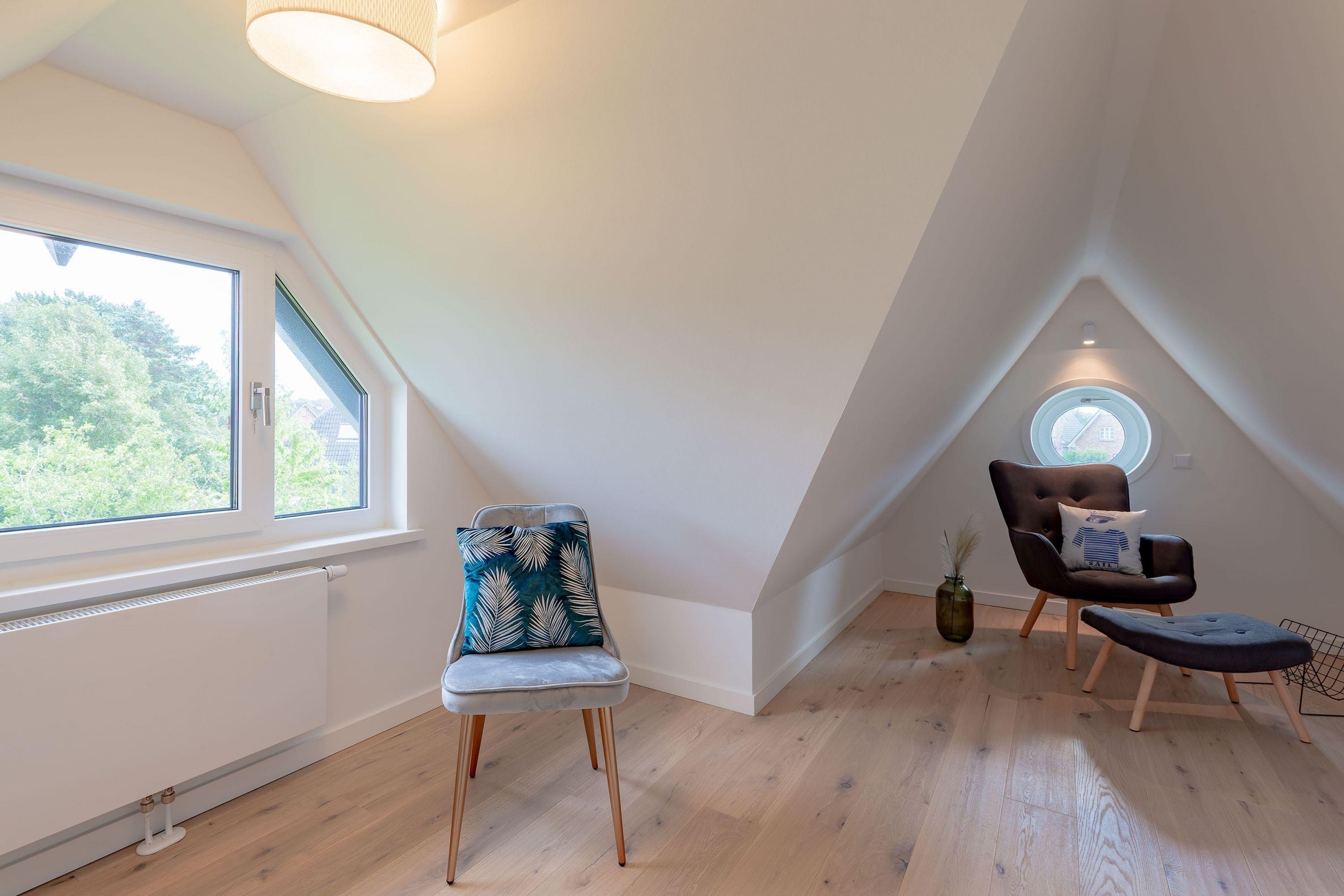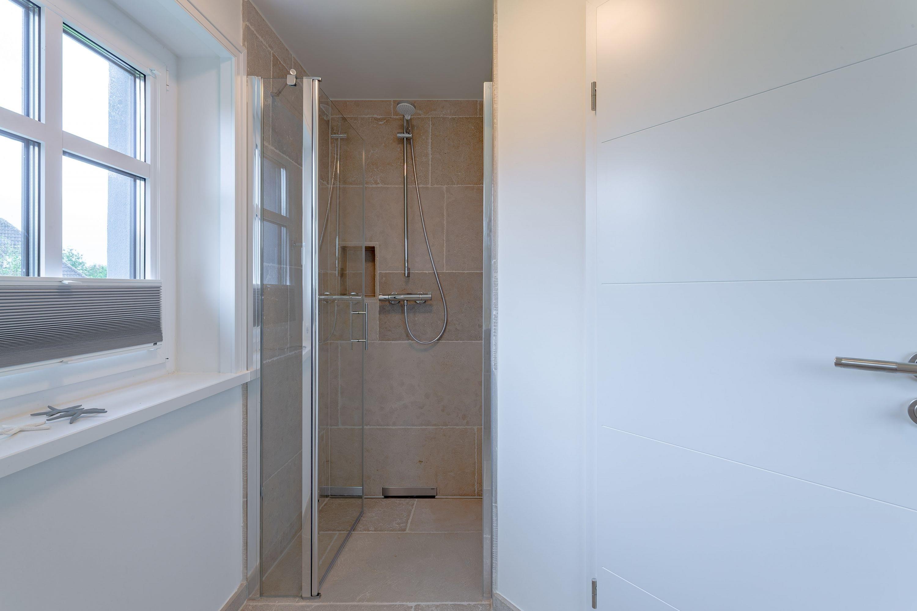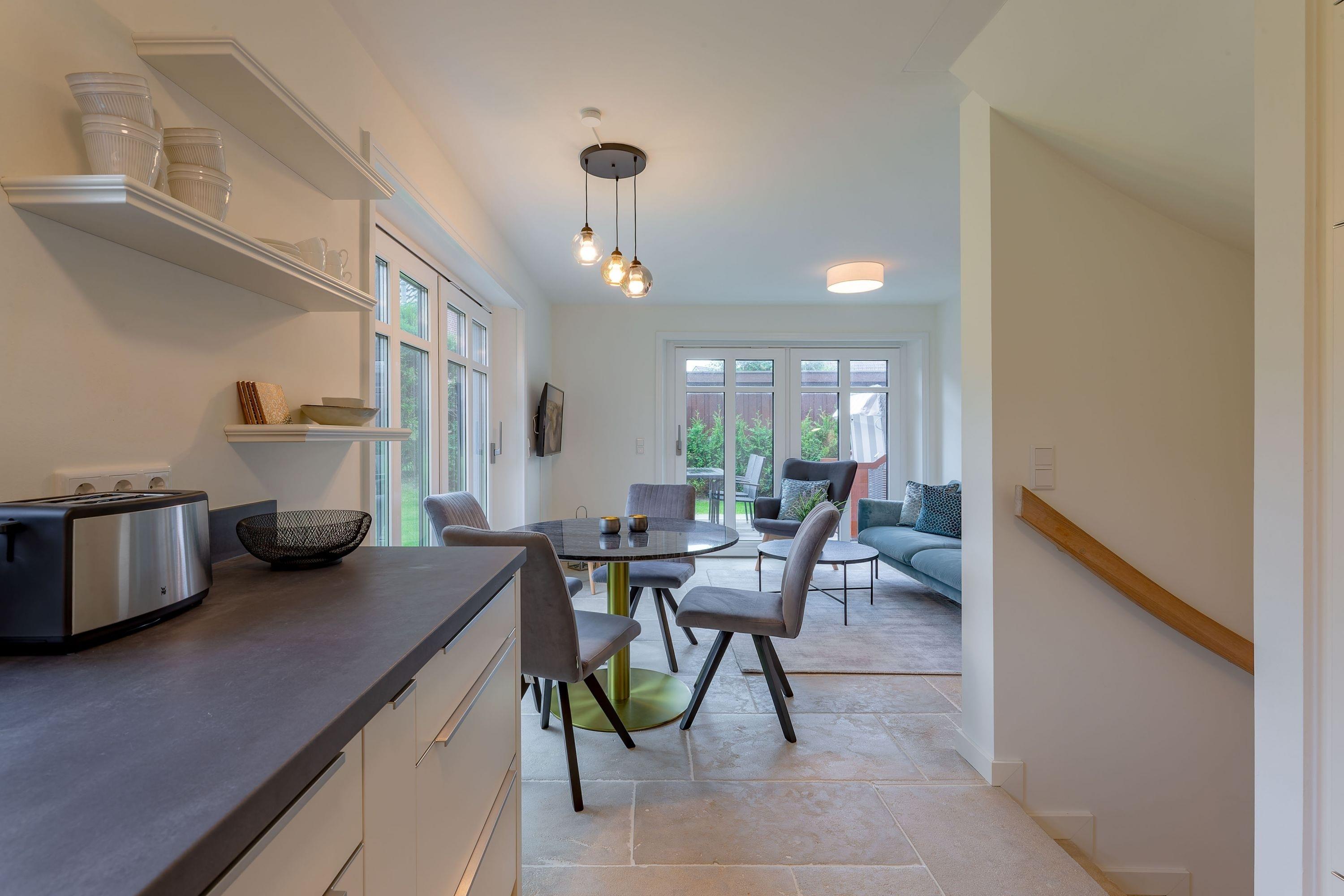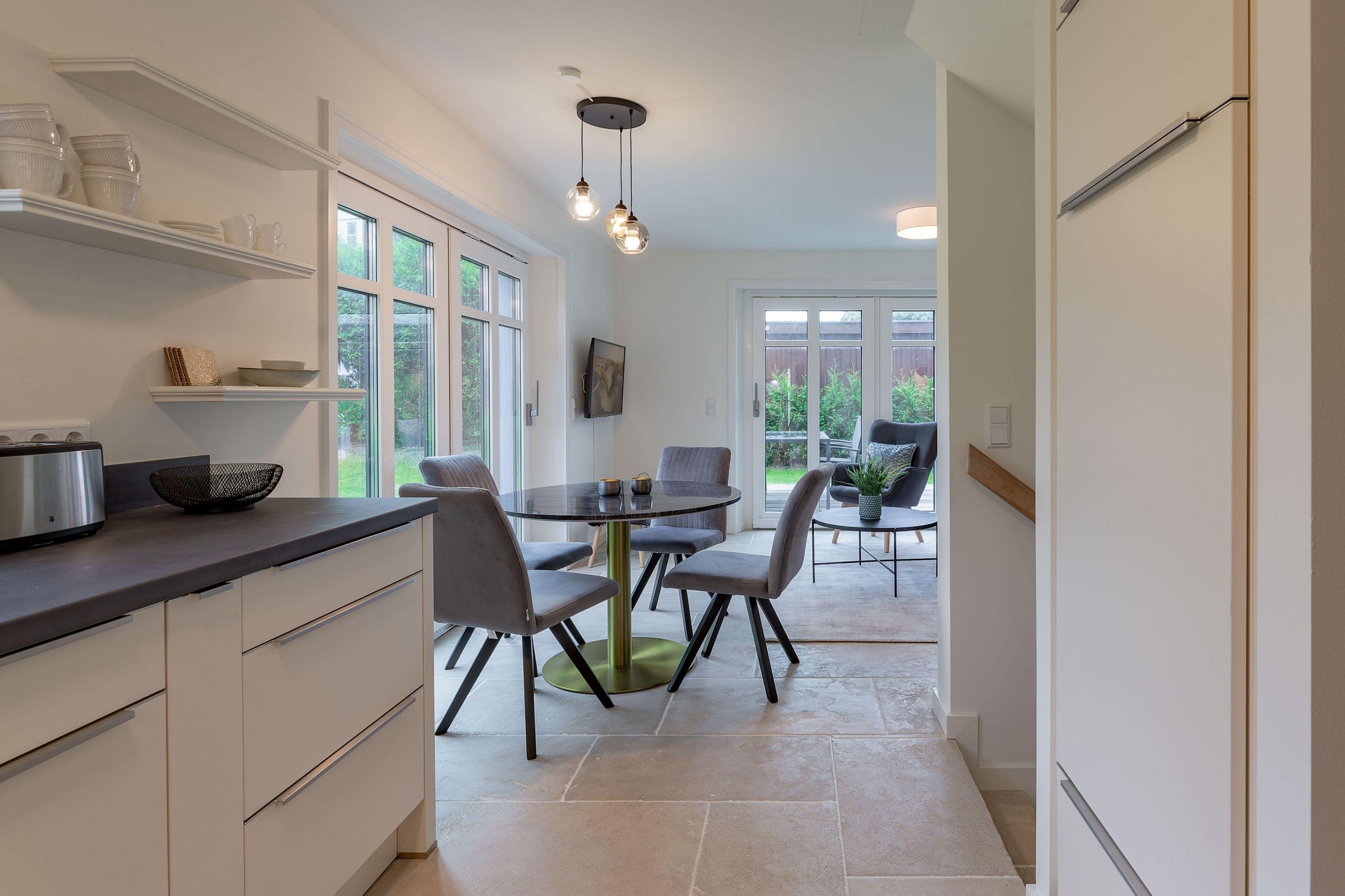 Modernes Wohnen im Stine-Andresen-Weg in Wyk auf Föhr. Der Stine-Andresen-Weg liegt westlich nur wenige Gehminuten vom Zentrum entfernt. Es handelt sich um eine ruhige Nebenstraße, in der sowohl Insulaner als auch Feriengäste leben. In fußläufiger Entfernung gelangen Sie zur Strandpromenade die zum Bummeln einlädt und sich fast 3 km lang erstreckt. Auch der Wyker Stadtwald und der Ortskern in Wyk liegen fußnah zum Stine-Andresen-Weg. Die Haushälfte ist durch die vielen bodentiefen Fenster lichtdurchflutet und modern ausgestattet. Eine Terrasse lädt zum Frühstücken uns relaxen ein. Sowohl im Obergeschoss als auch im Untergeschoss befindet sich ein großes Schlafzimmer mit Doppelbett und jeweils ein Bad mit bodenebener Dusche. Im Untergeschoss steht Ihnen eine Sauna zur Verfügung. Einem erholsamen und entspannten Urlaub steht nichts im Wege – egal zu welcher Jahreszeit Sie einen Aufenthalt buchen. [nbsp]