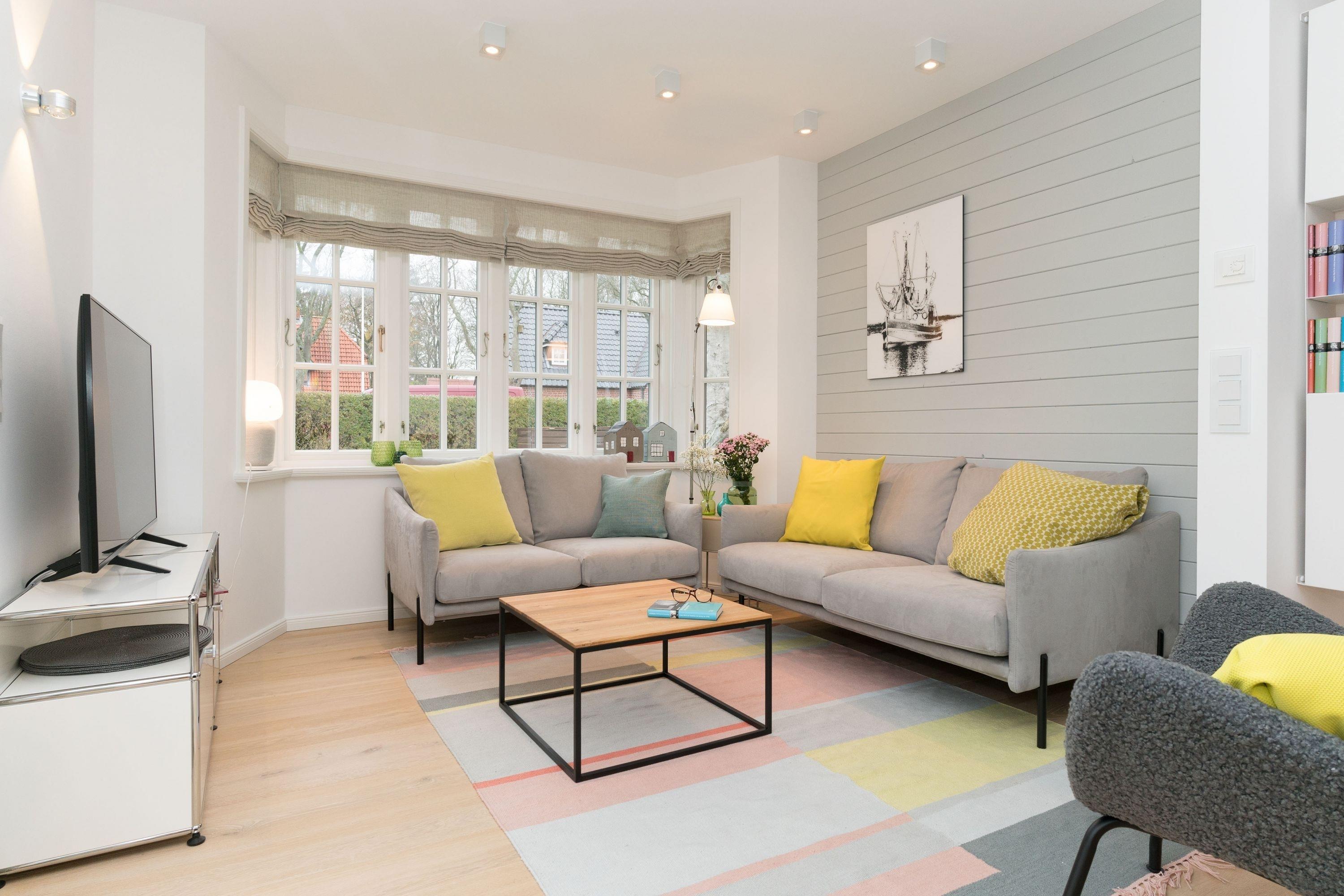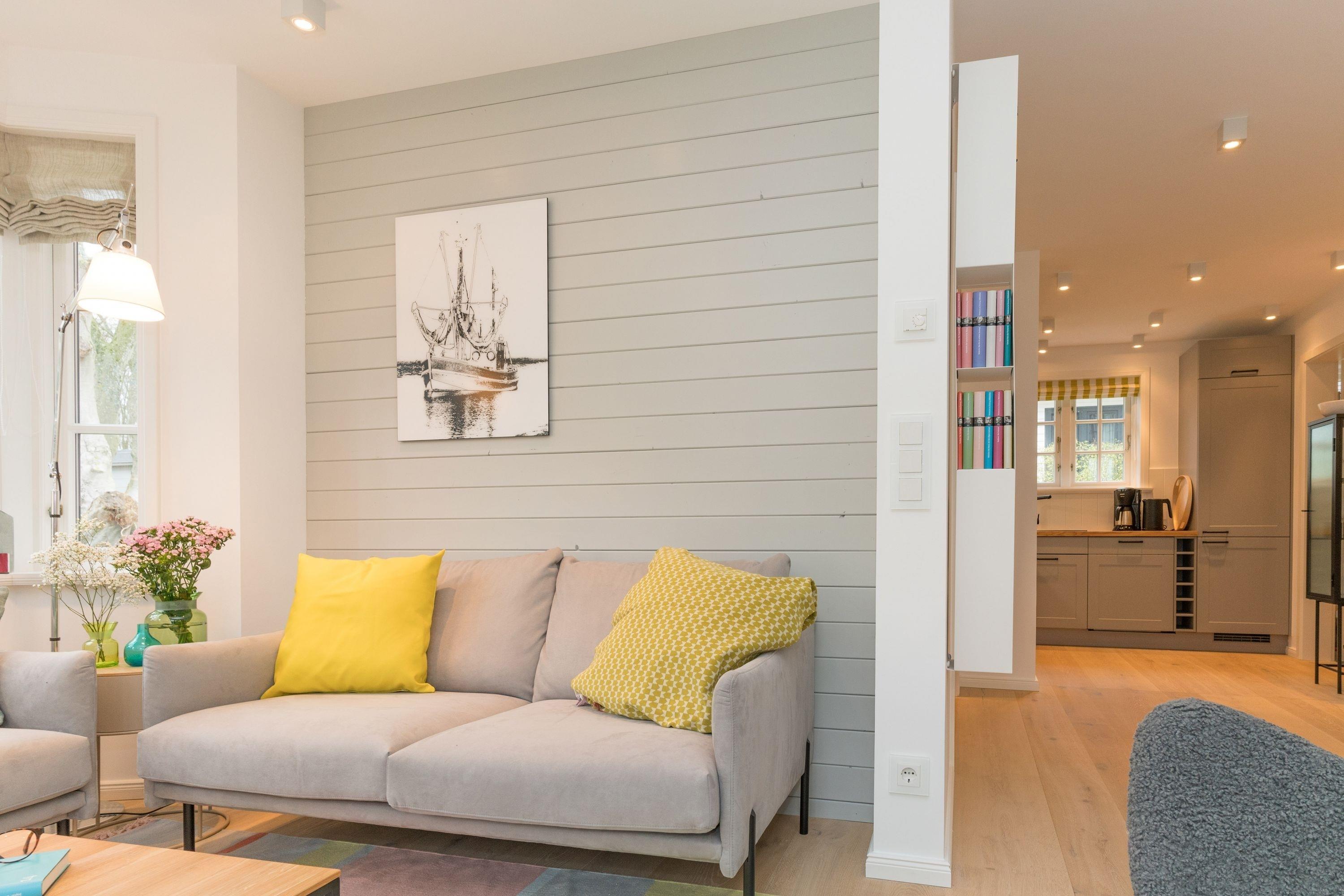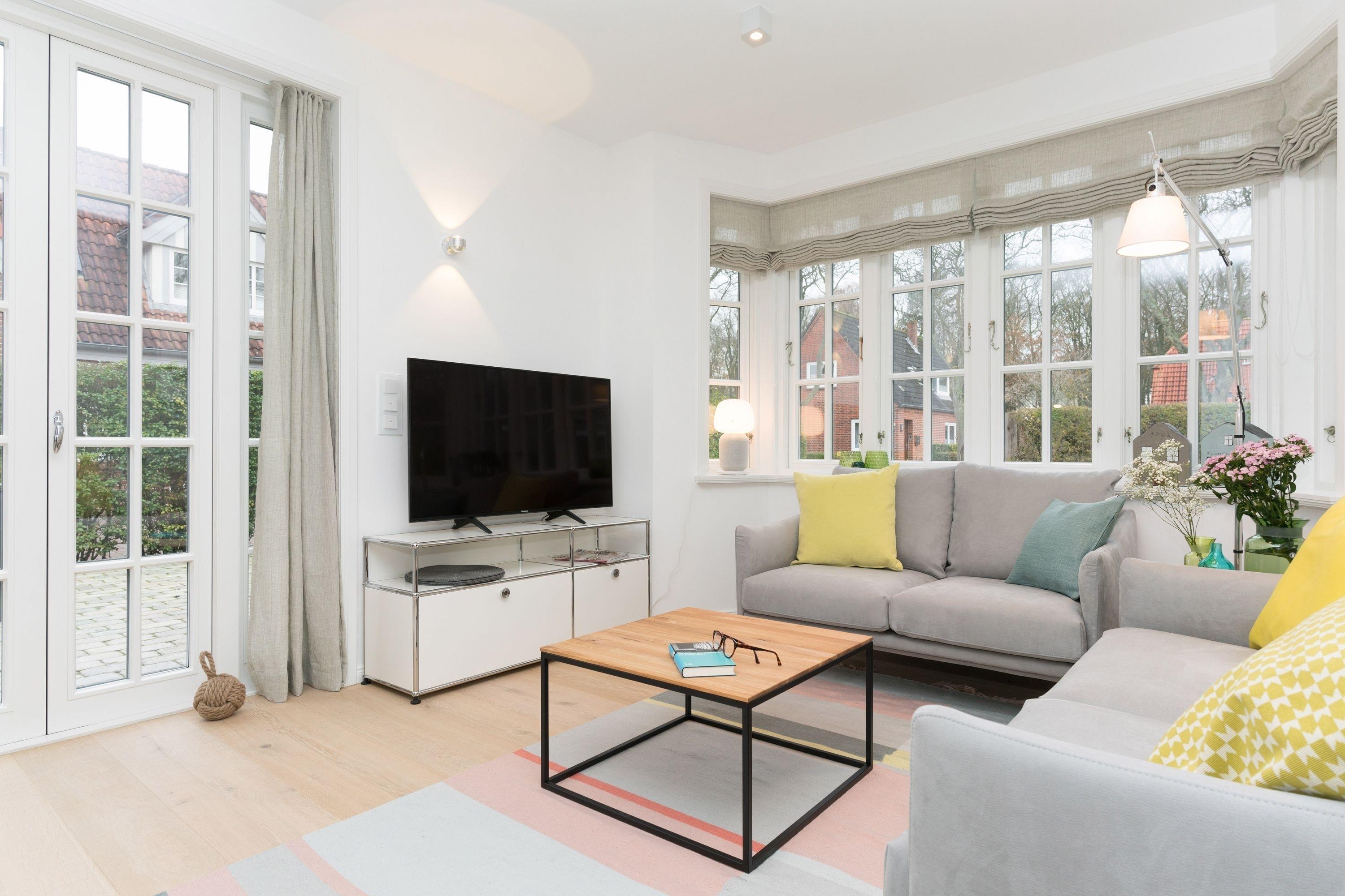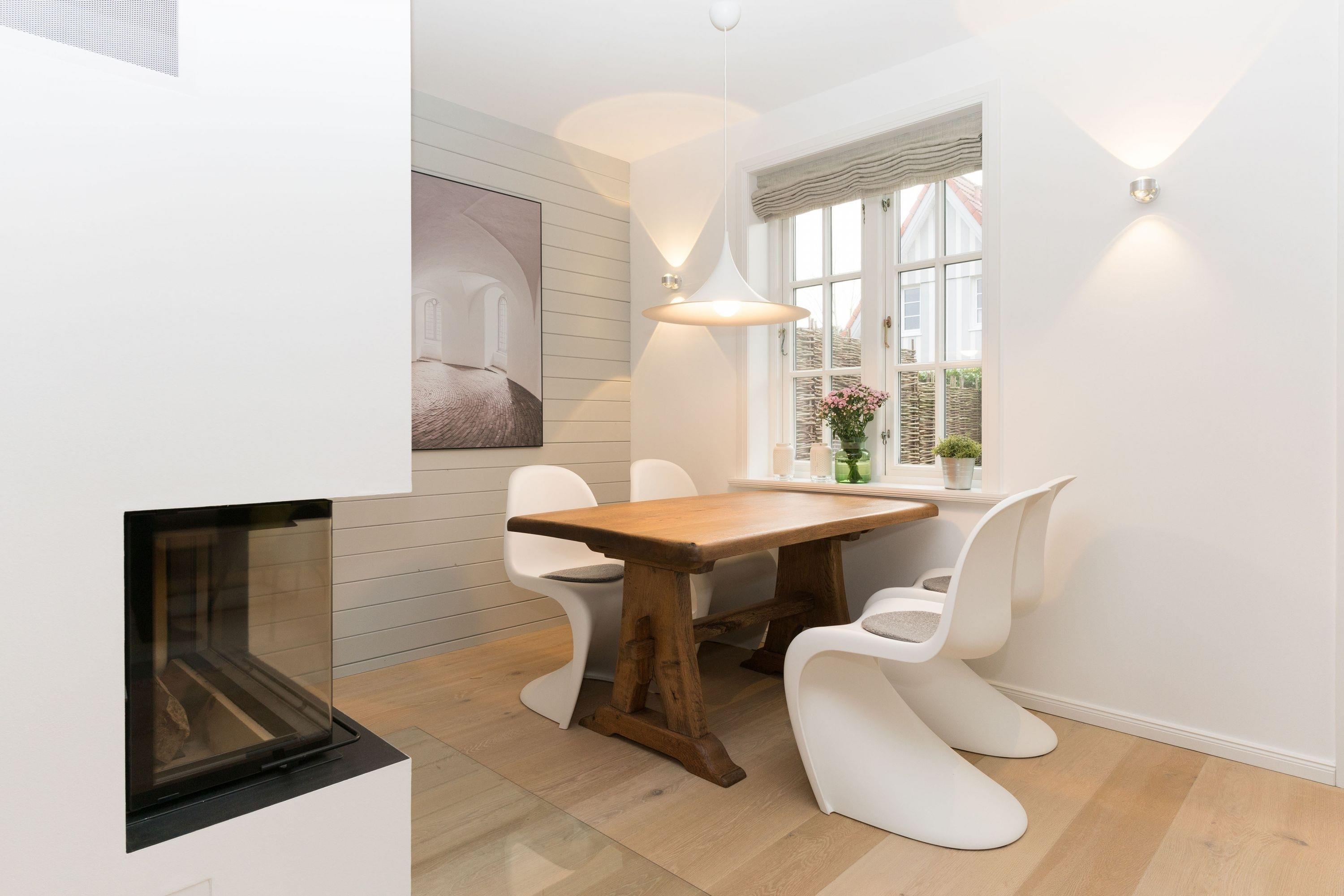 Ferienhaus "Leichte Brise" Meer, Sonne und immer eine leichte Brise - das ist Föhr und das ist die ruhig und zentral gelegene "Leichte Brise“ in Wyk. Moderne, klare Linien, nordische Leichtigkeit, massive Eichendielen und Designklassiker auf 105 qm über 3 Etagen als perfekte Urlaubsbasis für 4 Erwachsene und 1 Kleinkind (bis 3J.). Große Fensterflächen, Artemide und Gubi Leuchten schaffen lichtdurchflutete Räume. Im Erdgeschoss treffen USM Haller und Panton Stühle auf einen alten Eichentisch und eine Küche mit kompletter Ausstattung. Zwei gemütliche Sofas und ein moderner Ohrensessel sind die Relaxgrundlage für Fernsehabende, Lesestunden oder ein gutes Glas Wein am knisternden Kamin. Die Schlafzimmer jeweils mit Bettwäsche in Komfortgröße (155x220) und En-suite Bäder mit großer Dusche, versprechen Erholung im Schlaf. Und falls es im Urlaub doch mal eine E-Mail zu schreiben gibt, finden Sie einen kleinen Arbeitsplatz im Dachgeschoß. Die nach Süden ausgerichtete Terrasse mit großem Tisch und Standkorb schließt die Hausführung ab.