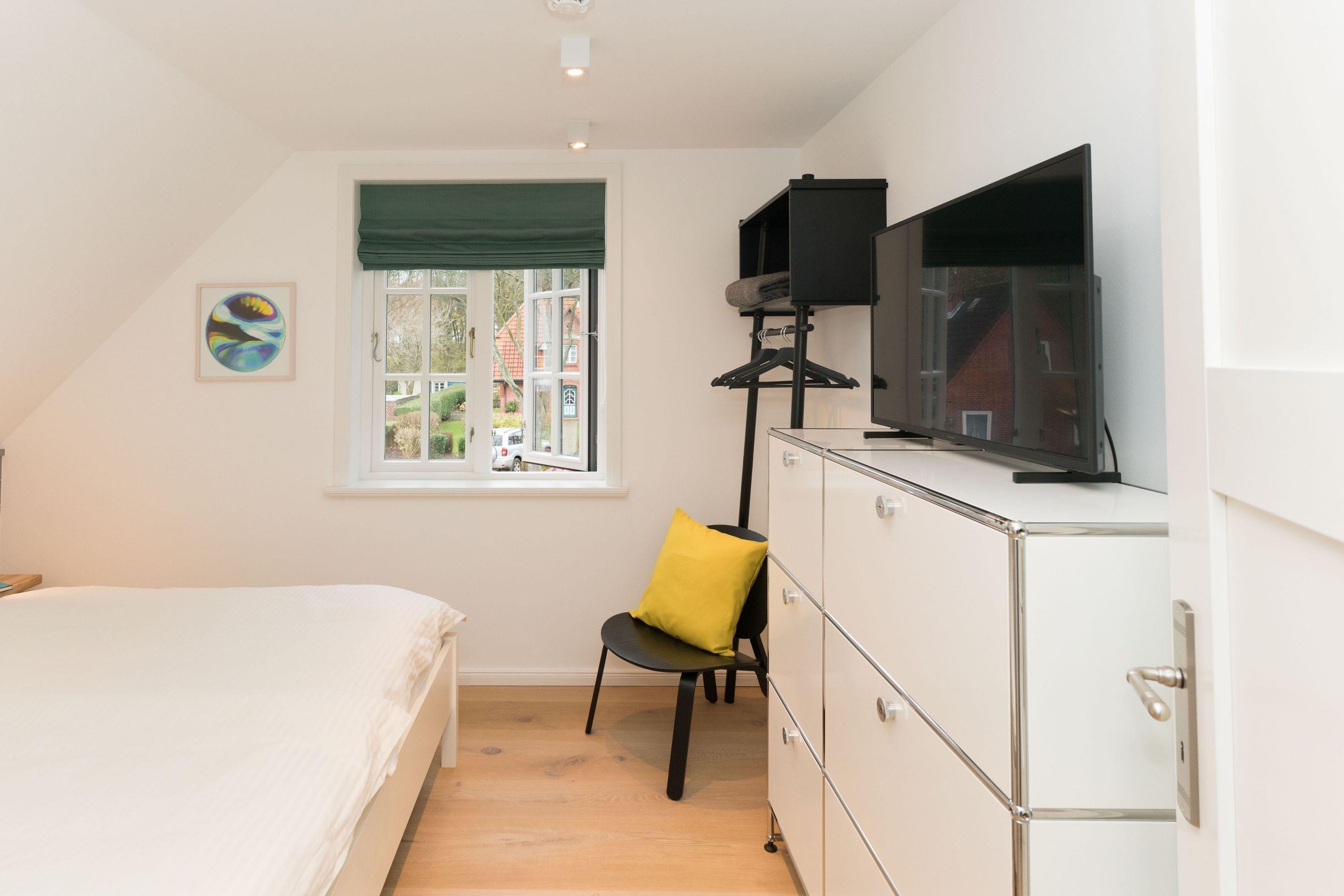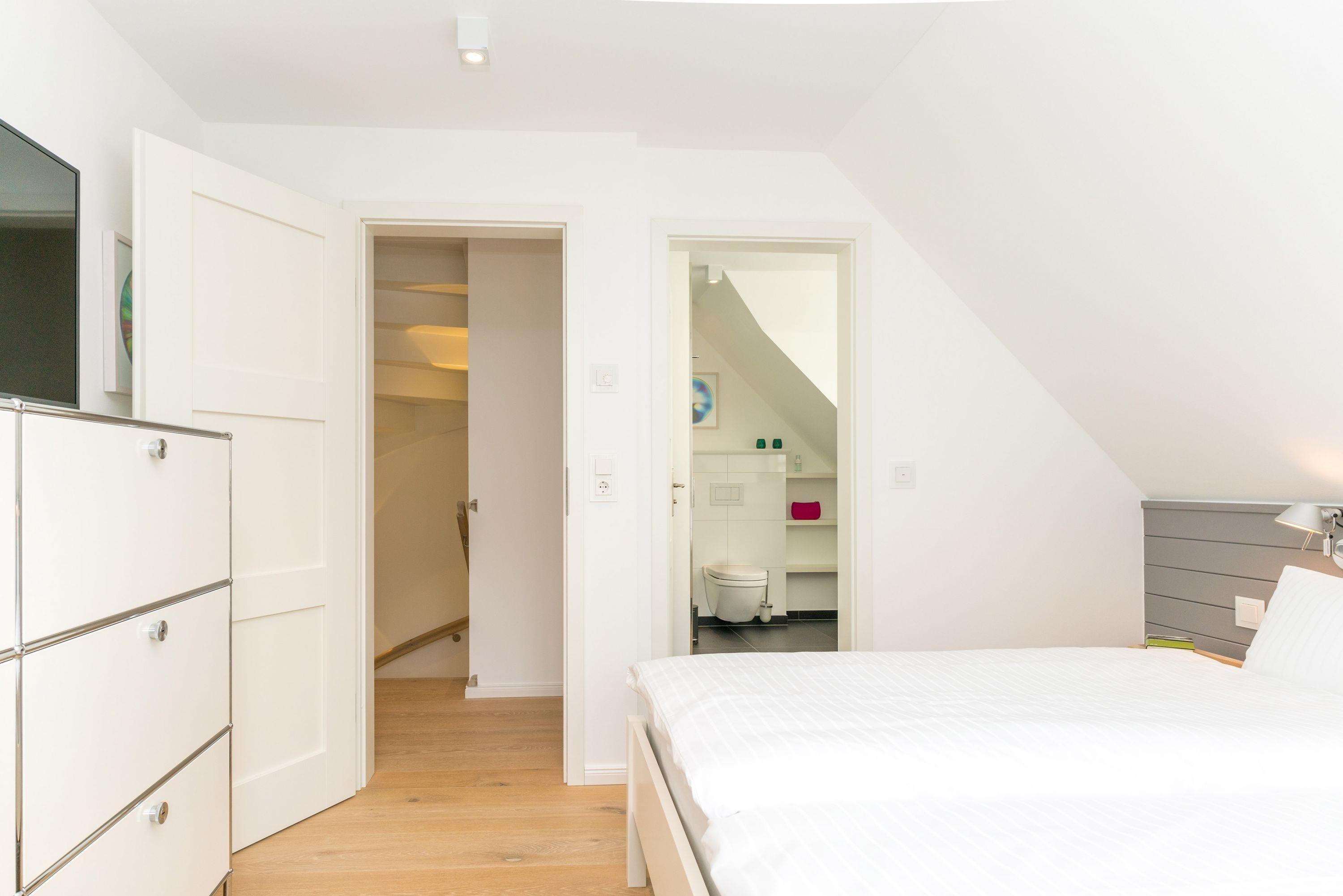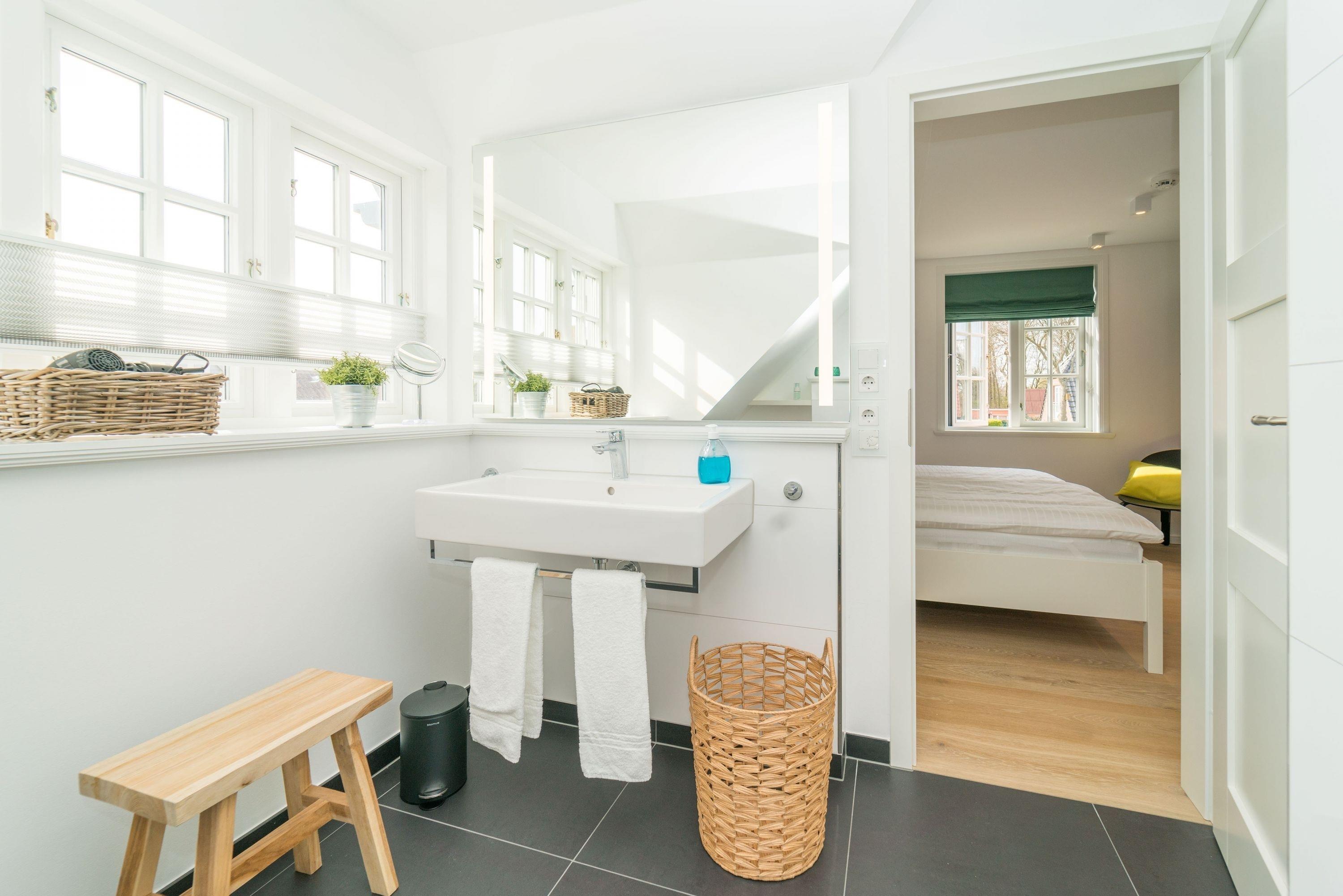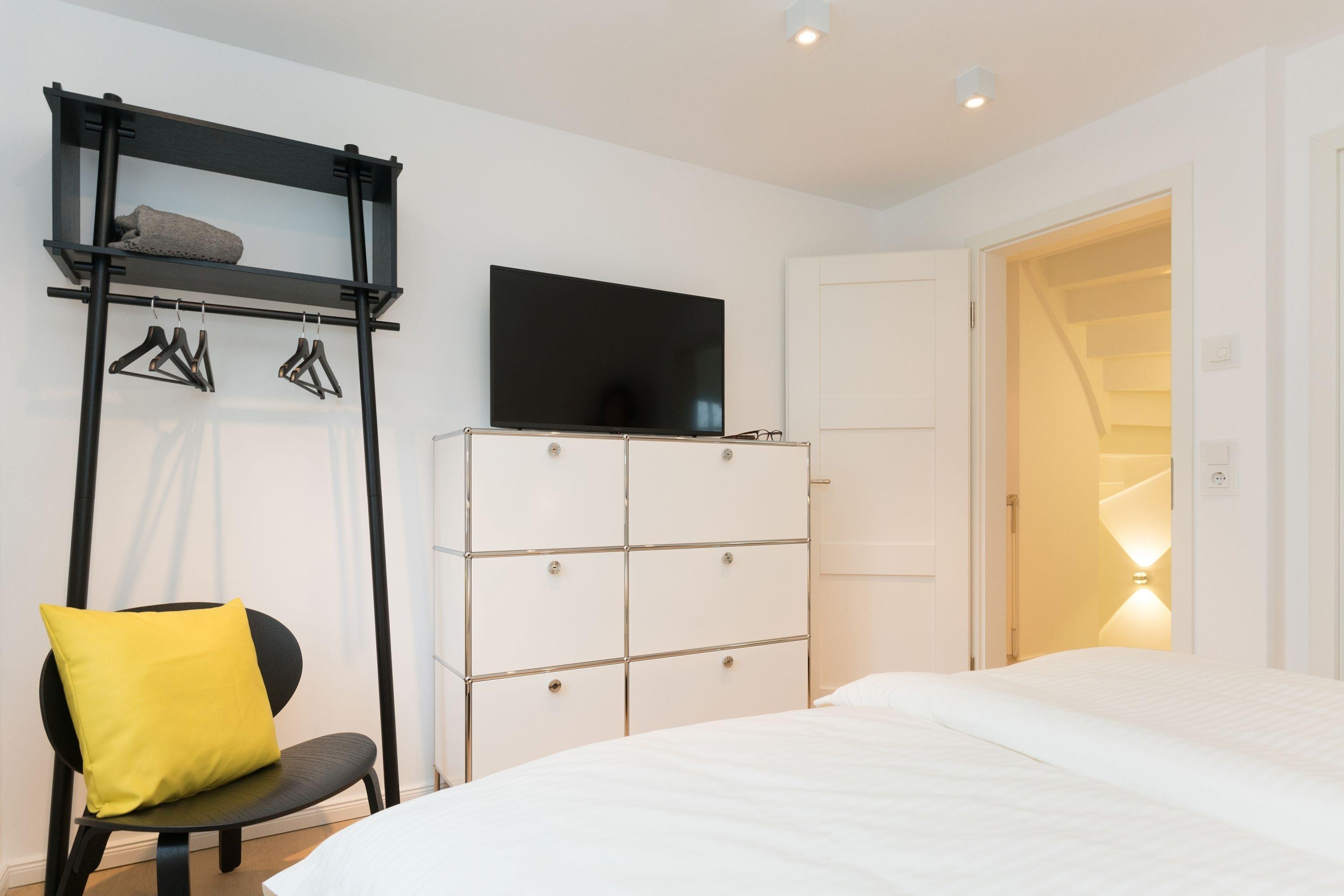 Ferienhaus "Leichte Brise" Meer, Sonne und immer eine leichte Brise - das ist Föhr und das ist die ruhig und zentral gelegene "Leichte Brise“ in Wyk. Moderne, klare Linien, nordische Leichtigkeit, massive Eichendielen und Designklassiker auf 105 qm über 3 Etagen als perfekte Urlaubsbasis für 4 Erwachsene und 1 Kleinkind (bis 3J.). Große Fensterflächen, Artemide und Gubi Leuchten schaffen lichtdurchflutete Räume. Im Erdgeschoss treffen USM Haller und Panton Stühle auf einen alten Eichentisch und eine Küche mit kompletter Ausstattung. Zwei gemütliche Sofas und ein moderner Ohrensessel sind die Relaxgrundlage für Fernsehabende, Lesestunden oder ein gutes Glas Wein am knisternden Kamin. Die Schlafzimmer jeweils mit Bettwäsche in Komfortgröße (155x220) und En-suite Bäder mit großer Dusche, versprechen Erholung im Schlaf. Und falls es im Urlaub doch mal eine E-Mail zu schreiben gibt, finden Sie einen kleinen Arbeitsplatz im Dachgeschoß. Die nach Süden ausgerichtete Terrasse mit großem Tisch und Standkorb schließt die Hausführung ab.