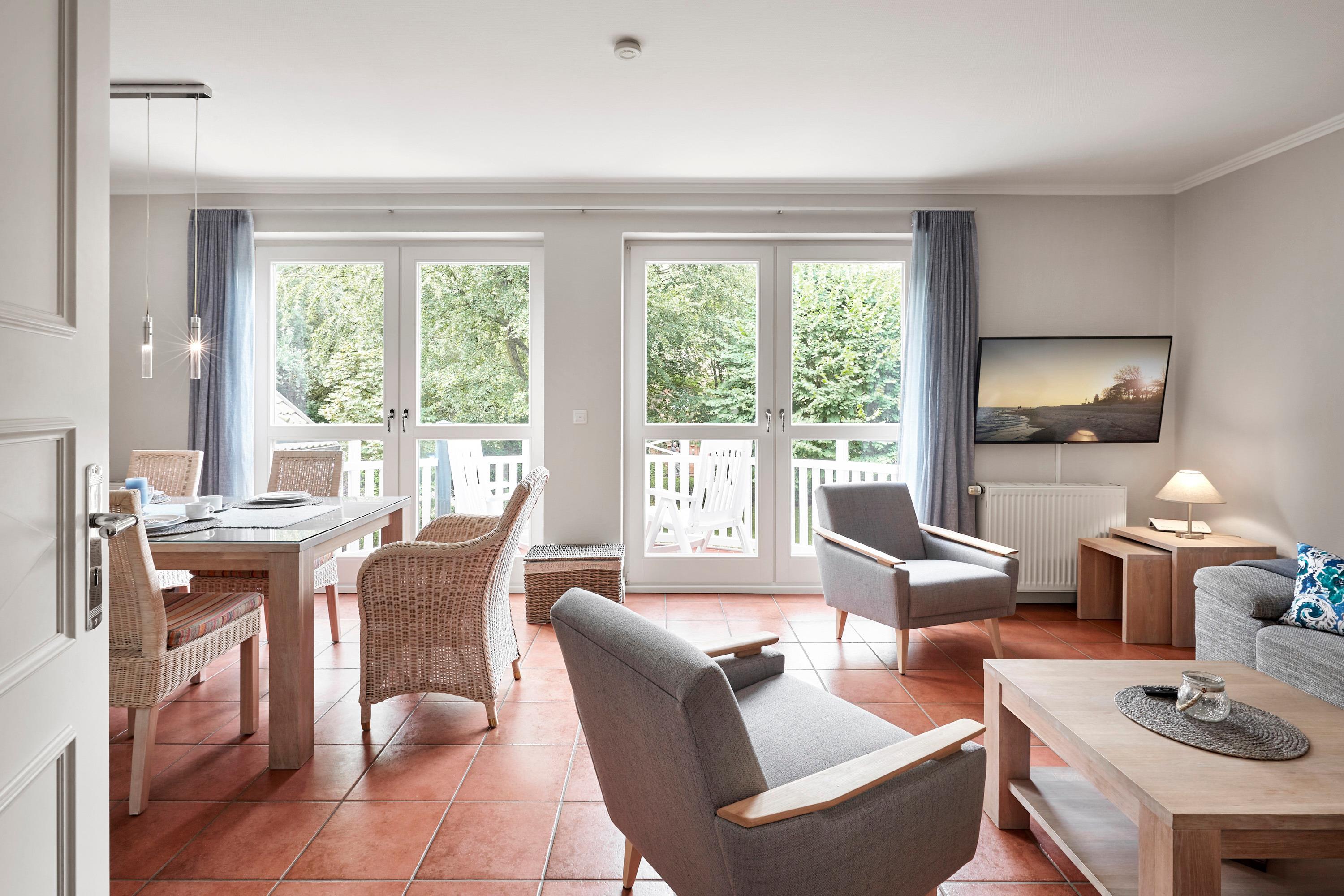 Die Ausstattung der Ferienwohnung hat alles was ein Urlaub mit der Familie braucht. Auf dem Balkon einen Kaffee oder ein Glas Wein genießen und in den alten Kurpark blicken.