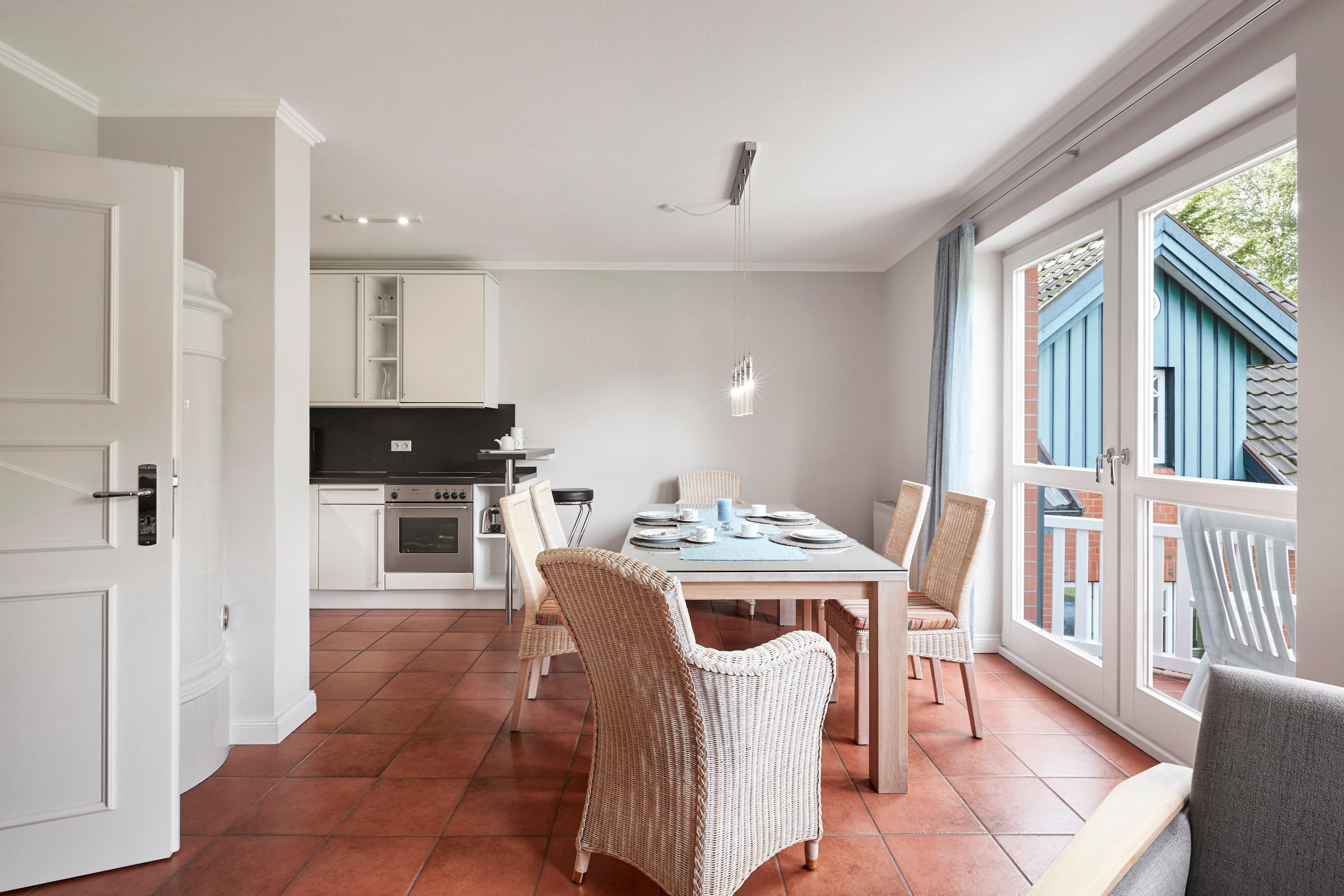 Besonders gemütlich wird es dank des Mylin Kachelofens und die offene Küche bietet Platz zum gemeinsamen Kochen und Essen.