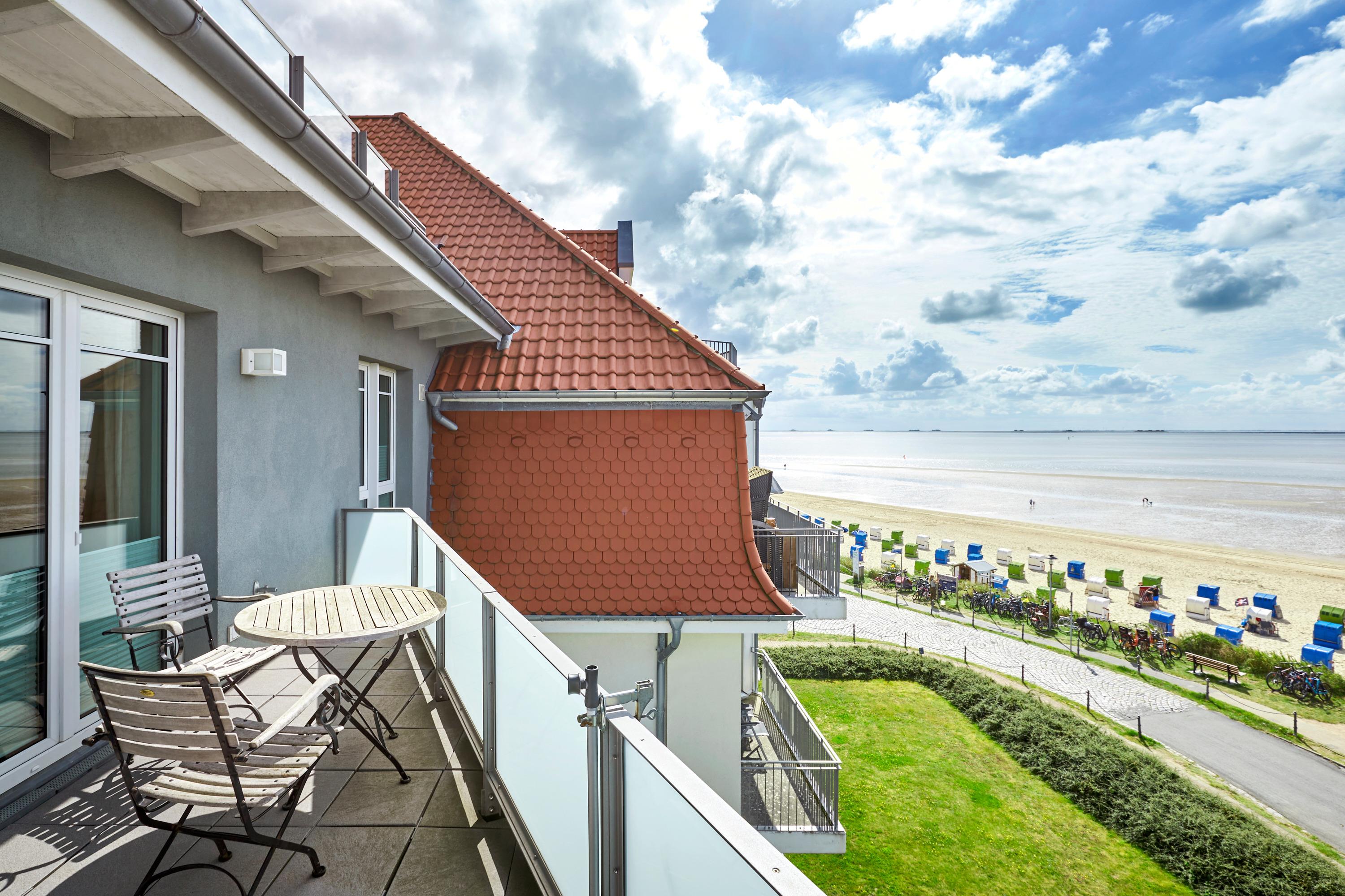 Wir begrüßen Sie im Schloß am Meer", der exklusiven Wohnanlage direkt am Wyker-Südstrand gelegen. Ihre Wohnung liegt im Staffelgeschoss hinter der historischen Fassade, welche beim Neubau erhalten wurde. Hier haben Sie eine Dachterrasse nach Süden gelegen ganz für sich allein und einen Blick auf die Nordsee und die Halligen. Dieser einzigartige Panoramablick ist unvergesslich. In nur wenigen Schritten befinden Sie sich auf der Promenade, die Sie ins Herz von Wyk führt. Hier laden Geschäfte zum Bummeln ein, Cafes und Restaurants verwöhnen Sie mit kulinarischen Köstlichkeiten."