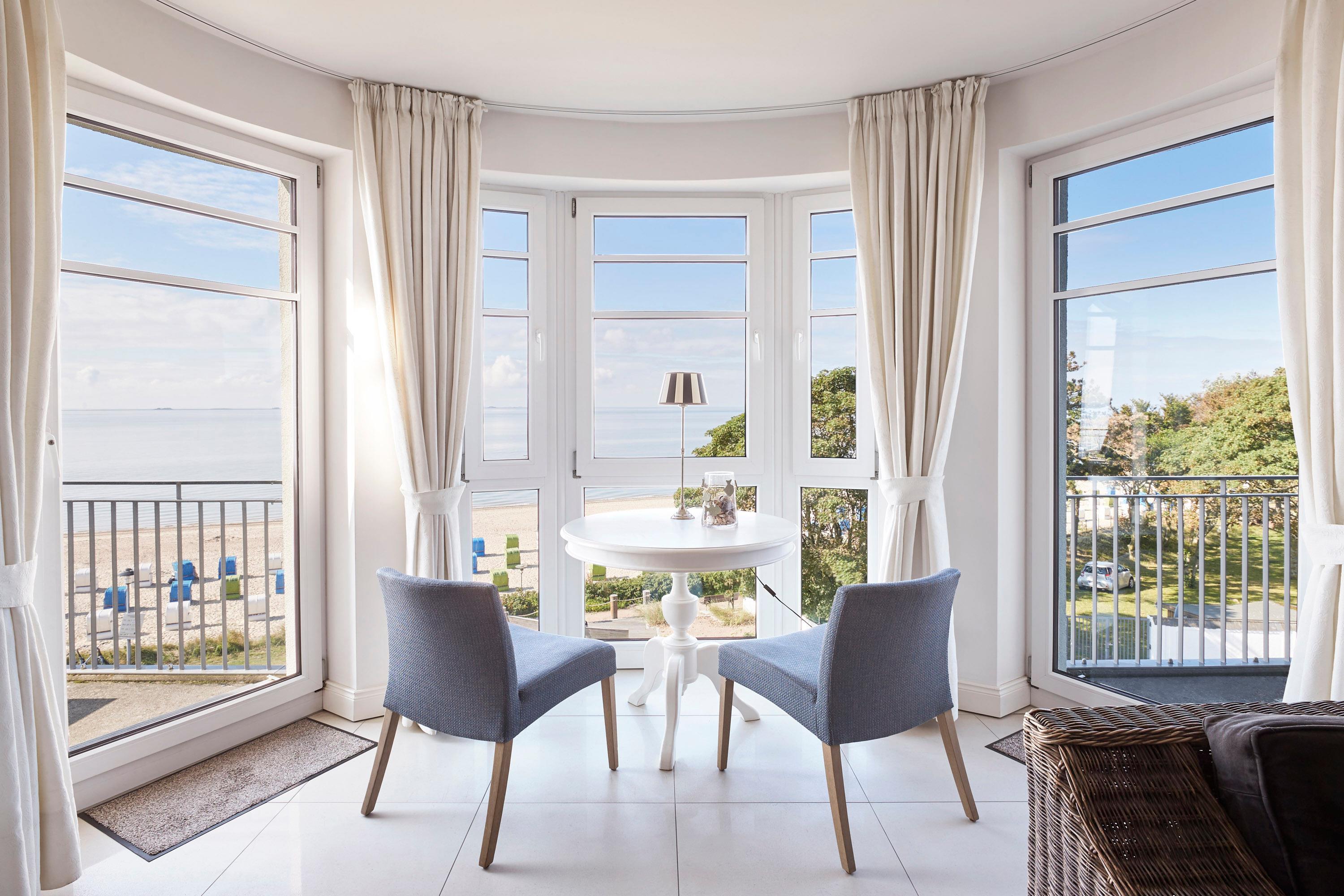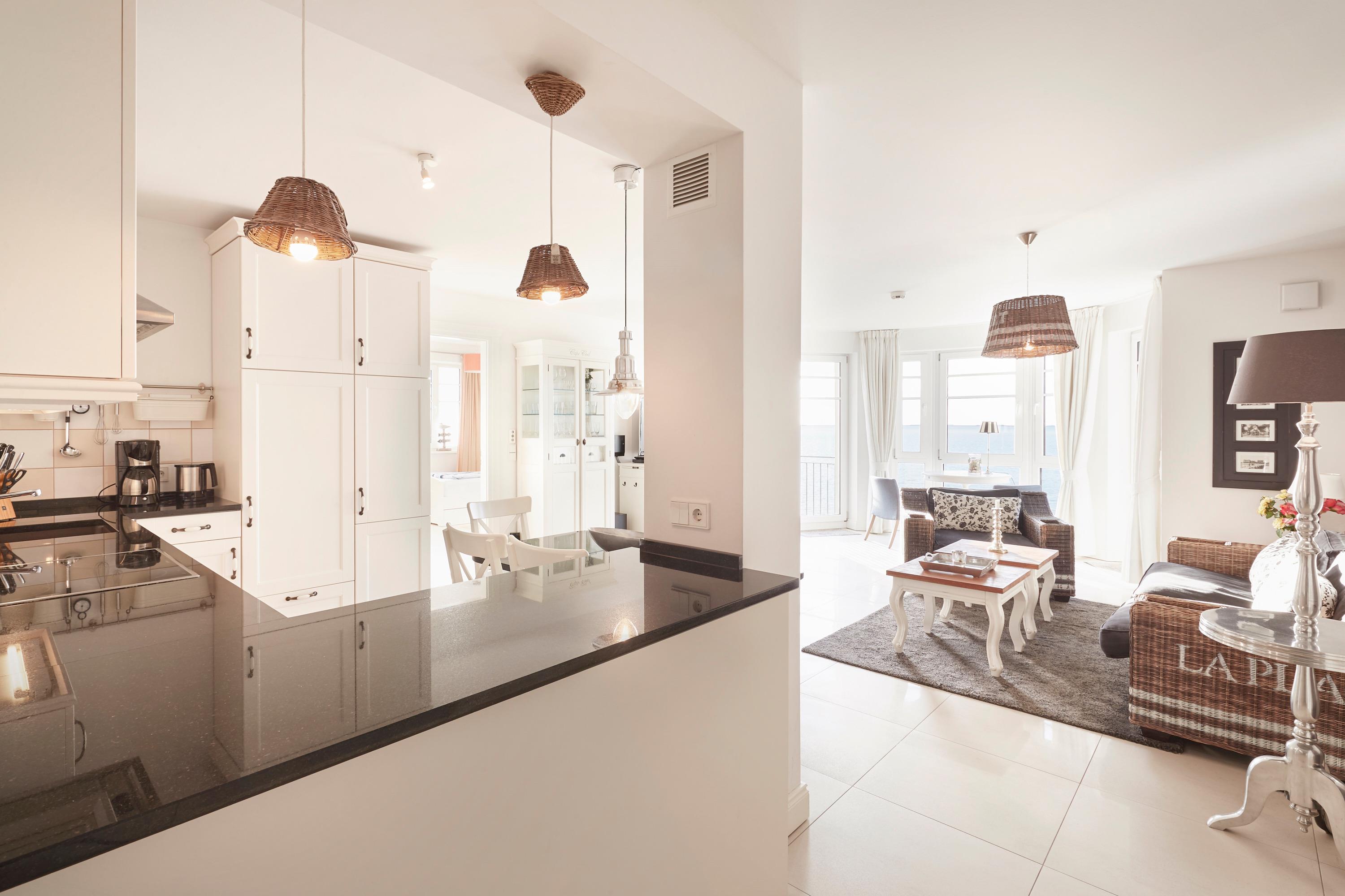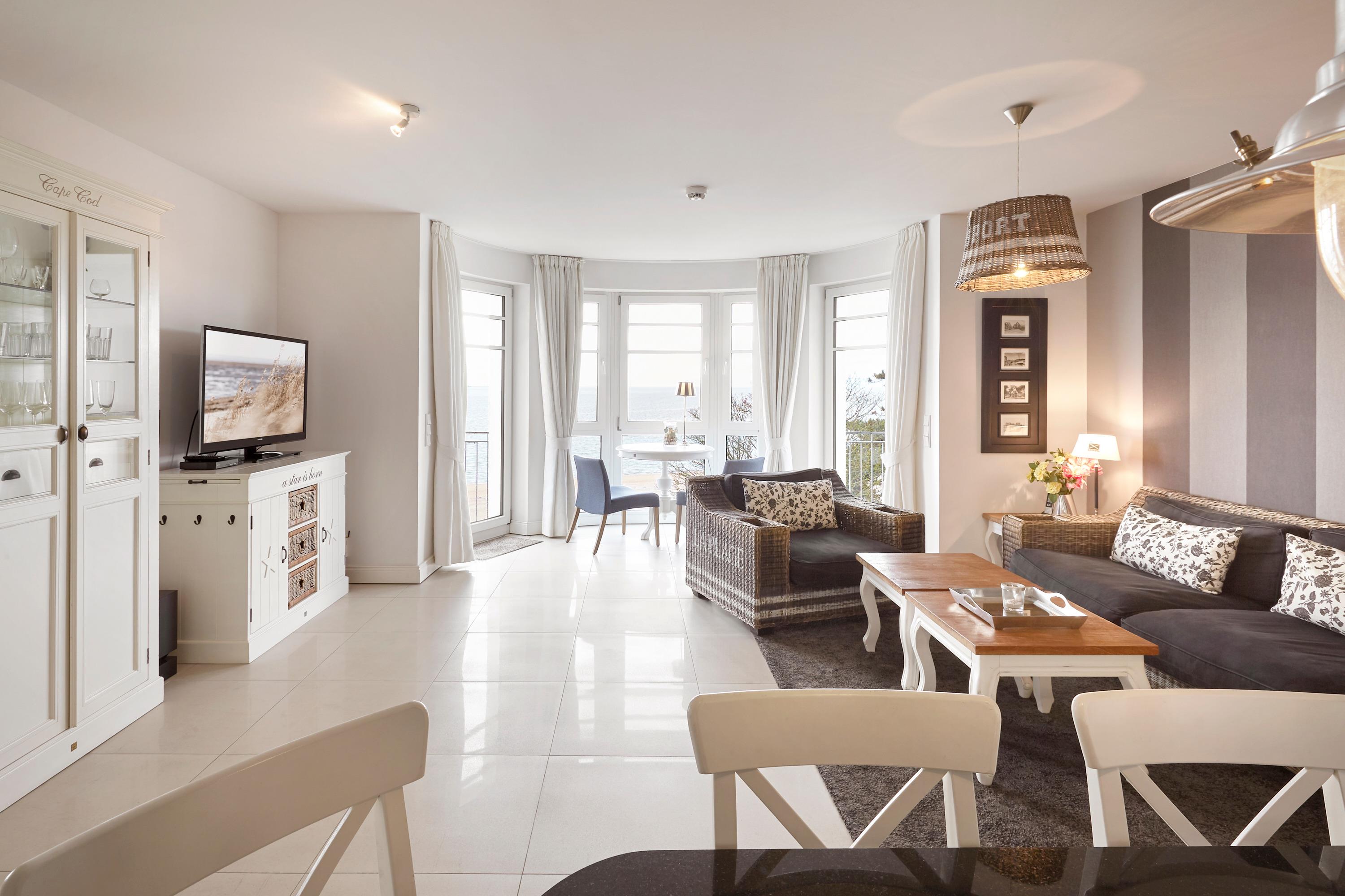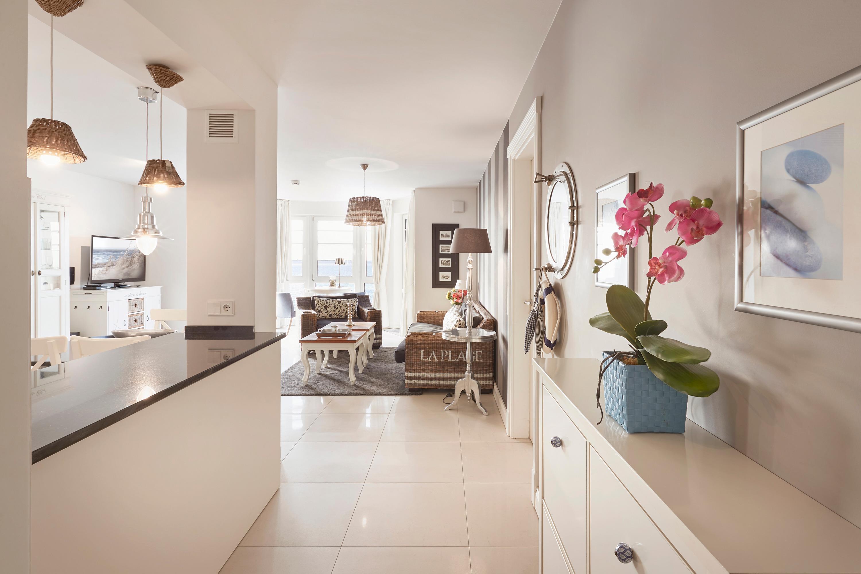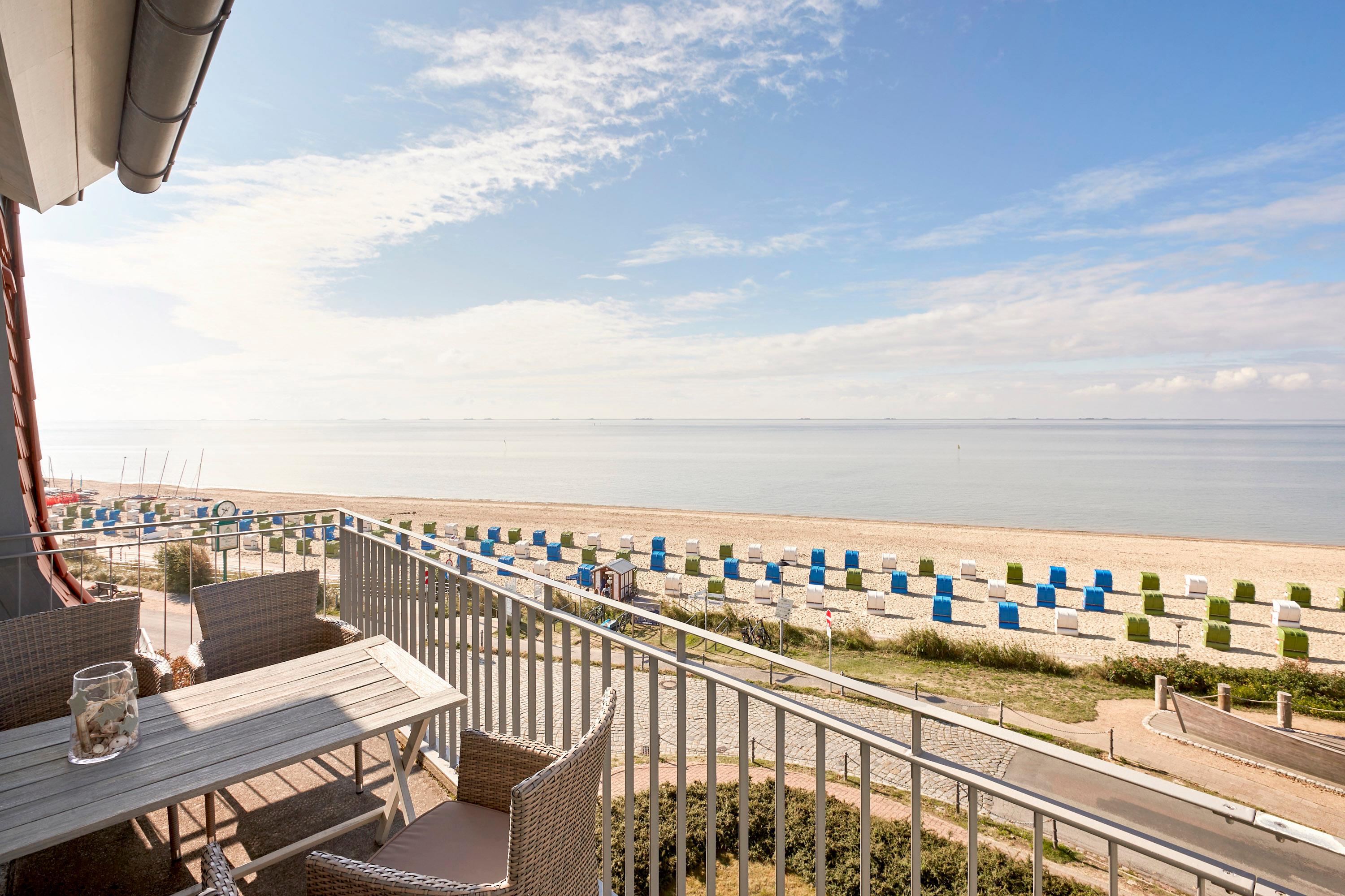 Wir begrüßen Sie im "Schloß am Meer", der exklusiven Wohnanlage direkt am Wyker-Südstrand. Ihre Wohnung liegt im 3. Obergeschoss hinter der historischen Fassade, welche beim Neubau erhalten wurde. Hier laden zwei Balkone ein, den Blick auf die Nordsee und die Halligen zu genießen. Ein einzigartiger Panoramablick erwartet Sie. Genießen Sie die Sonne schon beim Frühstück! In nur wenigen Schritten befinden Sie sich auf der Promenade, die Sie ins Herz von Wyk führt. Hier laden Geschäfte zum Bummeln ein, in Cafes und Restaurants werden Sie mit kulinarischen Köstlichkeiten verwöhnt.