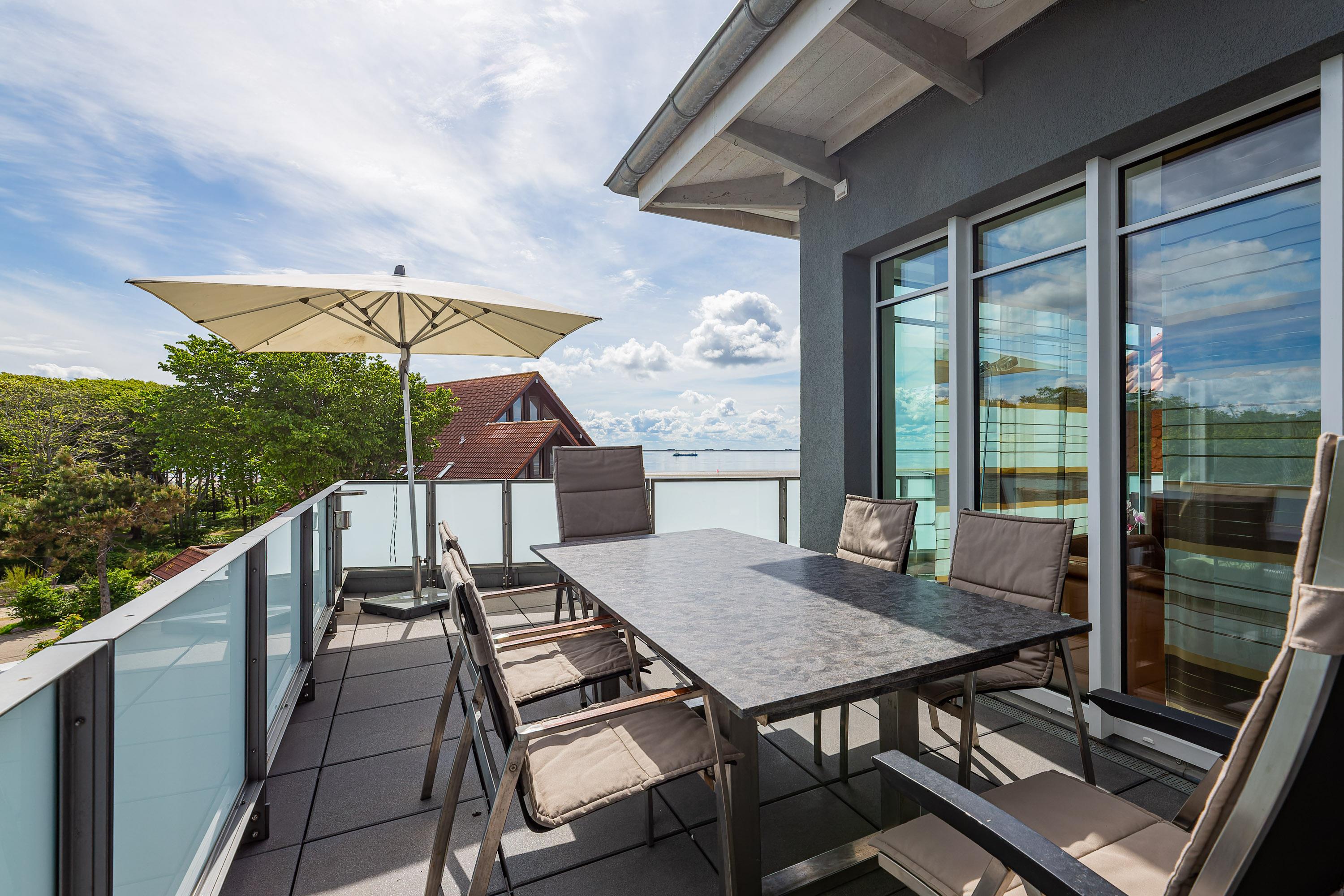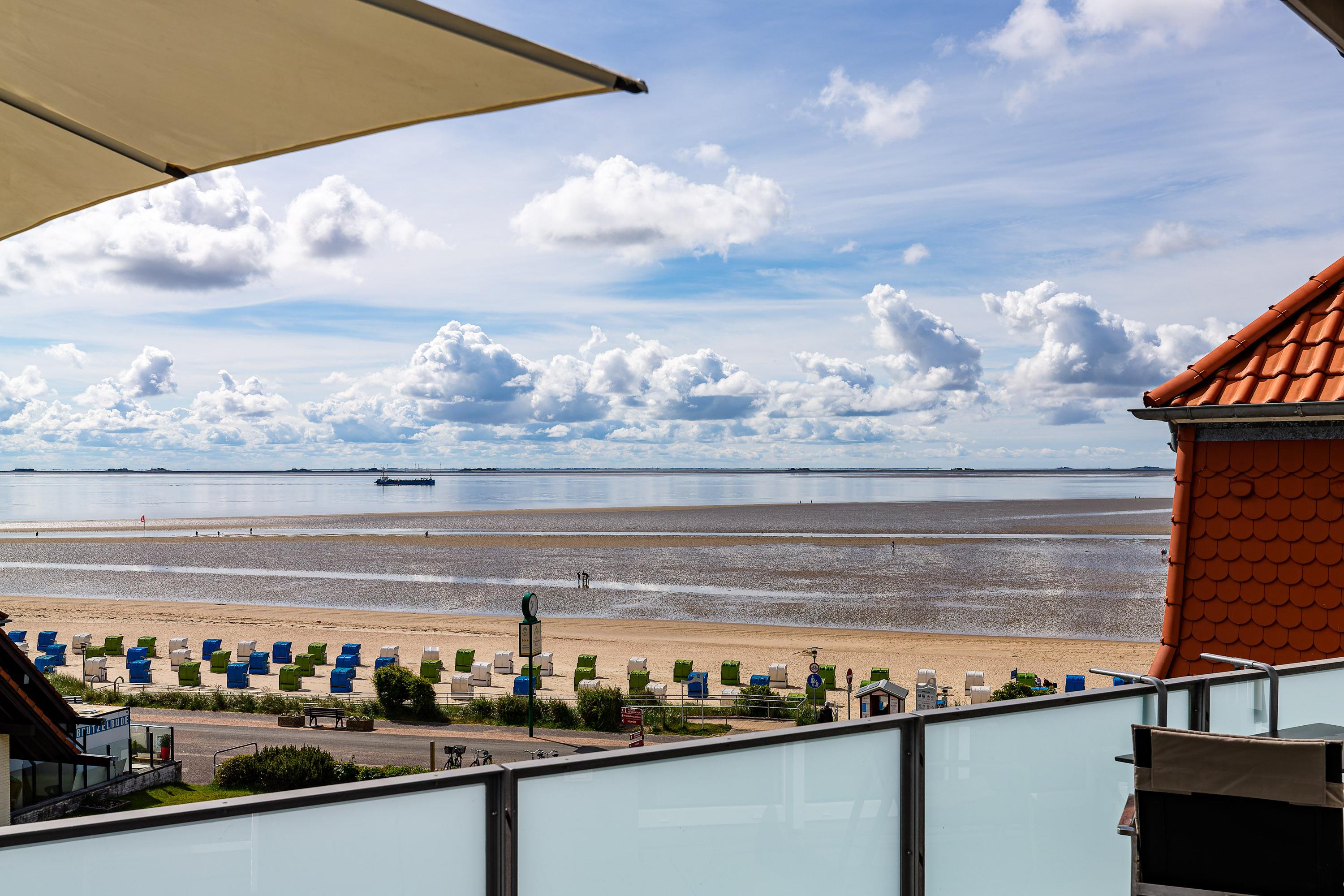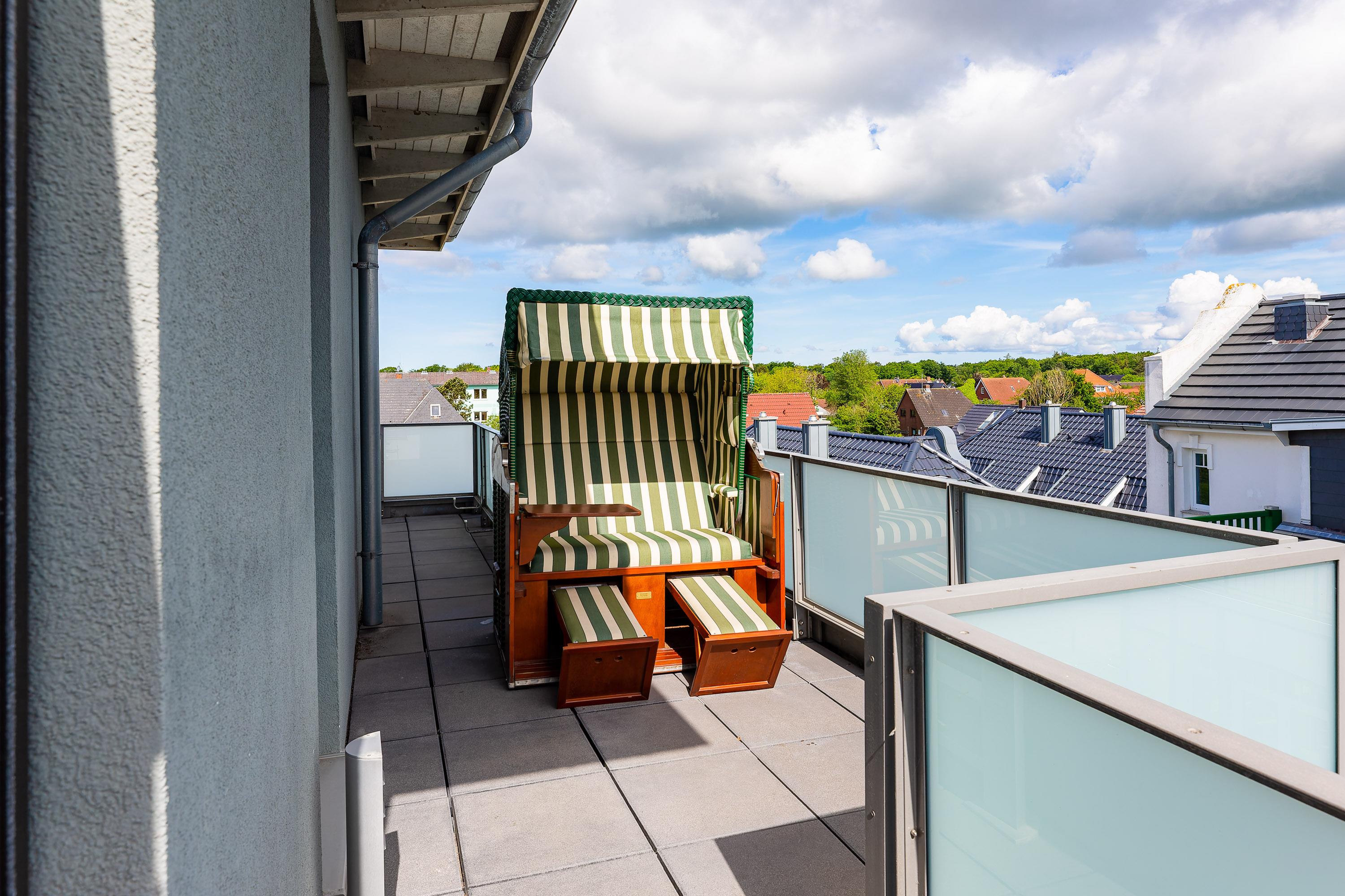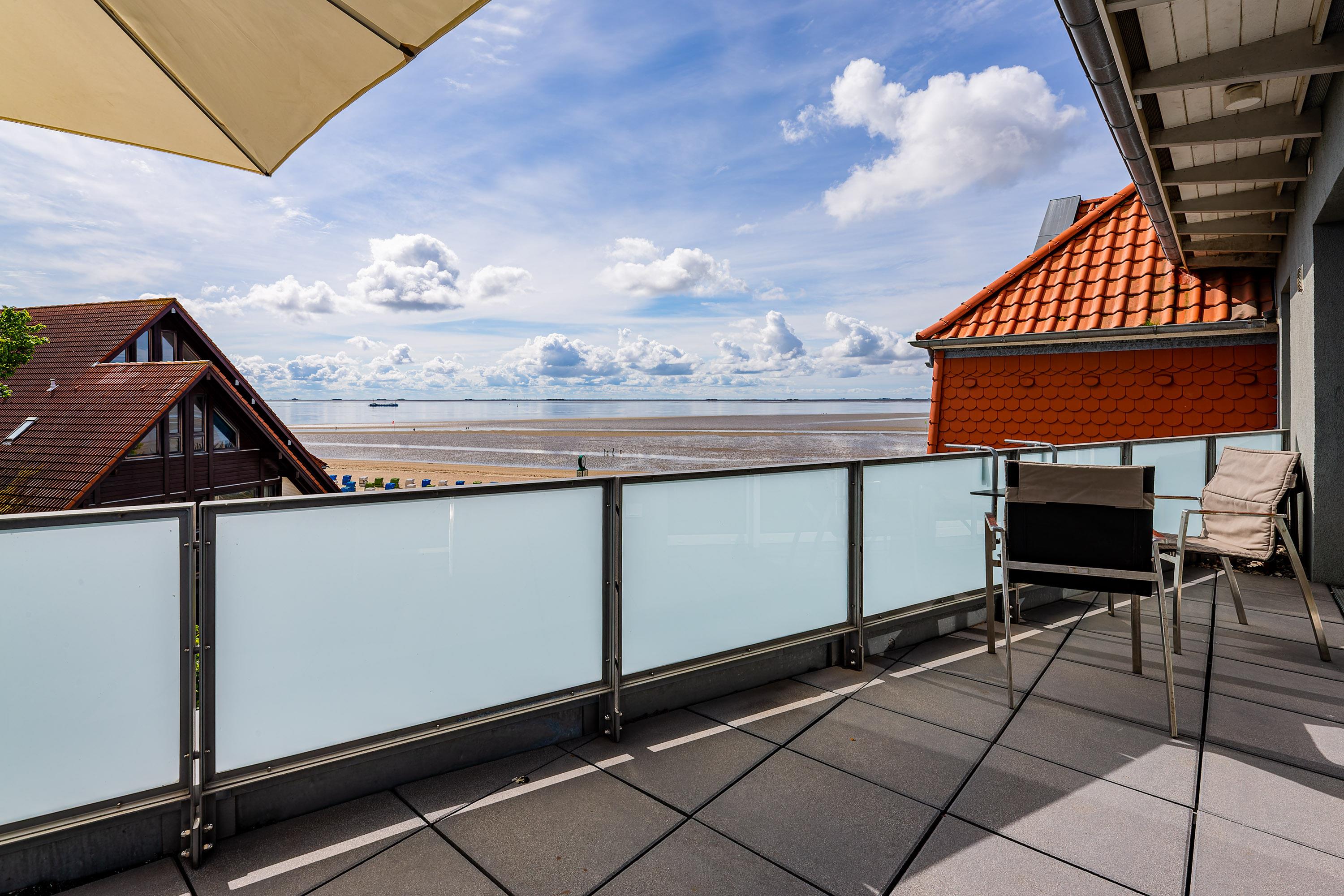 Wir begrüßen Sie im Schloß am Meer, der exklusiven Wohnanlage direkt am Wyker Südstrand gelegen. Ihre Wohnung liegt im Staffelgeschoss. Hier haben Sie eine große Dachterrasse für sich und einen Blick auf die Nordsee und die Halligen. Dieser einzigartige Panoramablick ist unvergesslich. Genießen Sie die Sonne schon beim Frühstück! In nur wenigen Schritten befinden Sie sich auf der Promenade, die Sie ins Herz von Wyk führt. Hier laden Geschäfte zum Bummeln ein und in Cafés und Restaurants werden Sie mit kulinarischen Köstlichkeiten verwöhnt