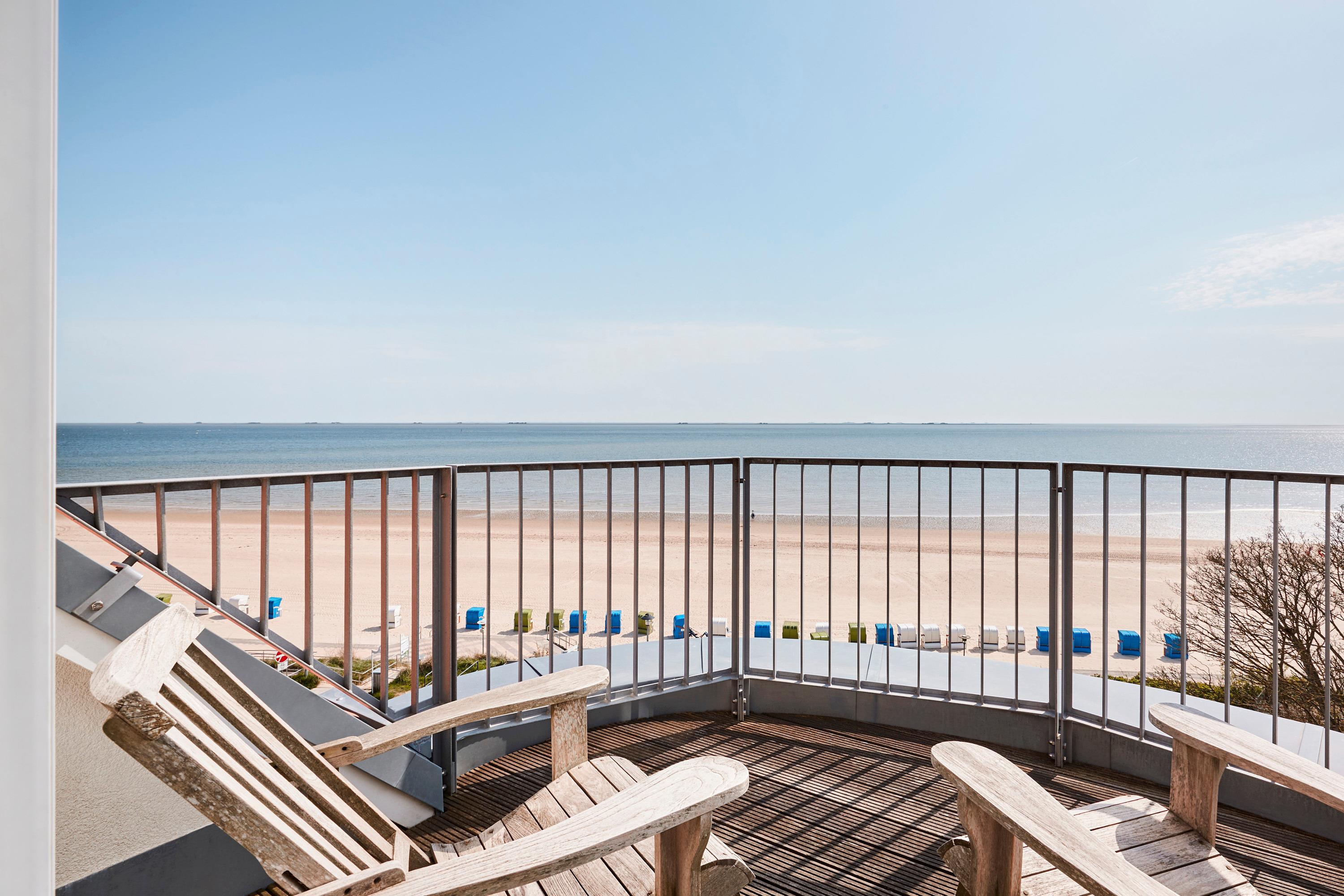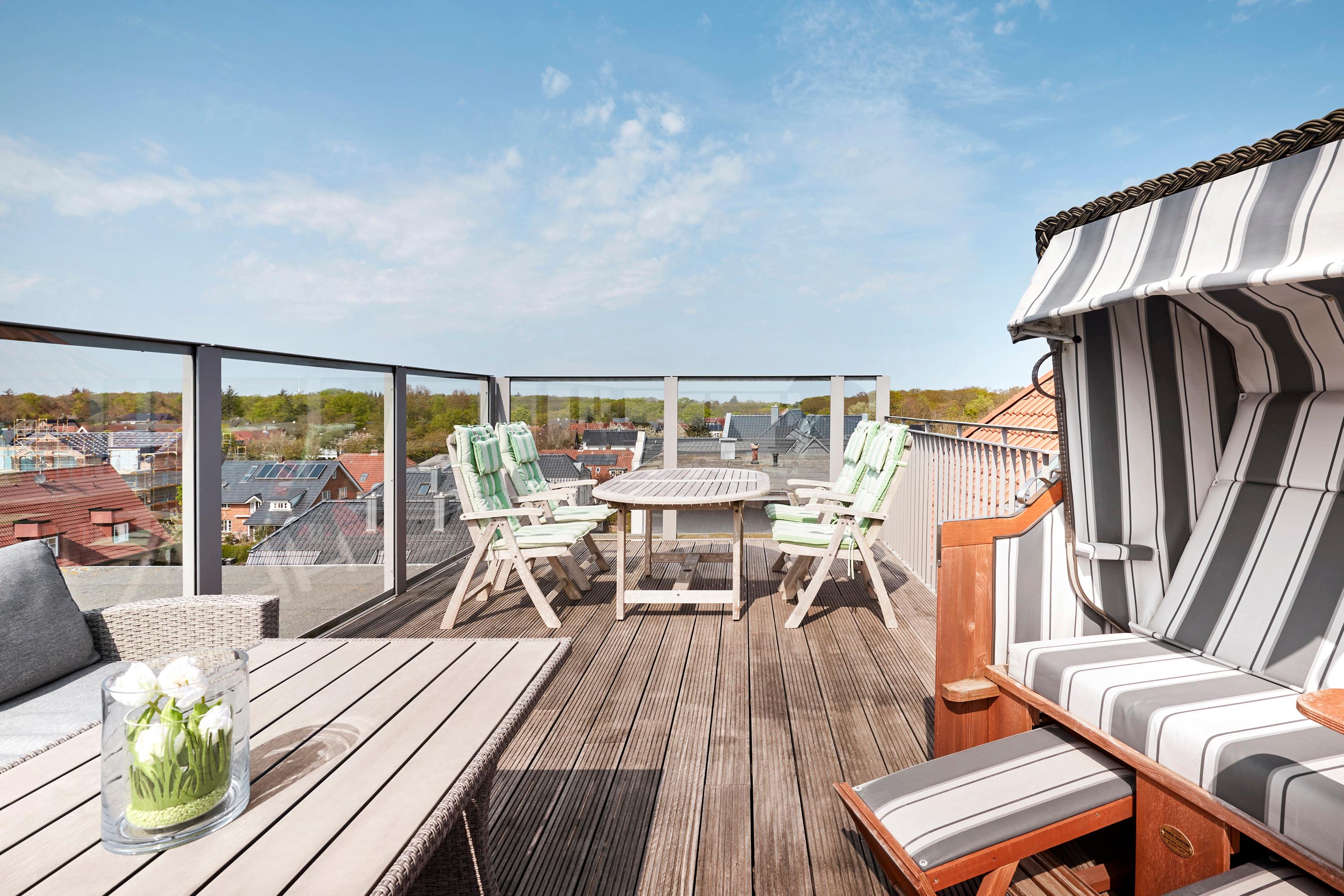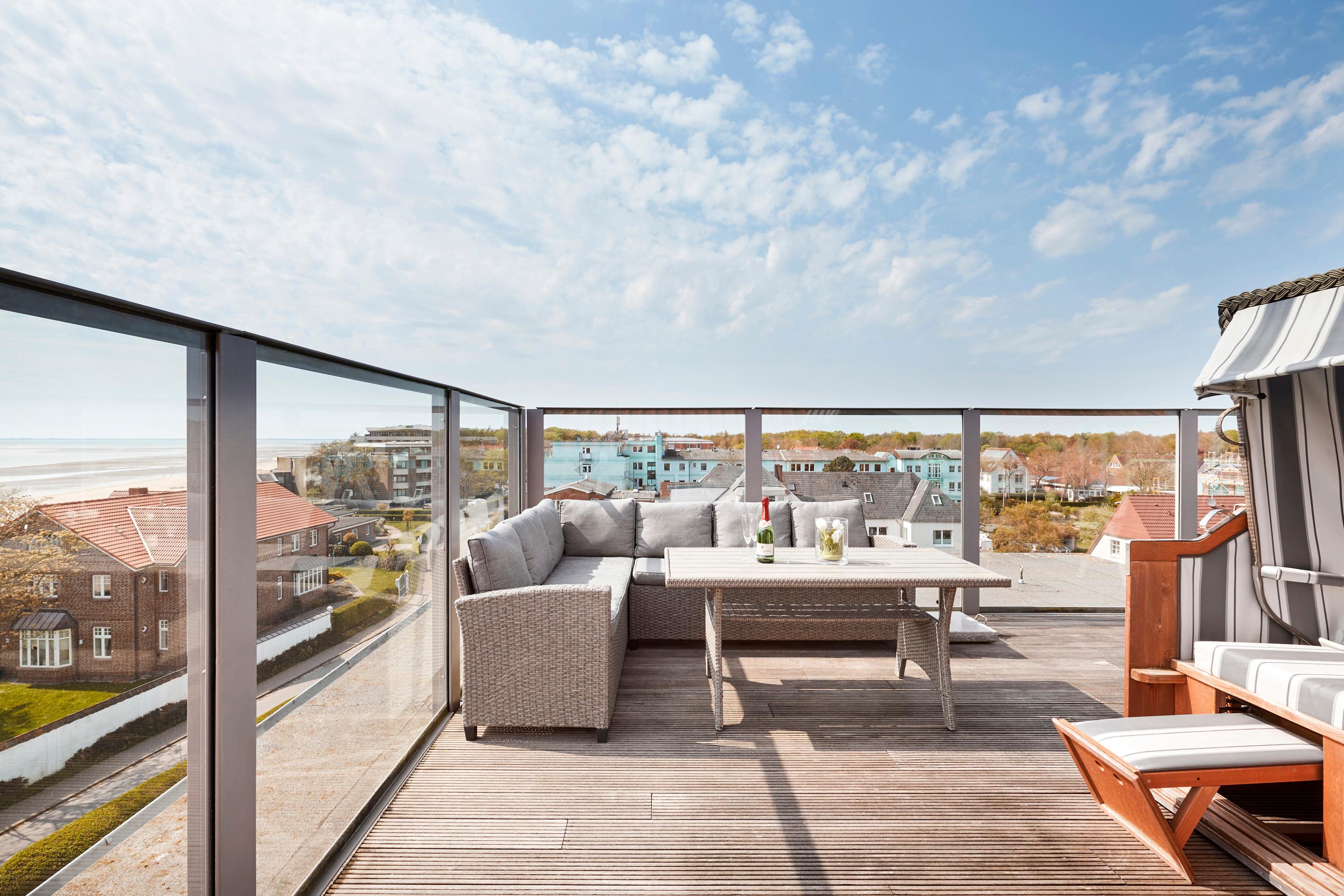 Wir begrüßen Sie im Schloss am Meer, der exklusiven Wohnanlage direkt am Wyker Südstrand. Ihre Penthouse Wohnung liegt im 4. Obergeschoss hinter der historischen Fassade, welche beim Neubau erhalten wurde. Hier laden zwei Dachterrassen und eine Loggia ein, den Blick auf die Nordsee und Halligen zu genießen. Ein einzigartiger Panoramablick erwartet Sie. Genießen Sie die Sonne schon beim Frühstück! In nur wenigen Schritten befinden Sie sich auf der Promenade, die Sie ins Herz von Wyk führt. Hier laden Geschäfte zum Bummeln ein, in Cafés und Restaurants werden Sie mit kulinarischen Köstlichkeiten verwöhnt.